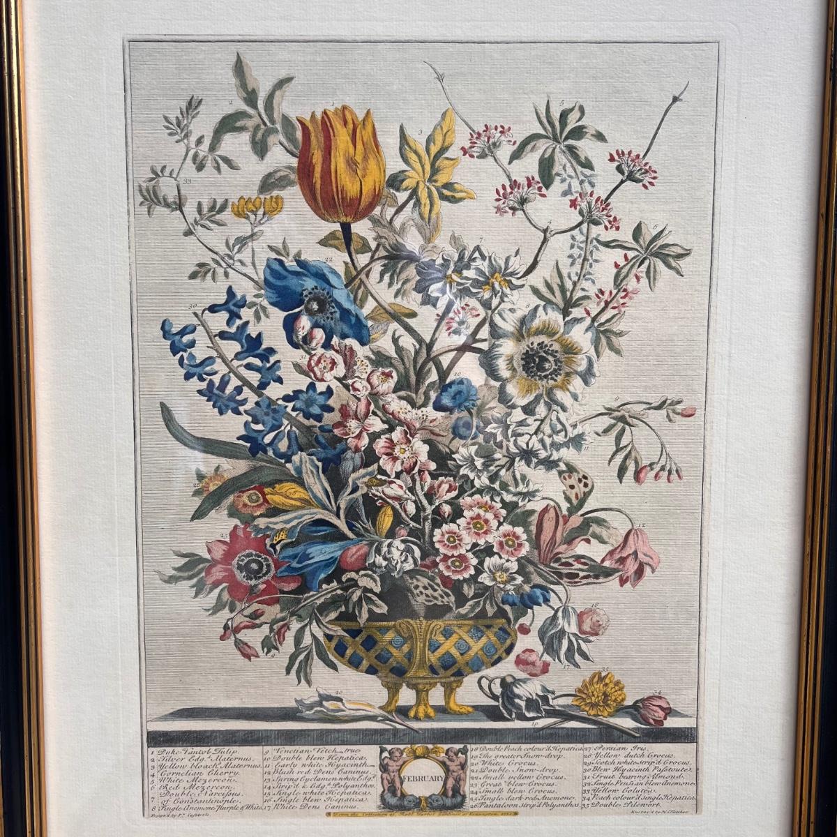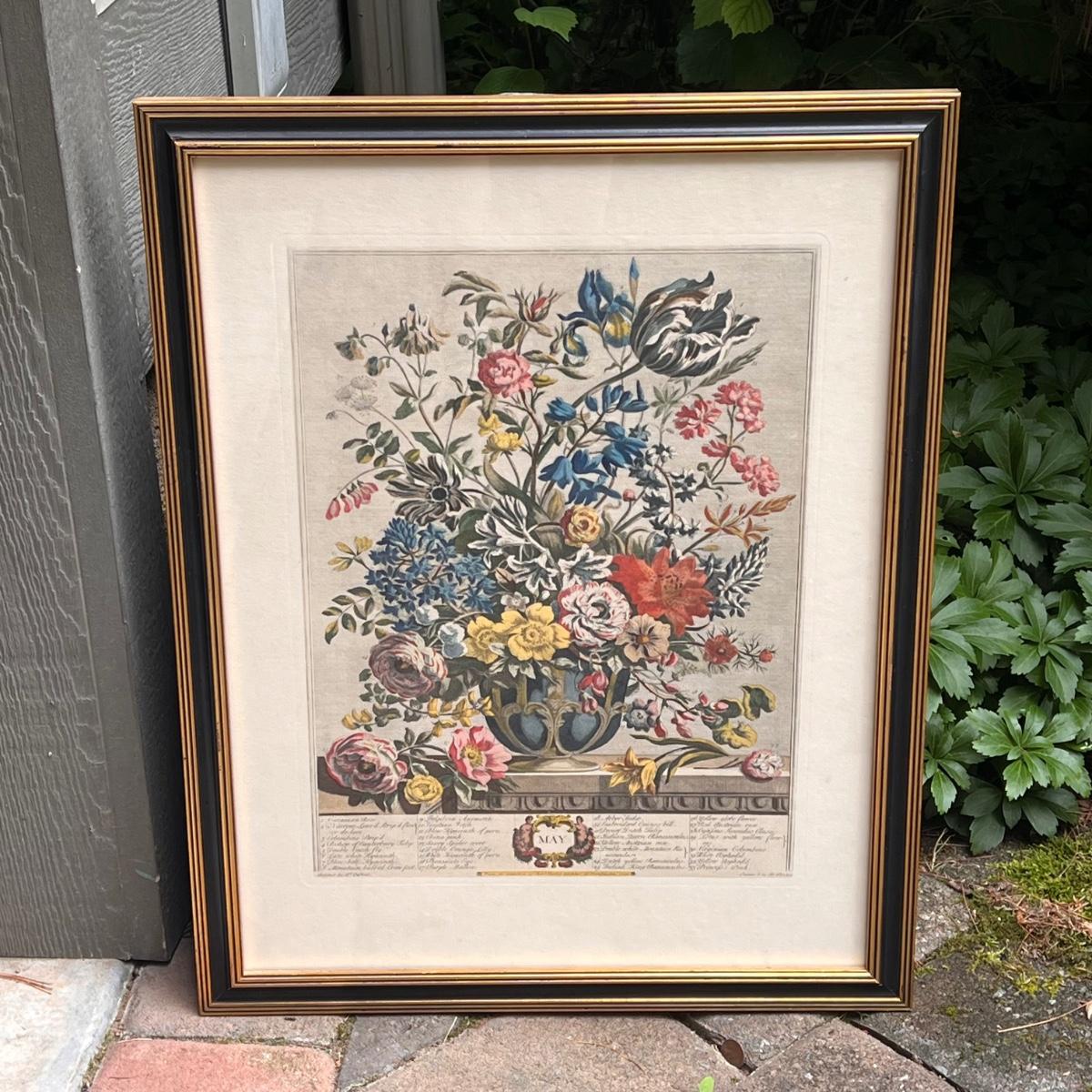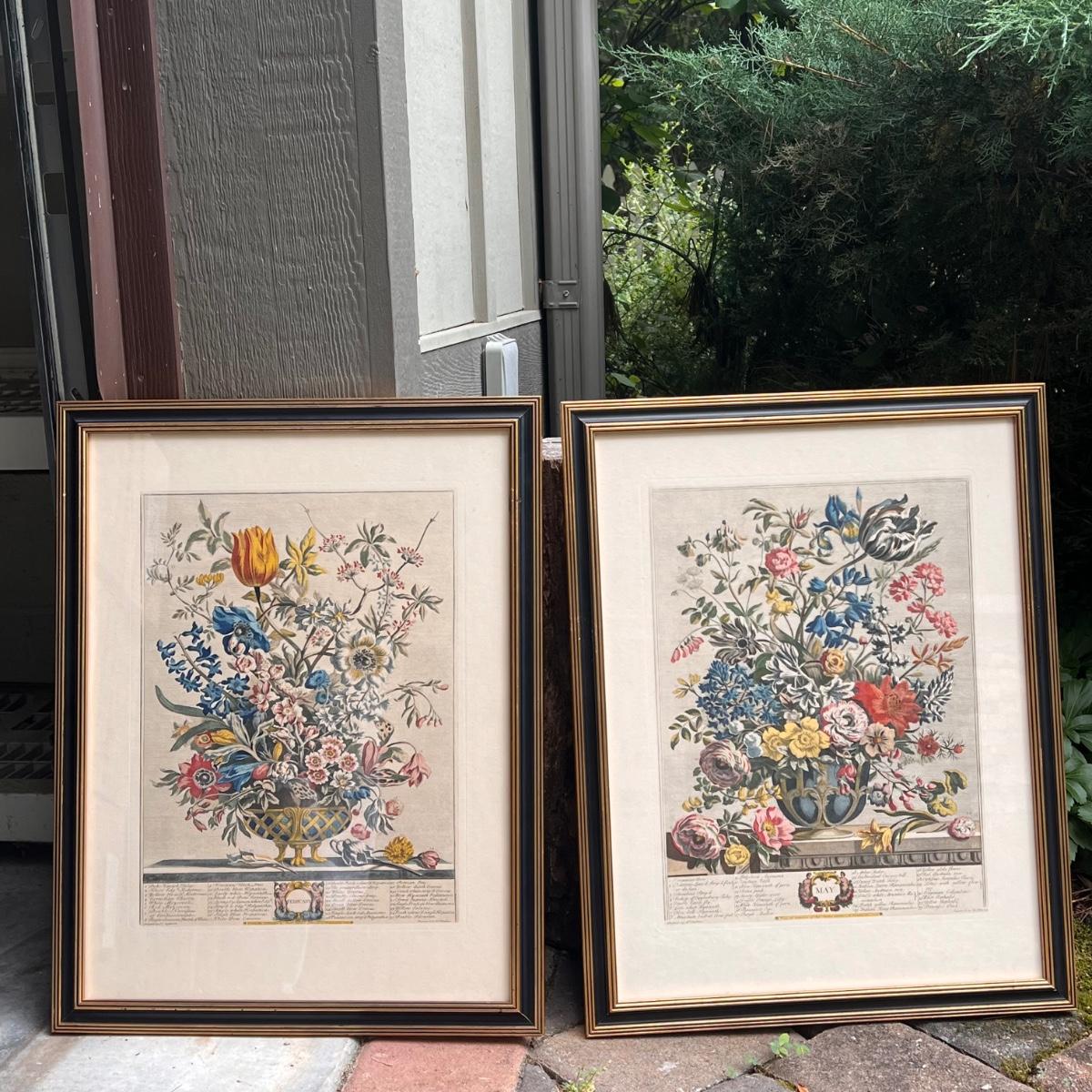 Lot includes two February and May floral prints. They both are protected in a wooden frame that has been painted black and gold and a glass covering. Both prints in their frames measure 18” x 23”H. Shipping available. Shipping can be costly. We suggest contacting our preferred local shipping provider, Postage Express, with dimensions and getting an estimate before bidding: 828-255-9250 or shipping@postageexpressnc.com