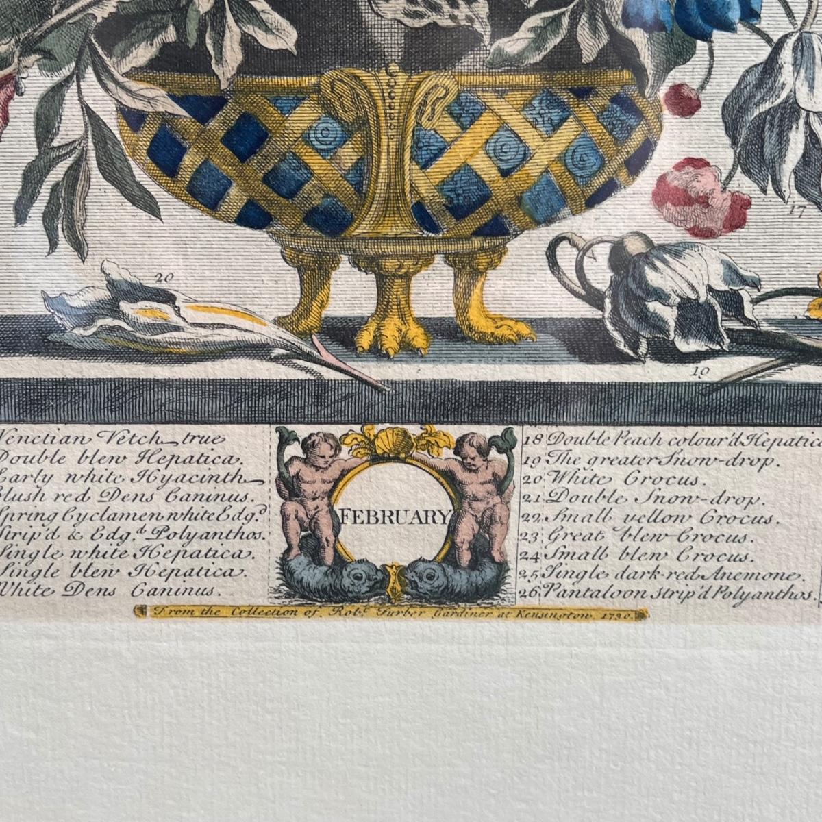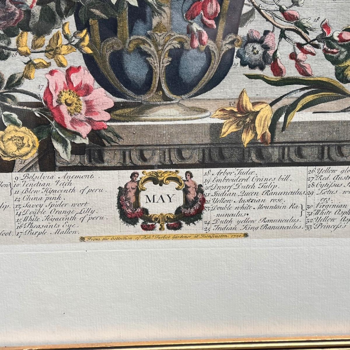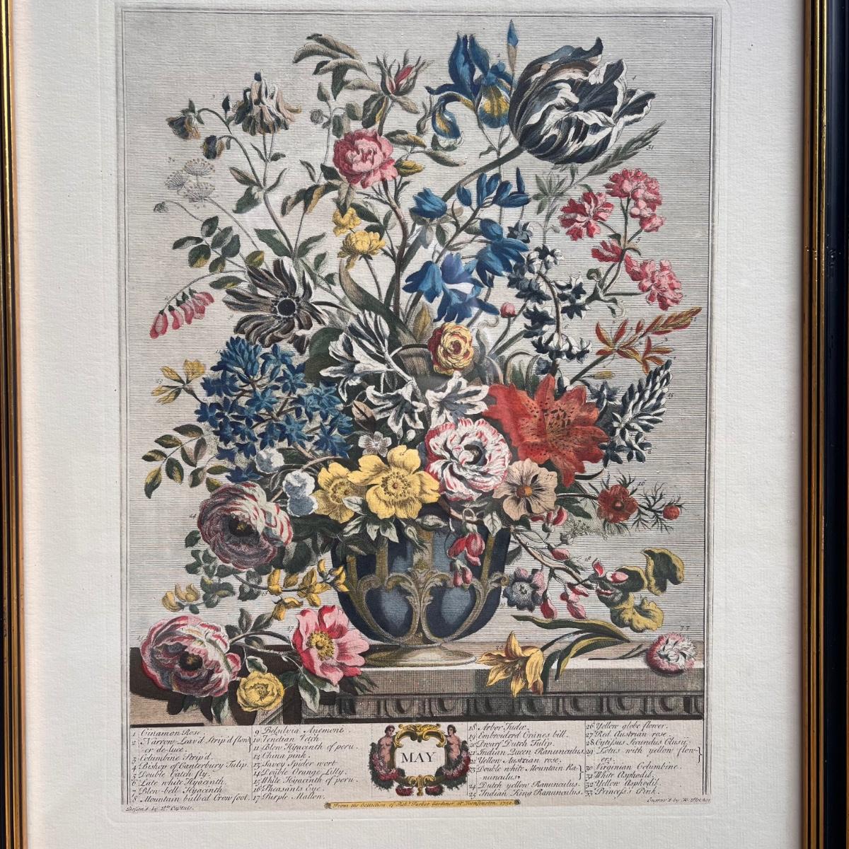 Lot includes two February and May floral prints. They both are protected in a wooden frame that has been painted black and gold and a glass covering. Both prints in their frames measure 18” x 23”H. Shipping available. Shipping can be costly. We suggest contacting our preferred local shipping provider, Postage Express, with dimensions and getting an estimate before bidding: 828-255-9250 or shipping@postageexpressnc.com