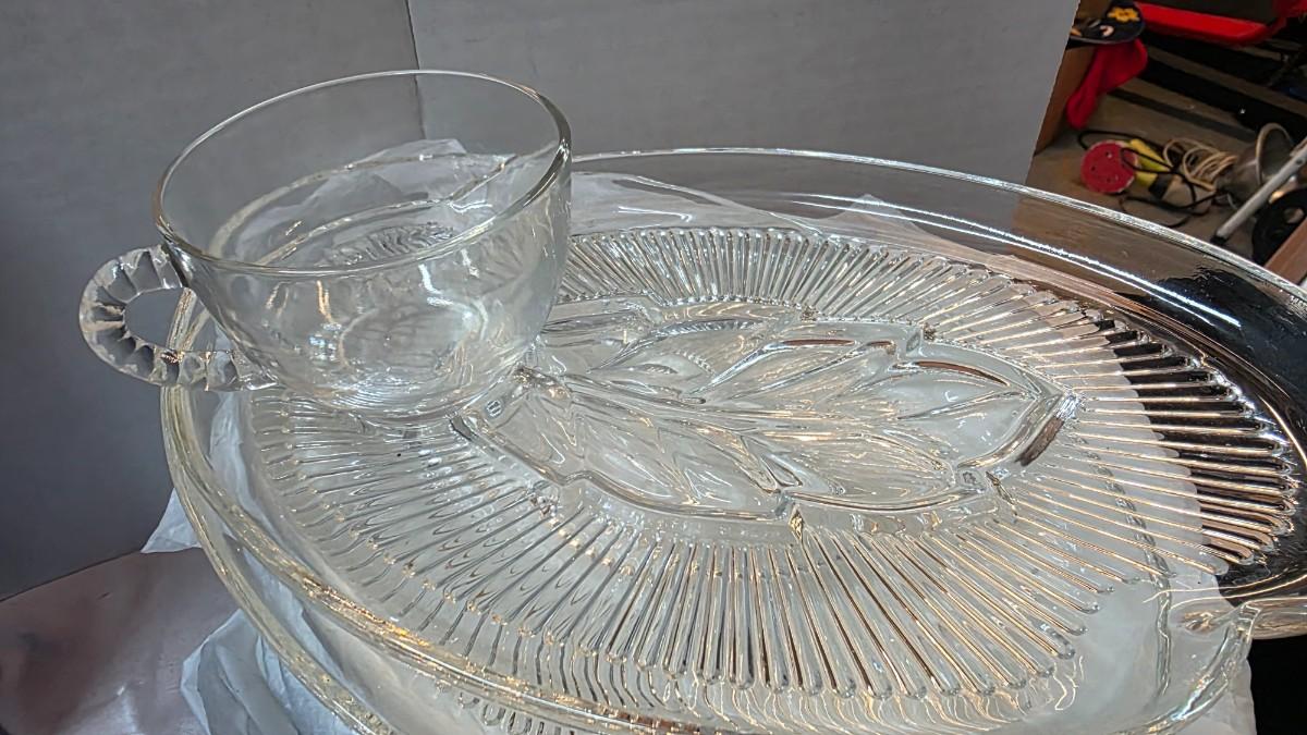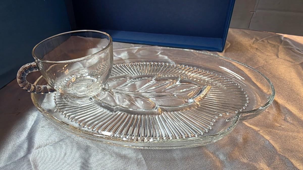 This pattern is widely associated with Federal Glass and is commonly recognized by collectors as the “Crystal Leaf” design, originally produced for a 1959 commemorative promotion. The styling is unmistakably mid-century, with elegant clarity and a purpose-built pairing that was made for easy serving at the table. Whether you’re building a vintage glassware collection, setting up a dedicated tea-and-dessert moment, or styling a shelf with true period-correct pieces, this set brings authentic vintage presence without needing extra filler.