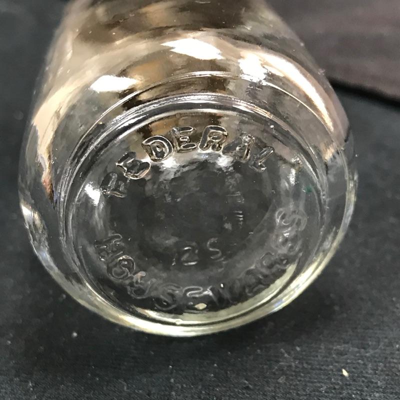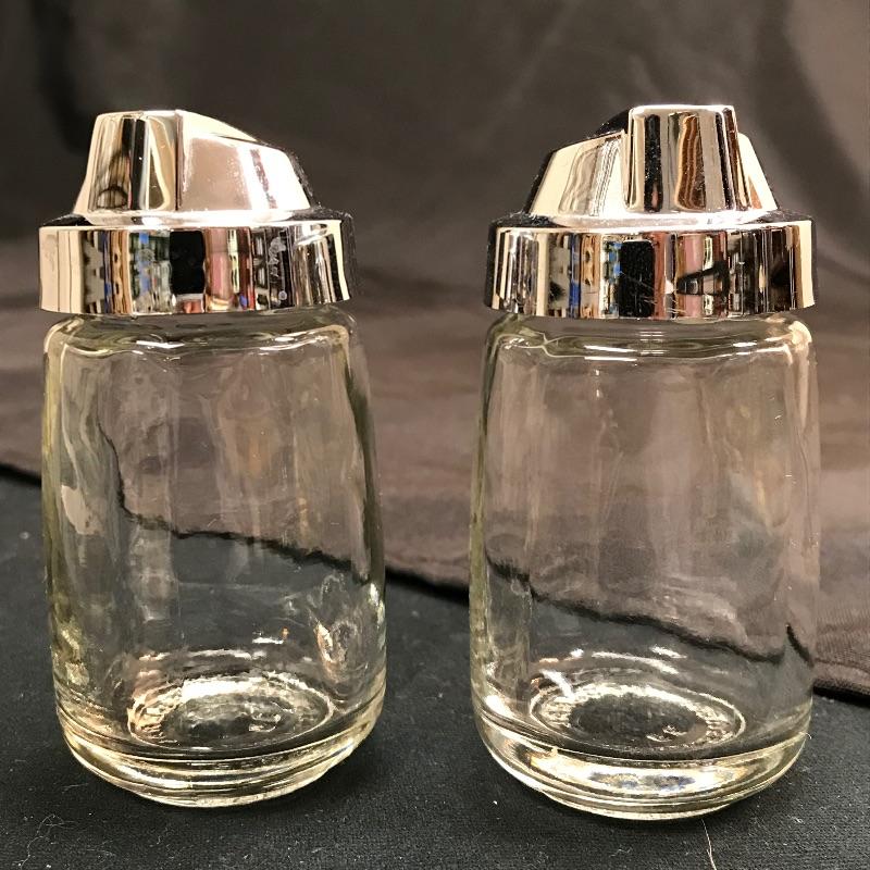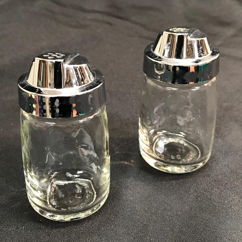 One set of glass salt and pepper shakers by federal housewares. The dispenser lids are unmarked so you could also store nutmeg sugar, creamer etc.