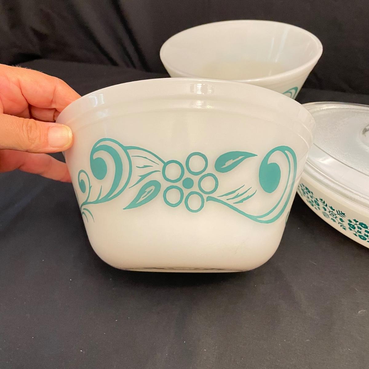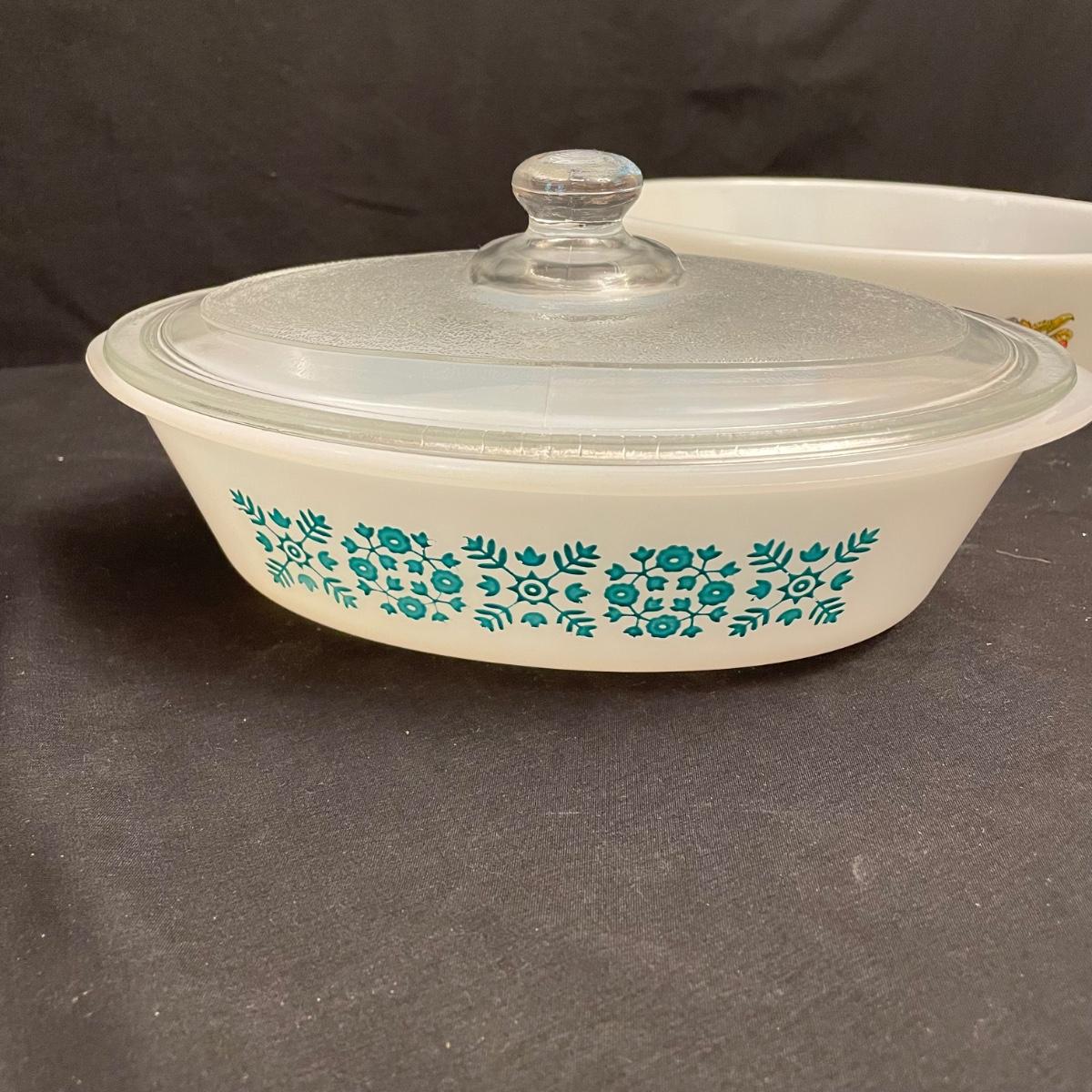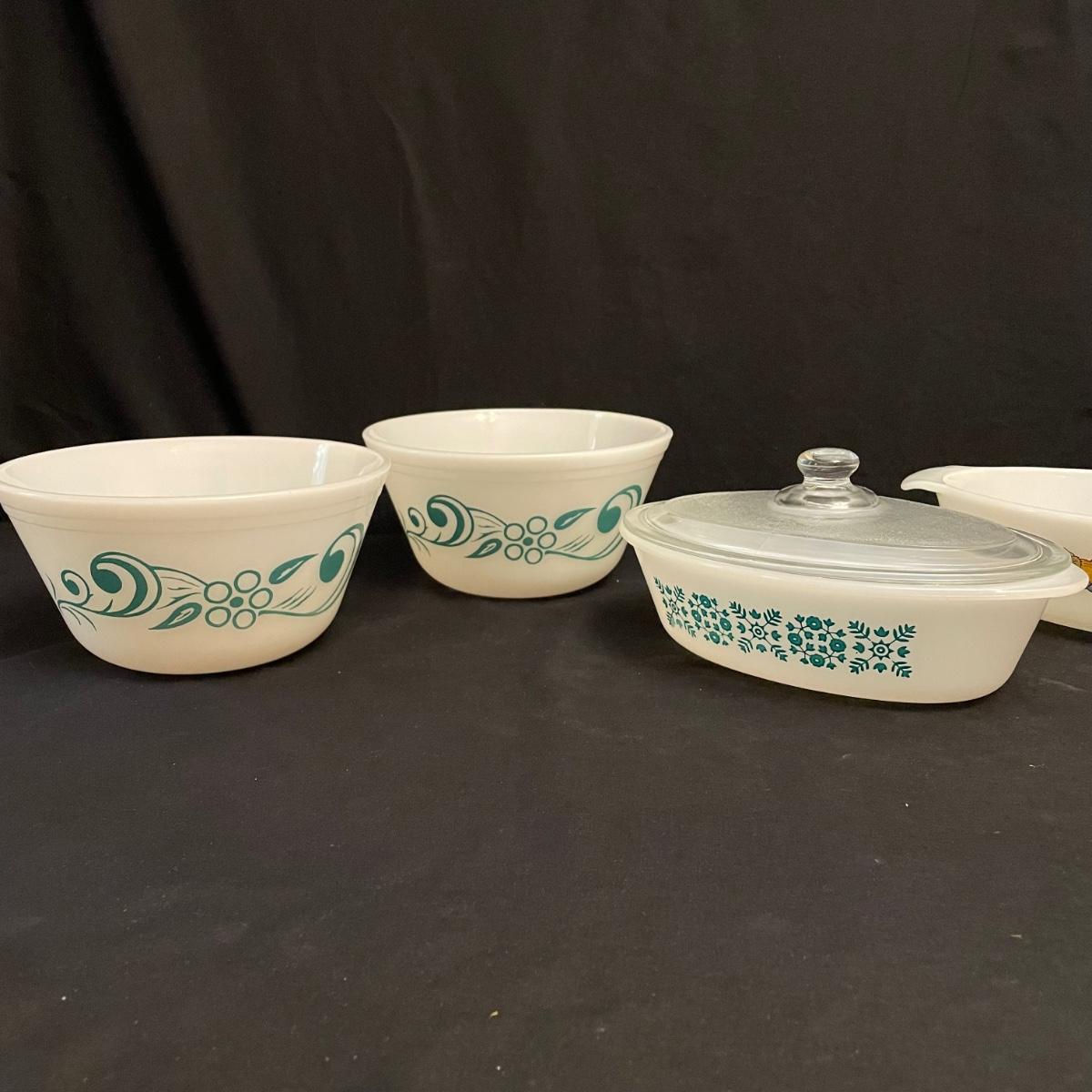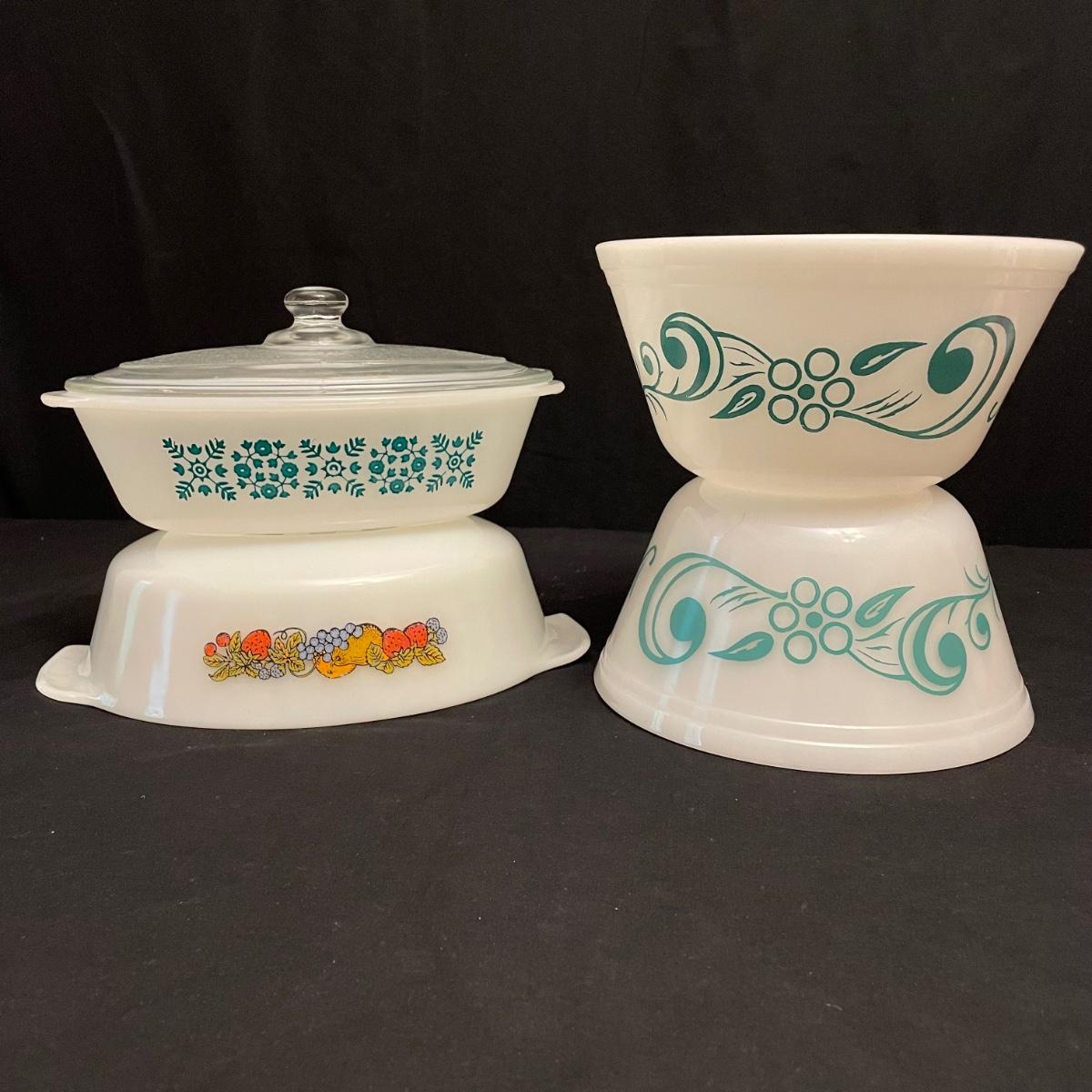 Two mixing/serving bowls by Federal Milk Glass with teal swirls and flowers, a larger lid-less fire-proof casserole dish by Fire King and lastly, a one-quart teal accented Glasbake dish with lid. The fruit adorned Fire King casserole dish is 11” x 7.5” x 3”H which includes the handles. The two Federal bowls show discoloration in their basins. See images. Shipping available.