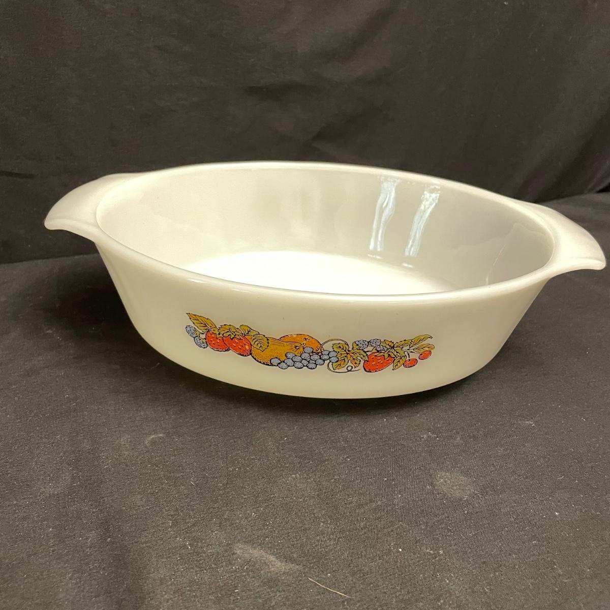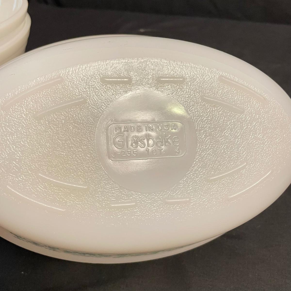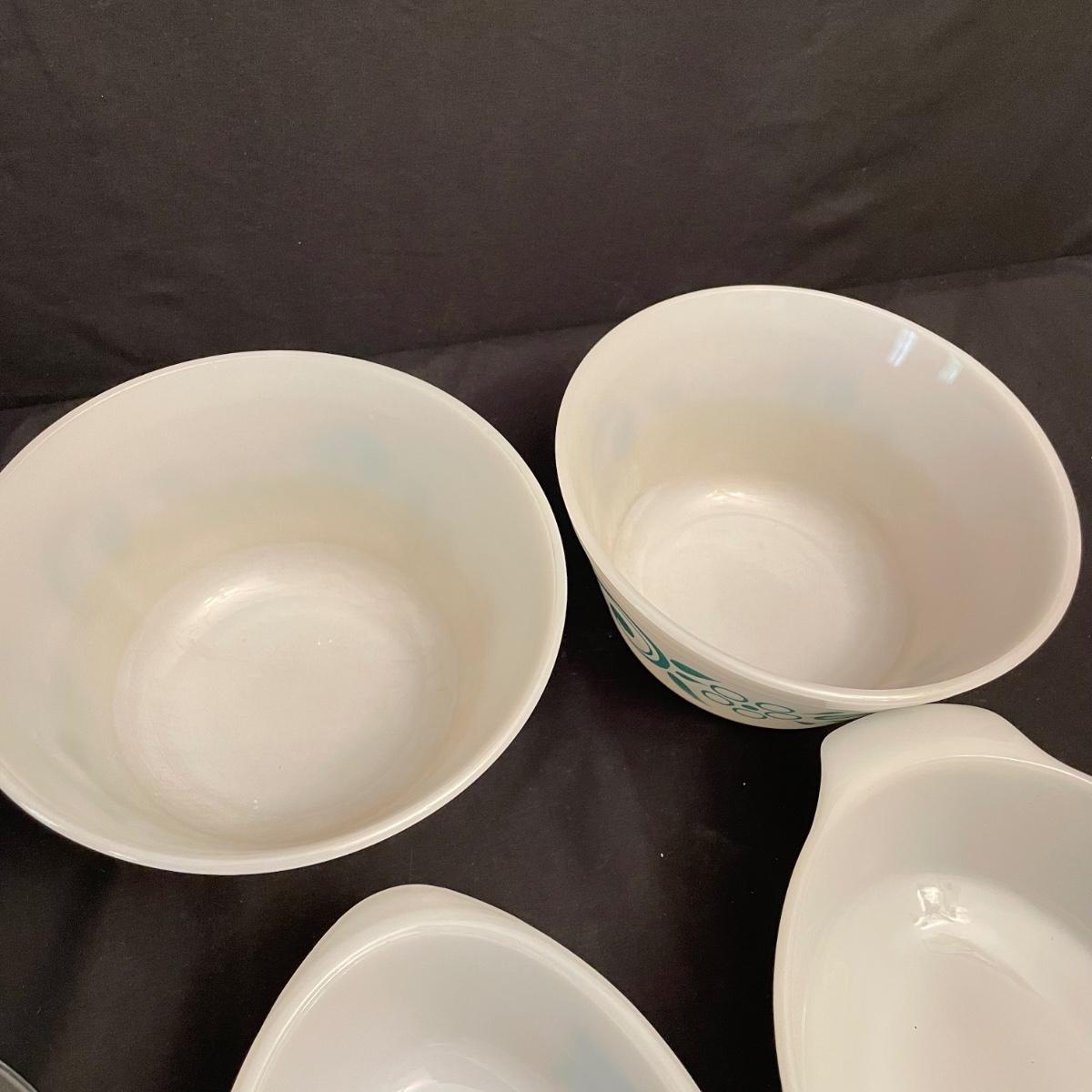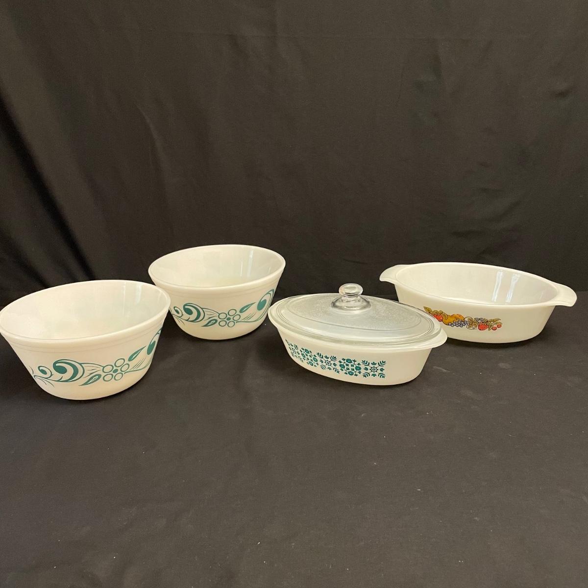 Two mixing/serving bowls by Federal Milk Glass with teal swirls and flowers, a larger lid-less fire-proof casserole dish by Fire King and lastly, a one-quart teal accented Glasbake dish with lid. The fruit adorned Fire King casserole dish is 11” x 7.5” x 3”H which includes the handles. The two Federal bowls show discoloration in their basins. See images. Shipping available.