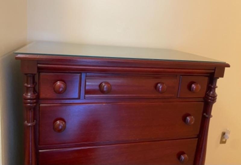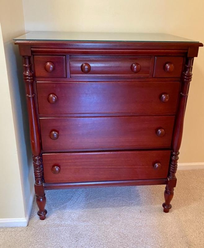 Lovely Federal style chest of drawers with turned legs along body and extending downwards. Three top smaller drawers for lingerie/ jewelry and three larger drawers below - all move smoothly. Custom glass top protects finish.