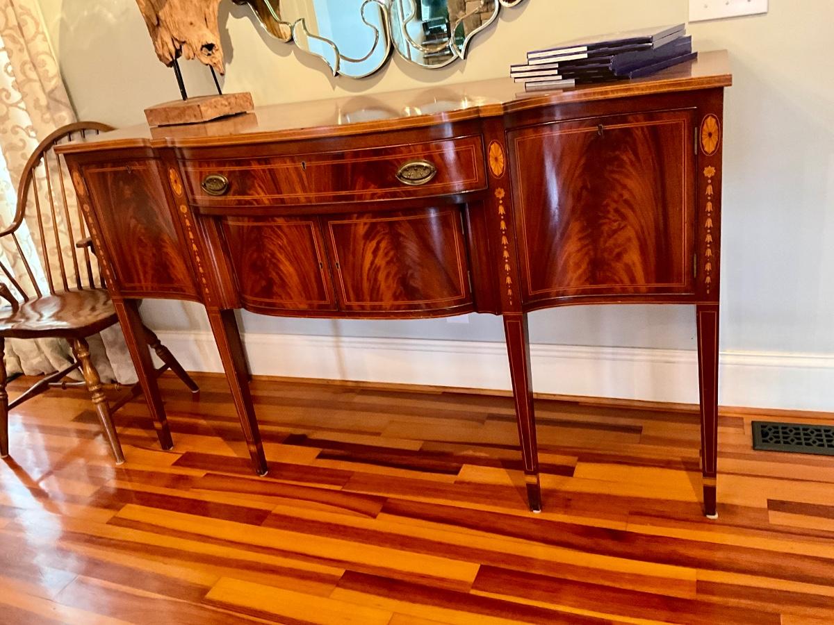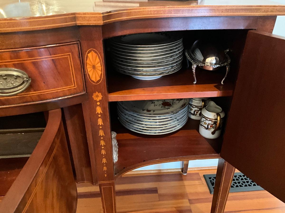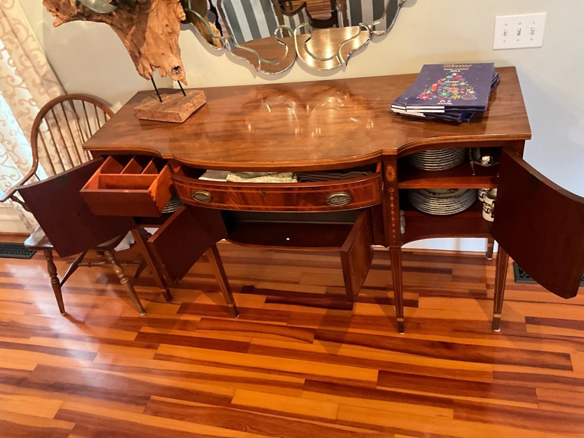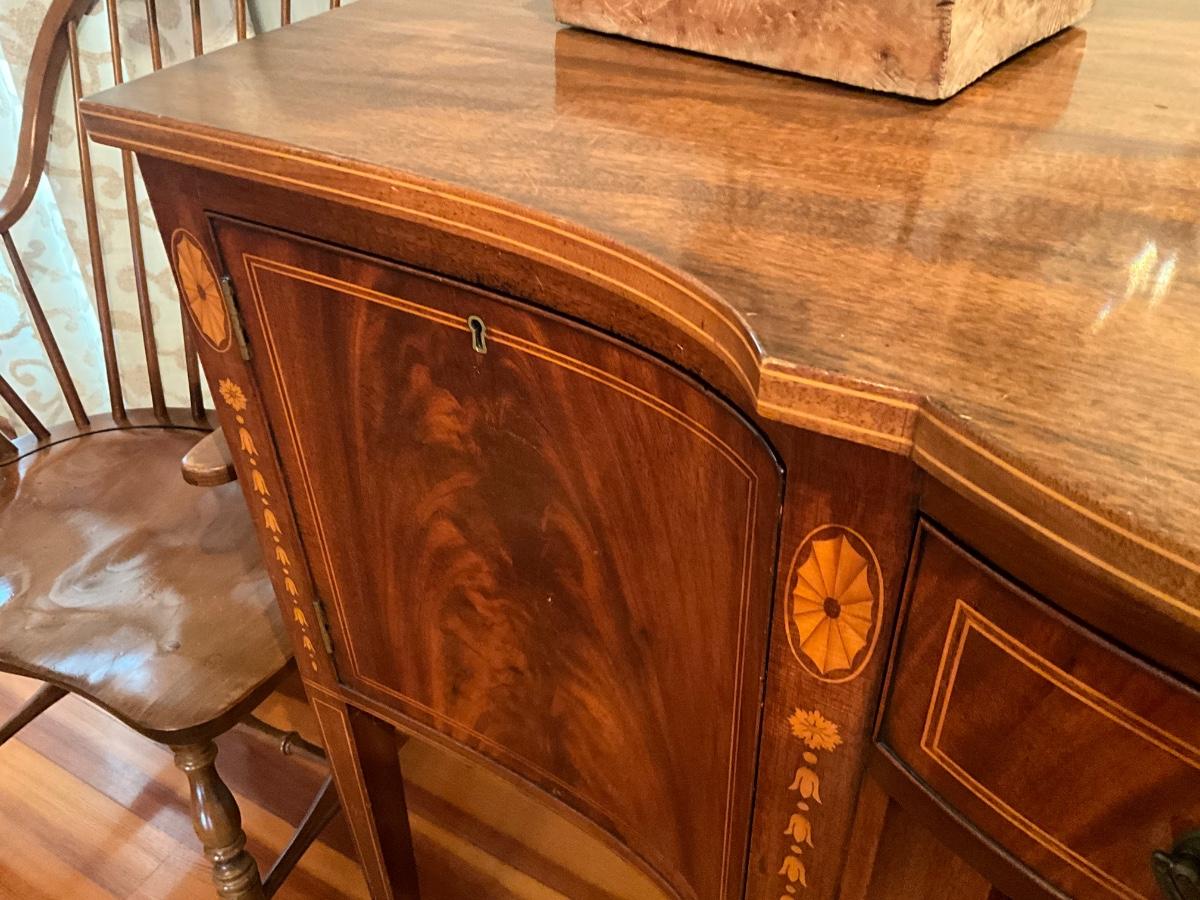 Federal style mahogany inlaid demi-lune locking sideboard with a pull out drawer for silverware. It is 66 inches wide, 25 inches deep, 39 inches tall.