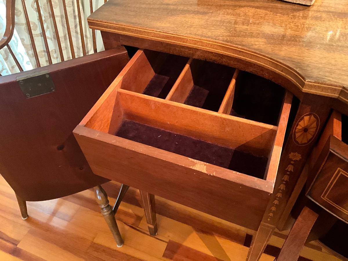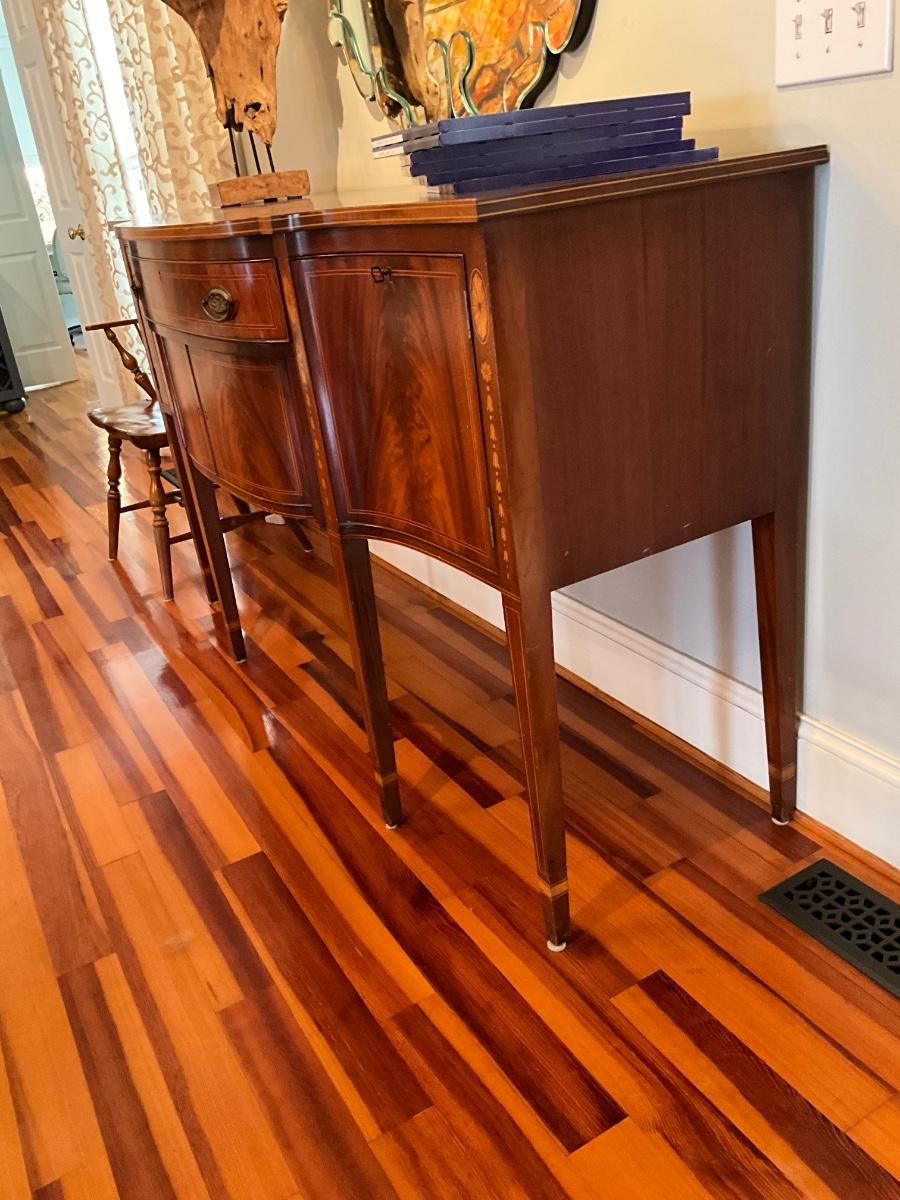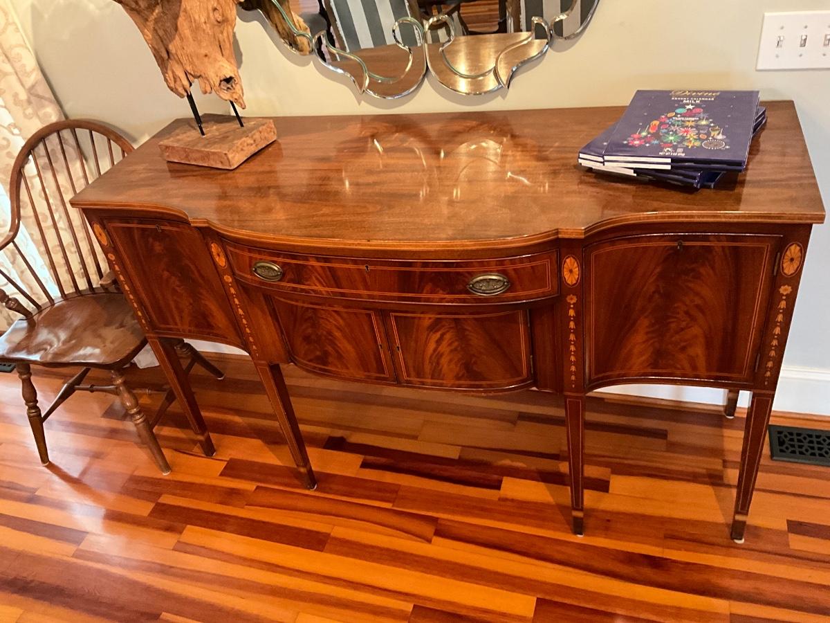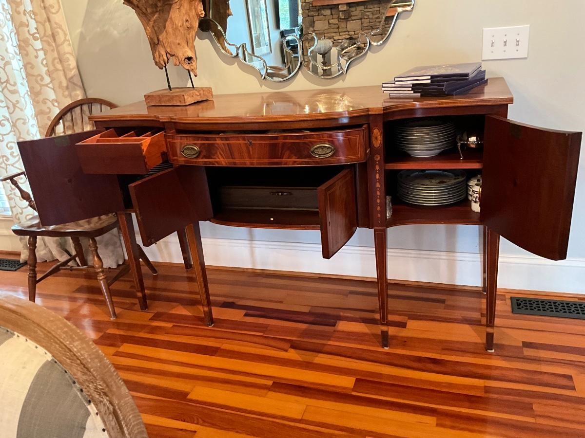 Federal style mahogany inlaid demi-lune locking sideboard with a pull out drawer for silverware. It is 66 inches wide, 25 inches deep, 39 inches tall.