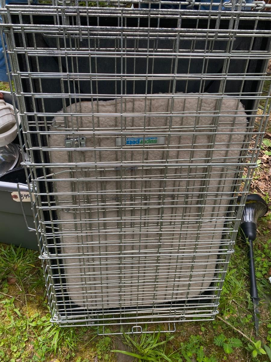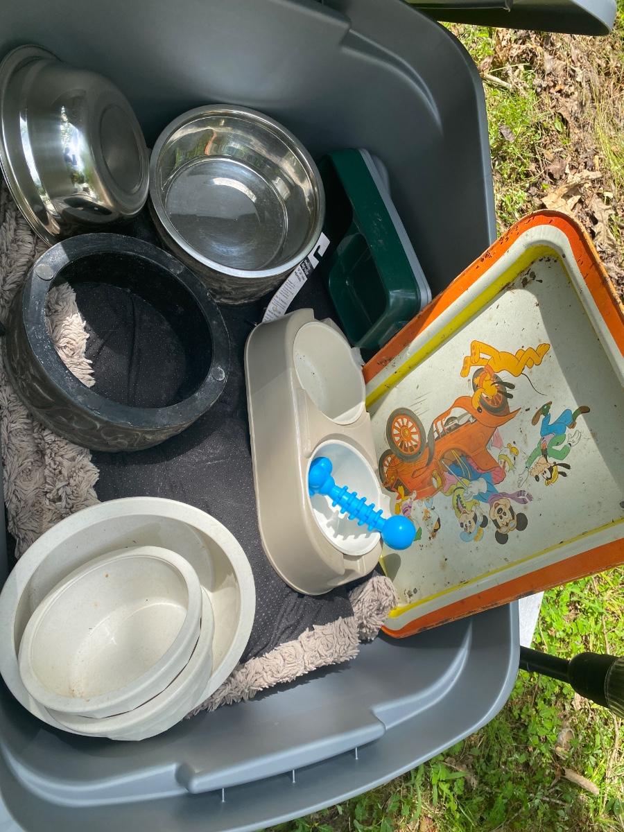 Plastic Tote Filled with Dog Supplies, Includes Super Pet Dog Crate