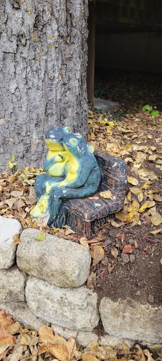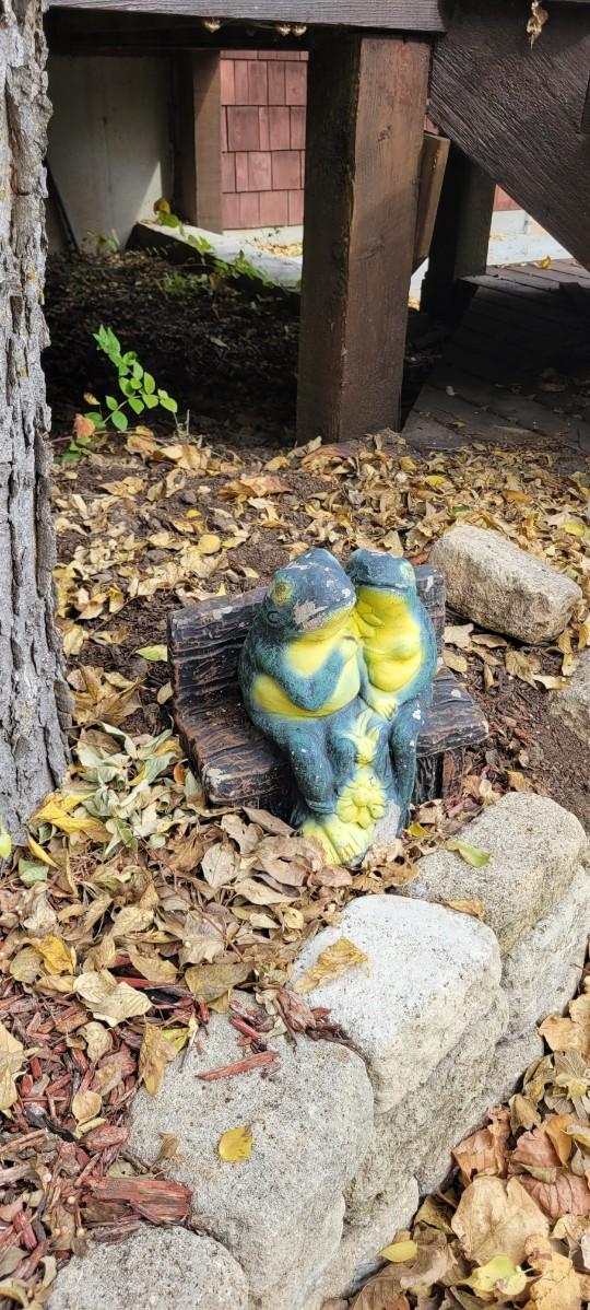 This cute little garden ornament would be good for your yard art collection. Centent constuction. Some areas of paint need to be touched up as seen in the pictures.