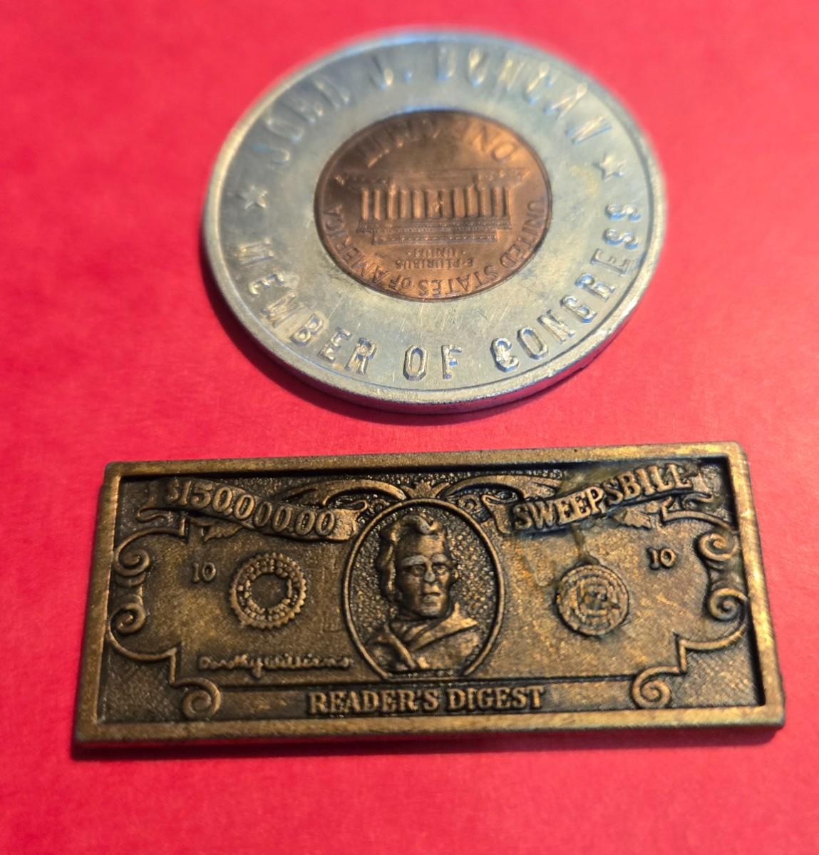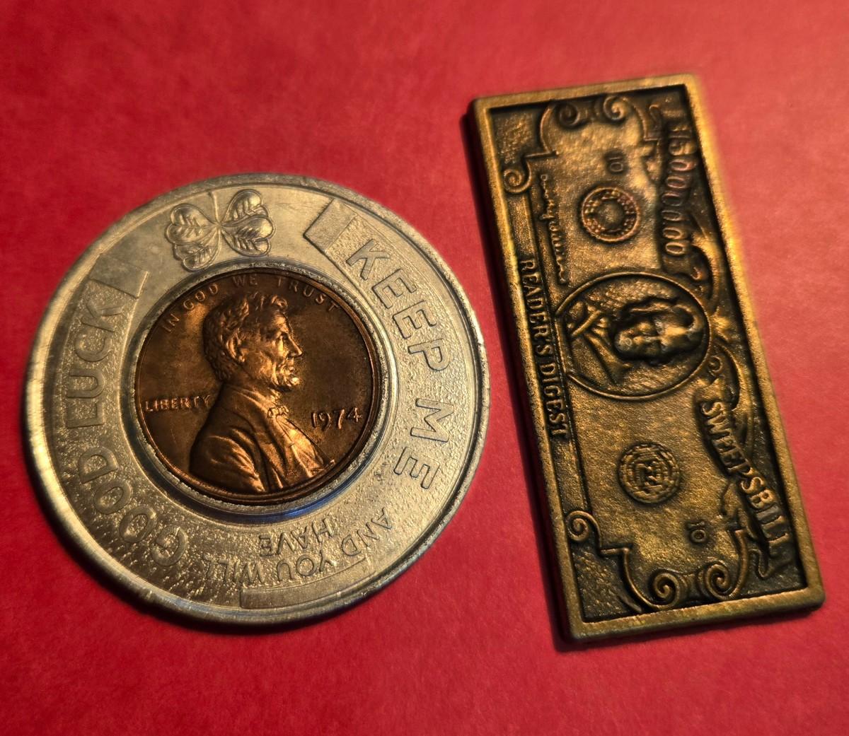 This lot is for a pair of items considered to be lucky. The first is a 'Lucky Penny" used as advertising for businesses and politicians. The second is a metal $150,000.00 replica bill for Reader's Digest Sweepstakes.. If we could have only been that lucky. Just a fun collectible!
