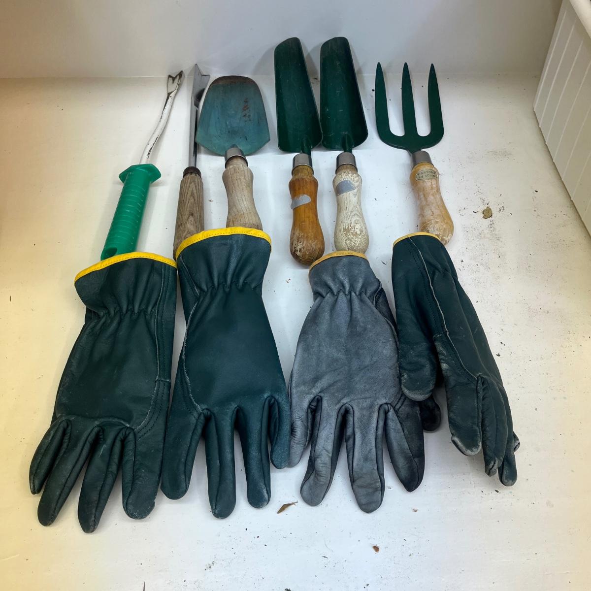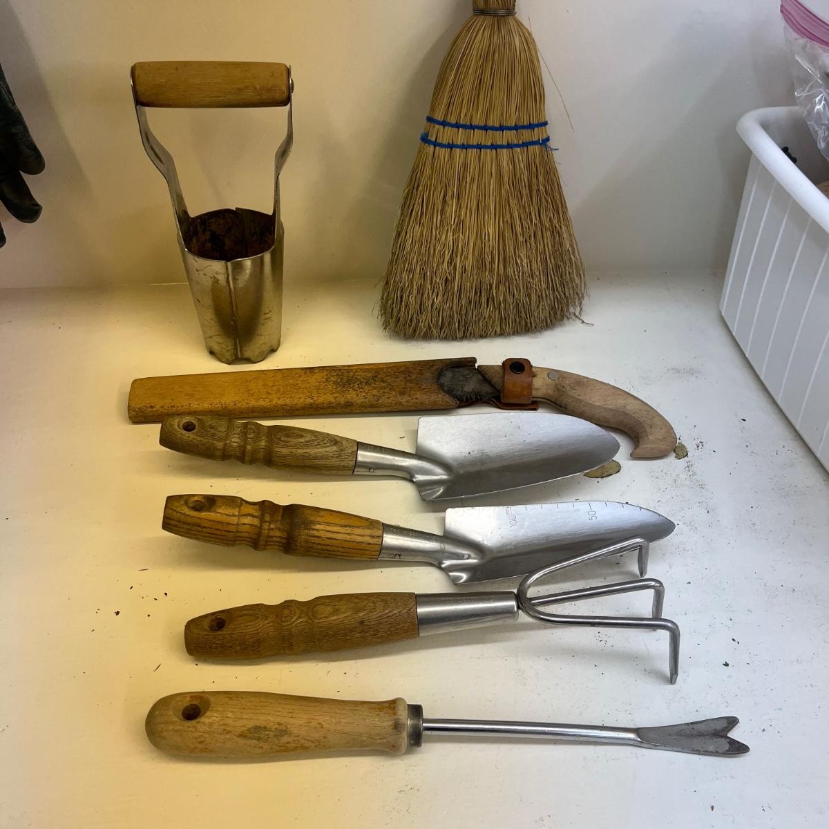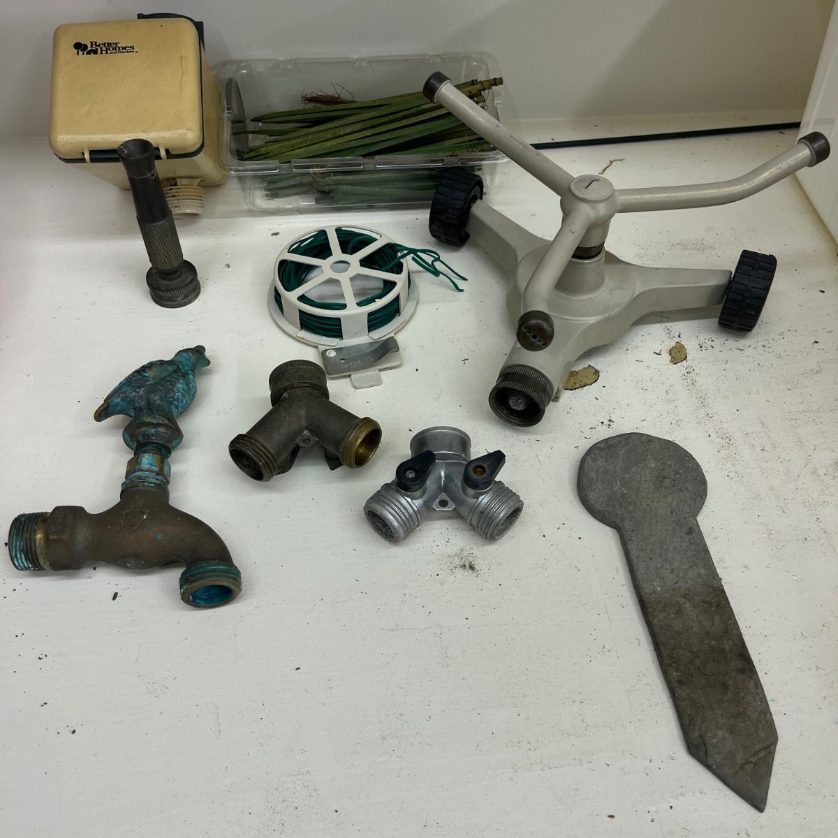 Lot includes Felco pruners, Smith & Hawken pruners, trowels, leather gloves, plastic scoop, saw, florist wire, sprinkler, bird faucet and more.