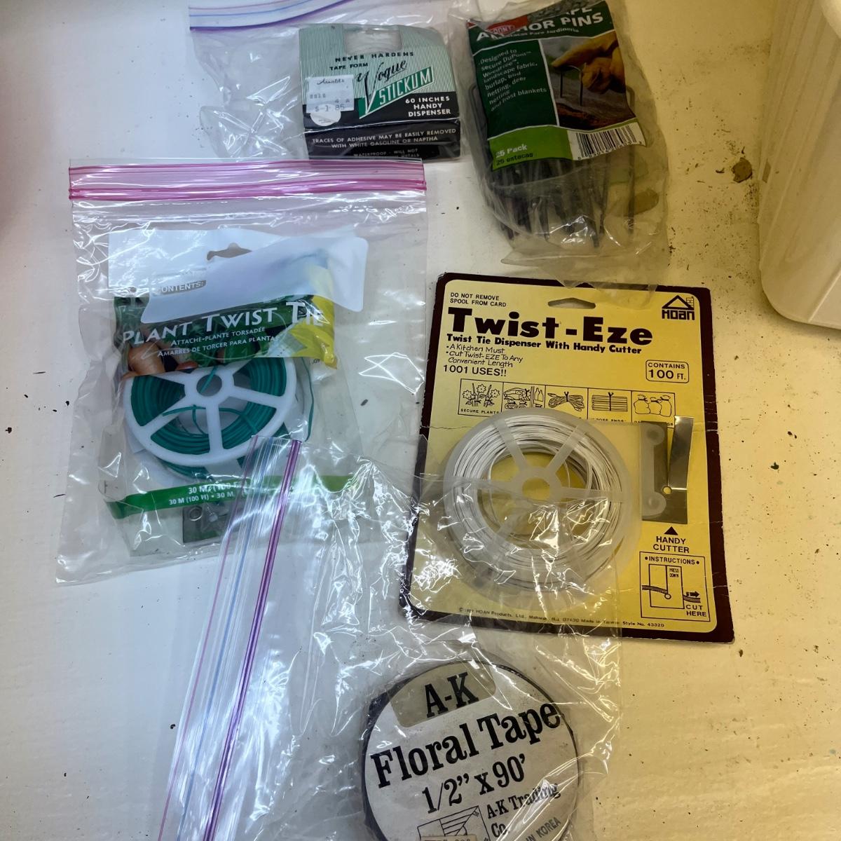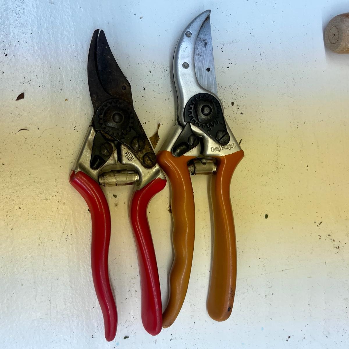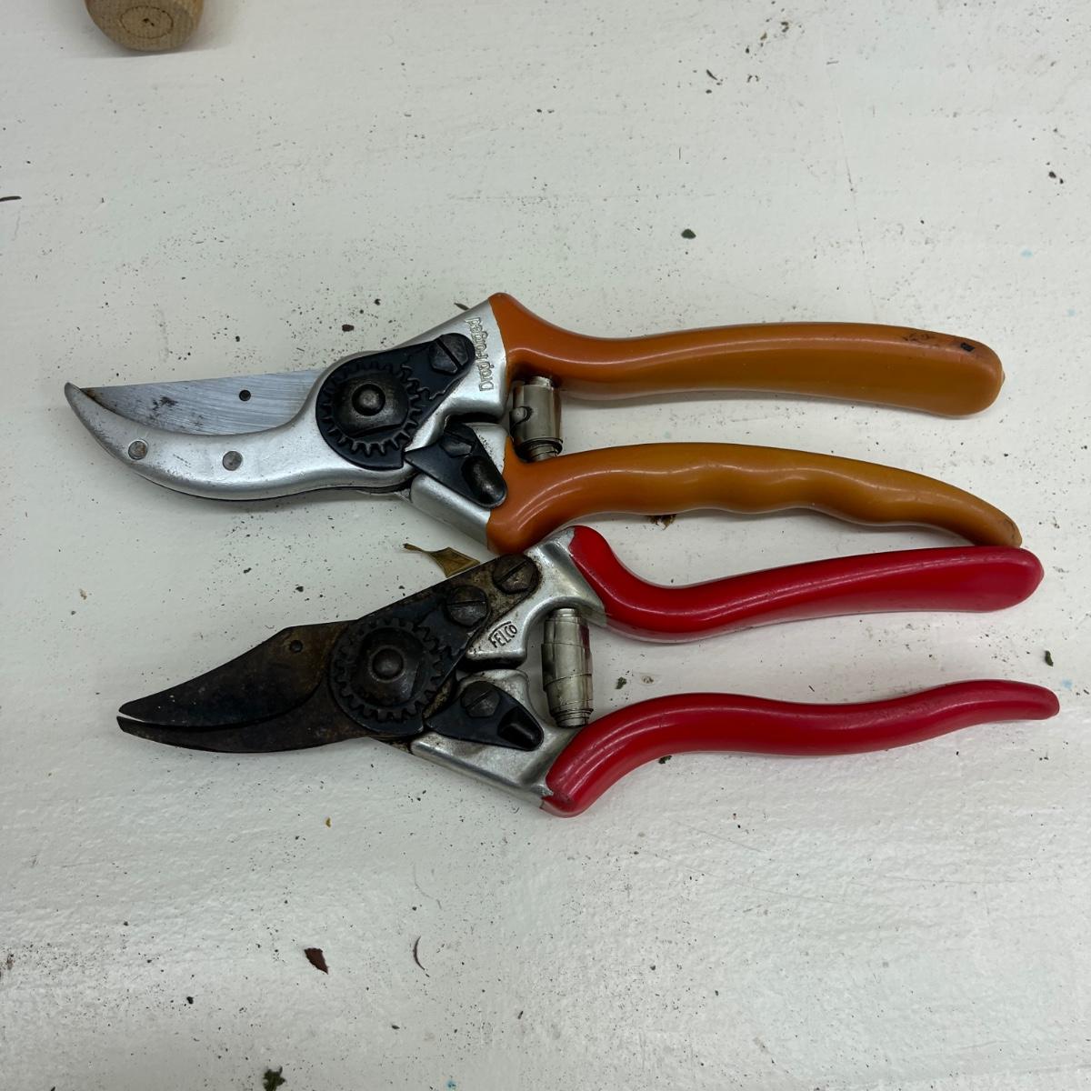 Lot includes Felco pruners, Smith & Hawken pruners, trowels, leather gloves, plastic scoop, saw, florist wire, sprinkler, bird faucet and more.