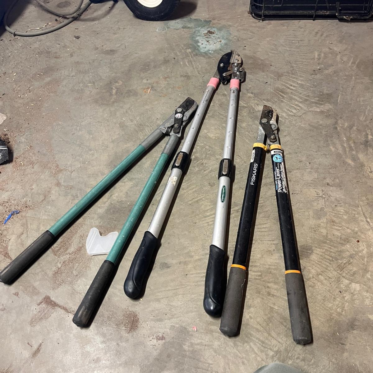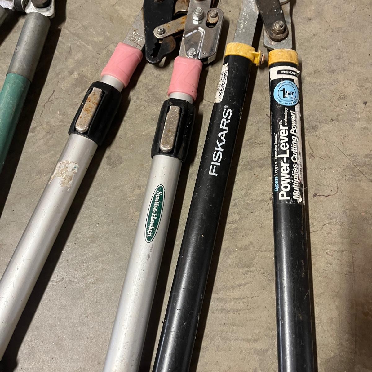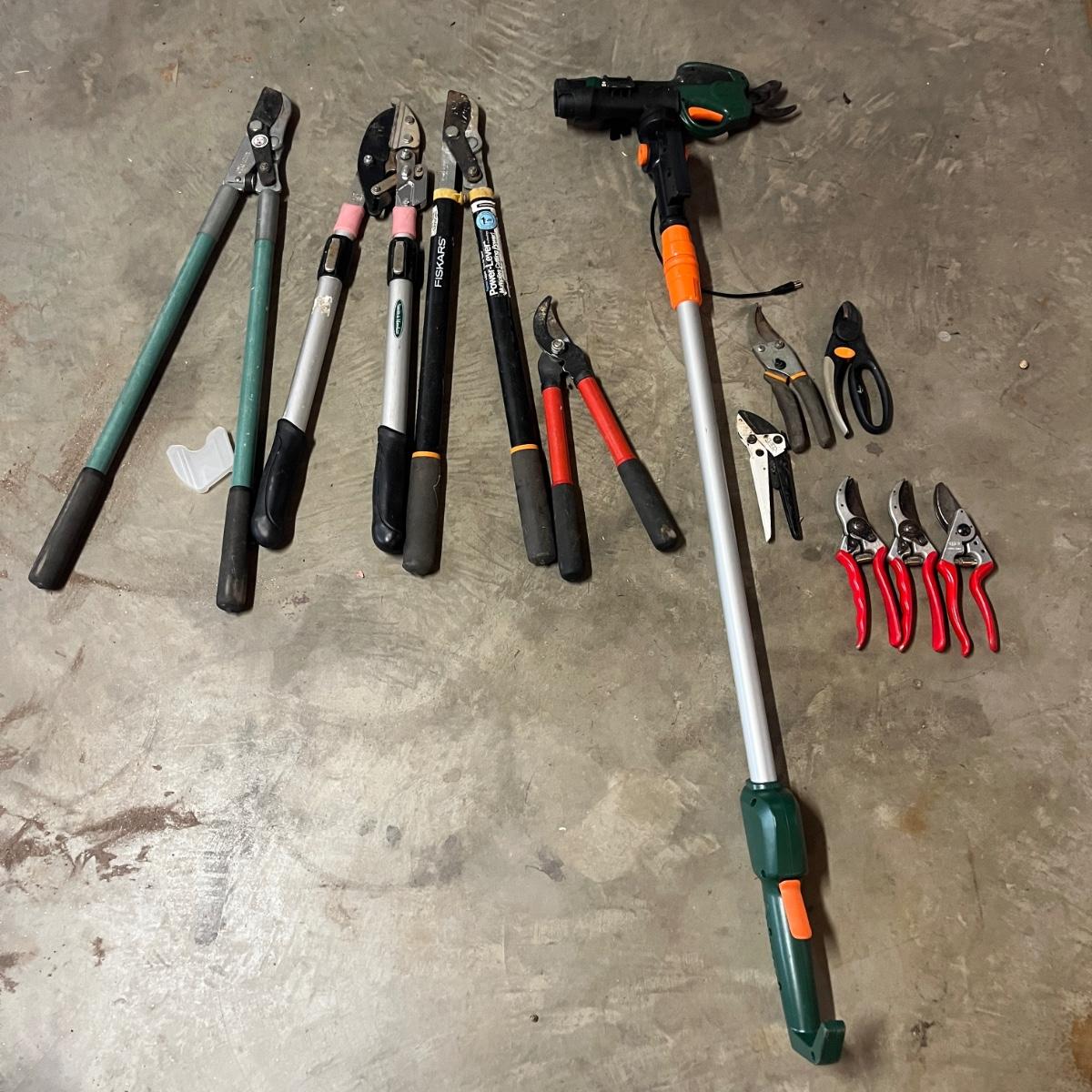 Lot includes three pairs of Felco pruners, Three pairs of loppers, four hand pruners and a Scotts lithium battery powered cordless pruner that powered on when trigger pulled. Electric pruner measures 15” x 5” x 50”long and comes with owner’s manual.