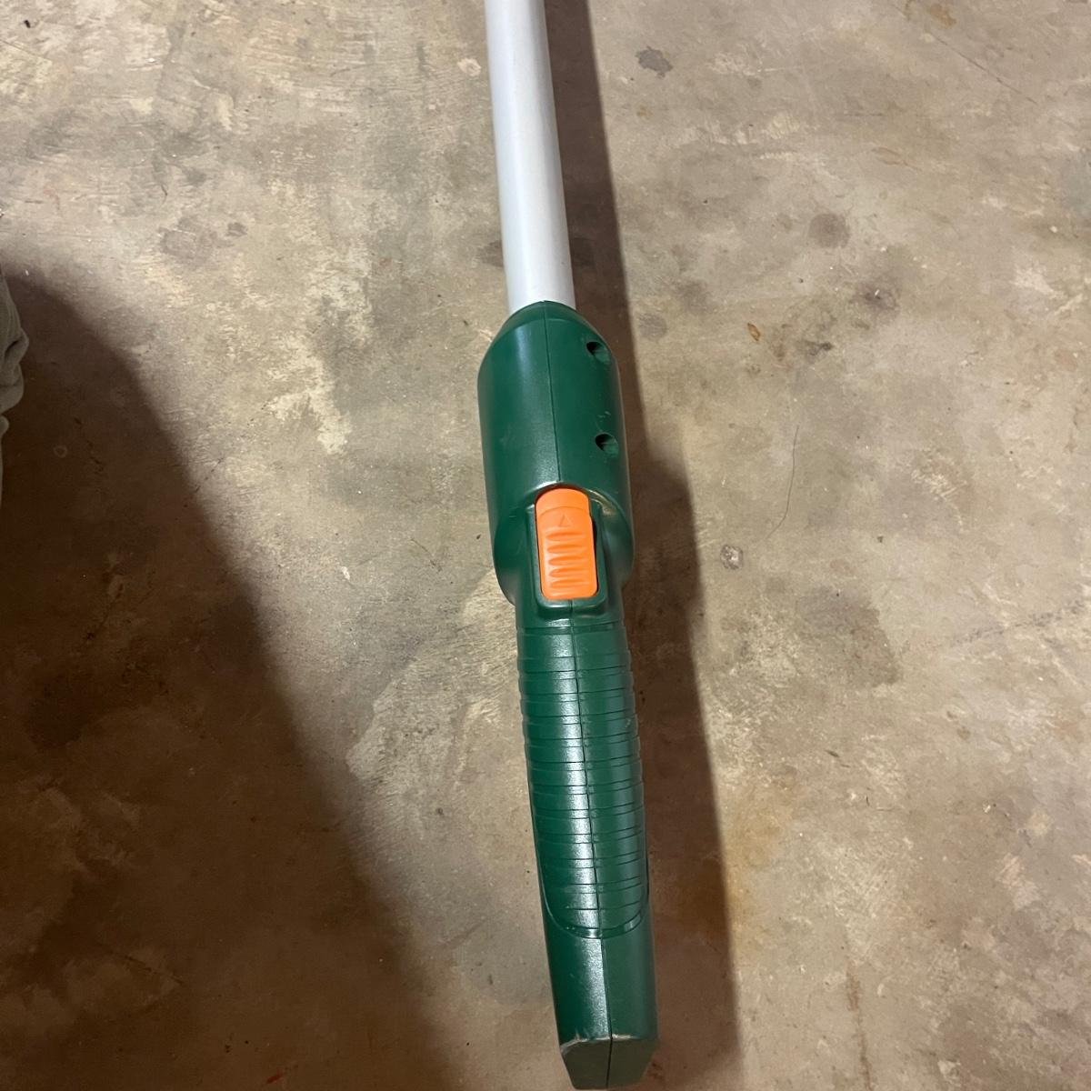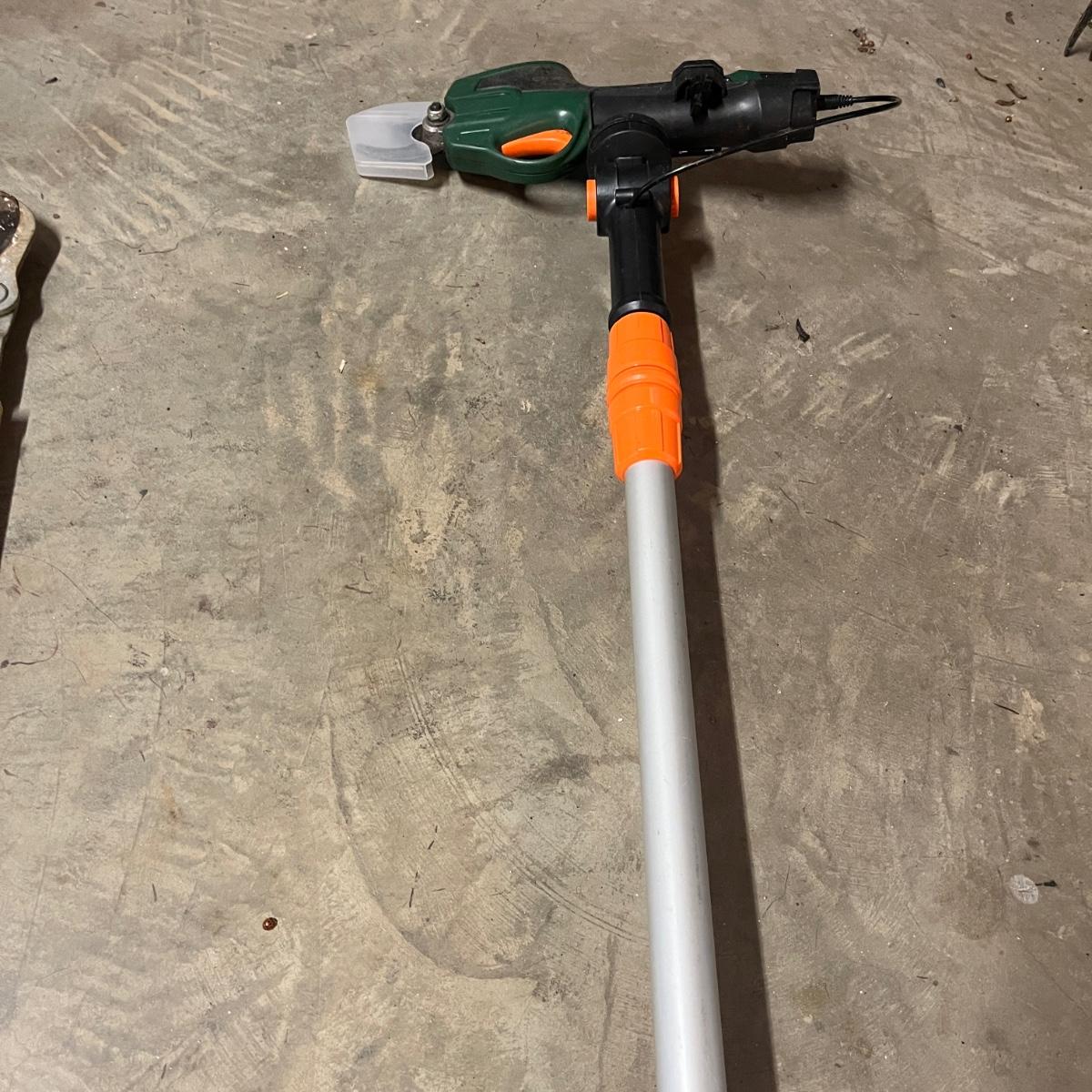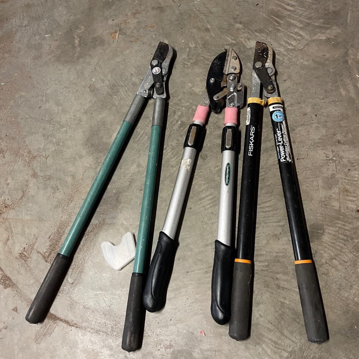 Lot includes three pairs of Felco pruners, Three pairs of loppers, four hand pruners and a Scotts lithium battery powered cordless pruner that powered on when trigger pulled. Electric pruner measures 15” x 5” x 50”long and comes with owner’s manual.