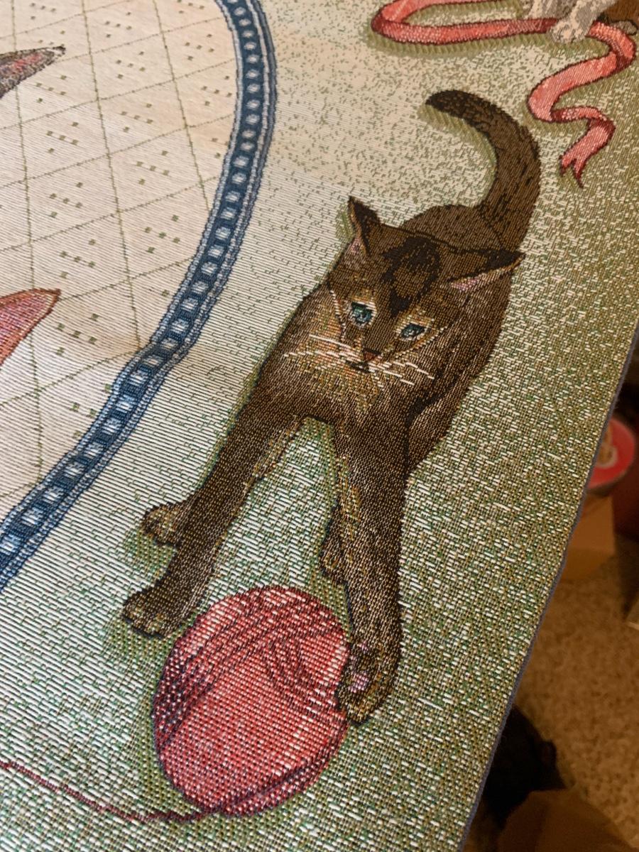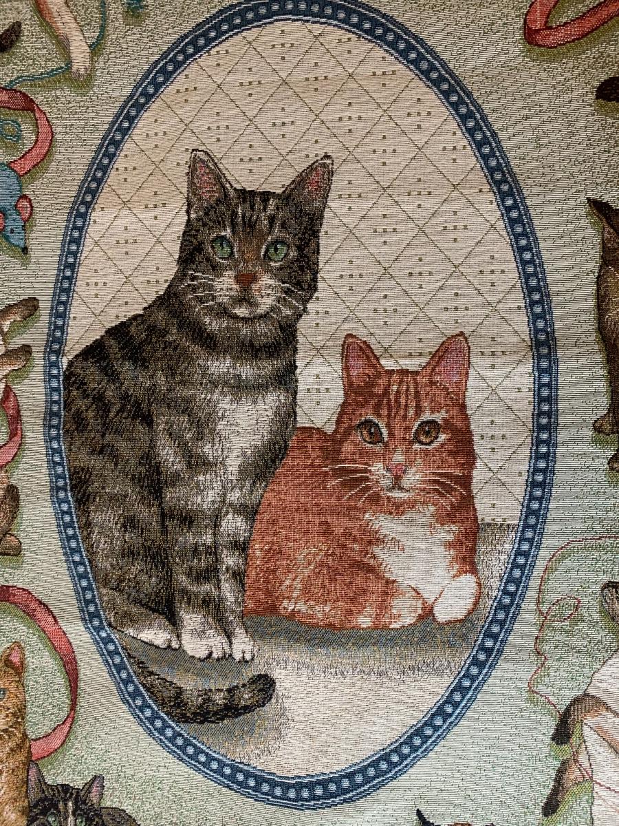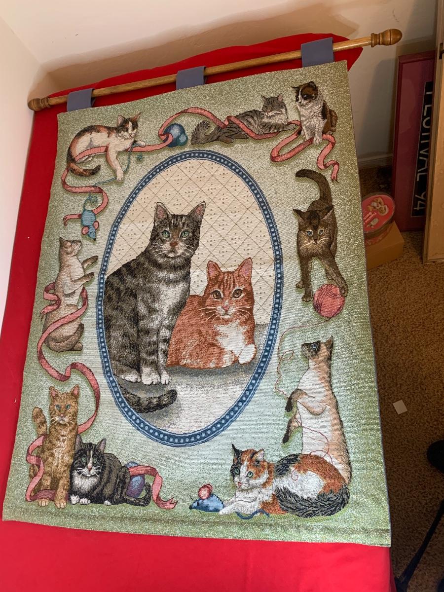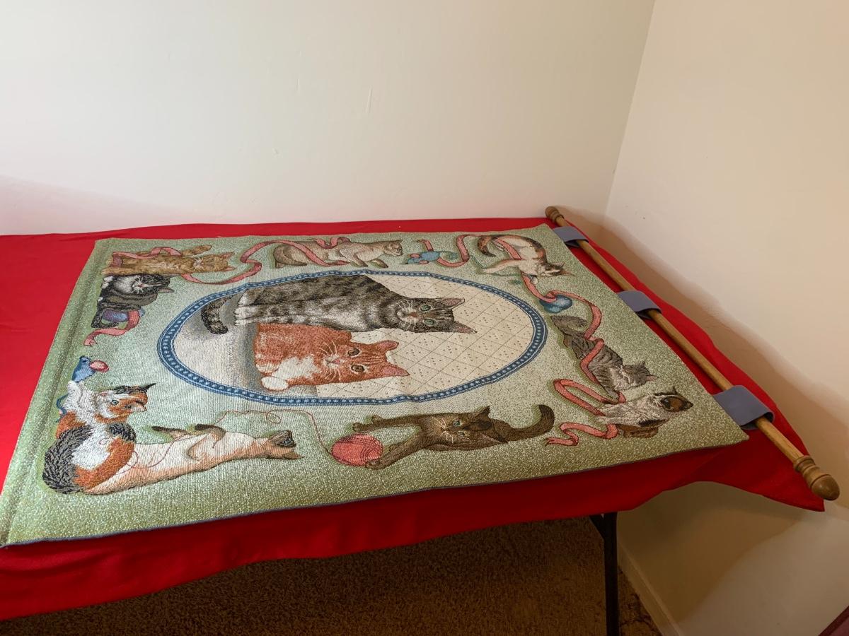 Lot includes a very nice condition tapestry featuring cat portraits. Includes the wood dowel for hanging. Made in USA. 26” x 36”