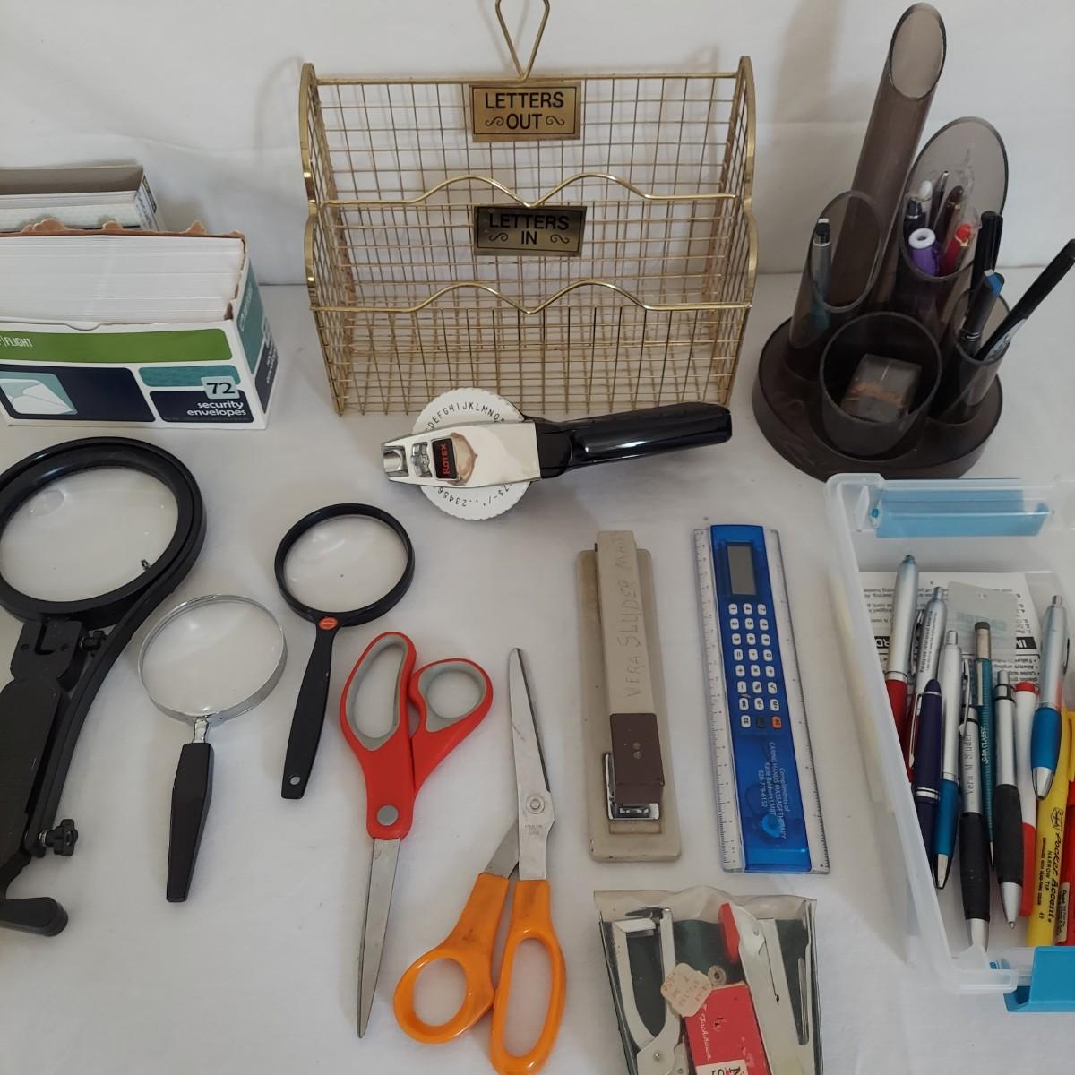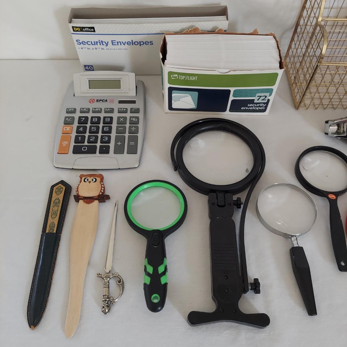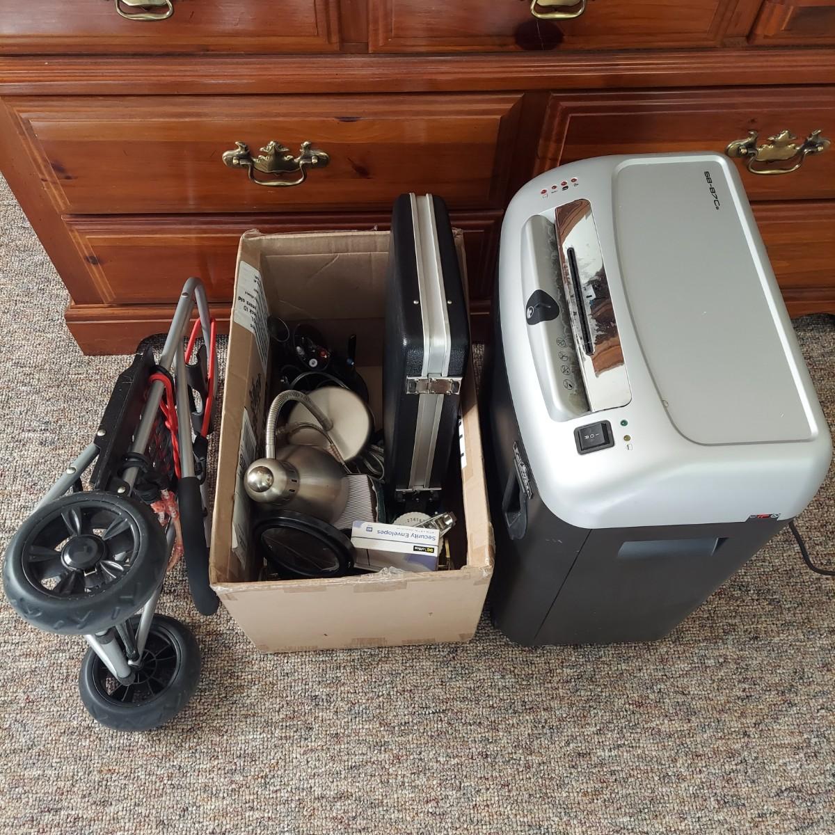 Lot full of several office supplies including a desk lamp, small file caddy, a Fellowes brand paper shredder. The shredder is on casters and measures approximately 16" x 11" x 24"H. It turned on when plugged in. Local Pickup Only.