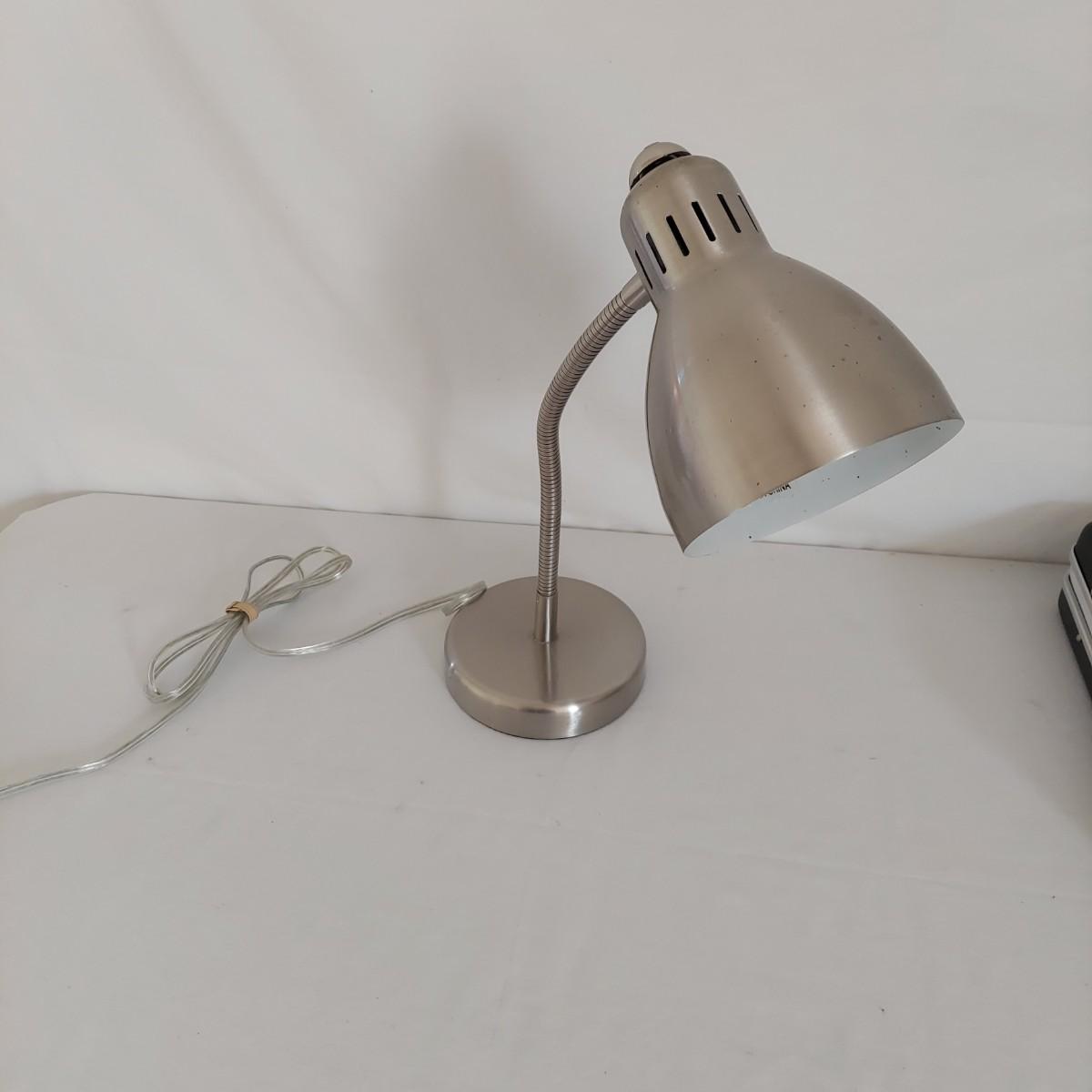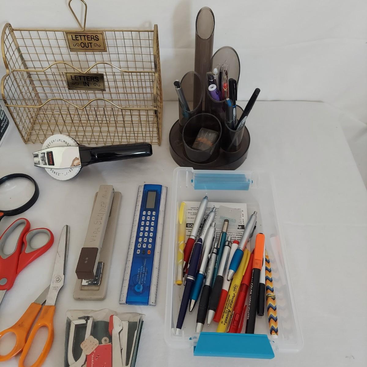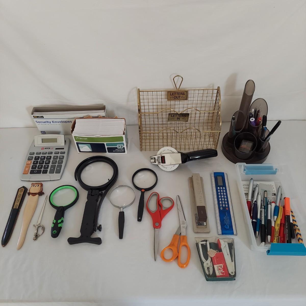Lot full of several office supplies including a desk lamp, small file caddy, a Fellowes brand paper shredder. The shredder is on casters and measures approximately 16" x 11" x 24"H. It turned on when plugged in. Local Pickup Only.