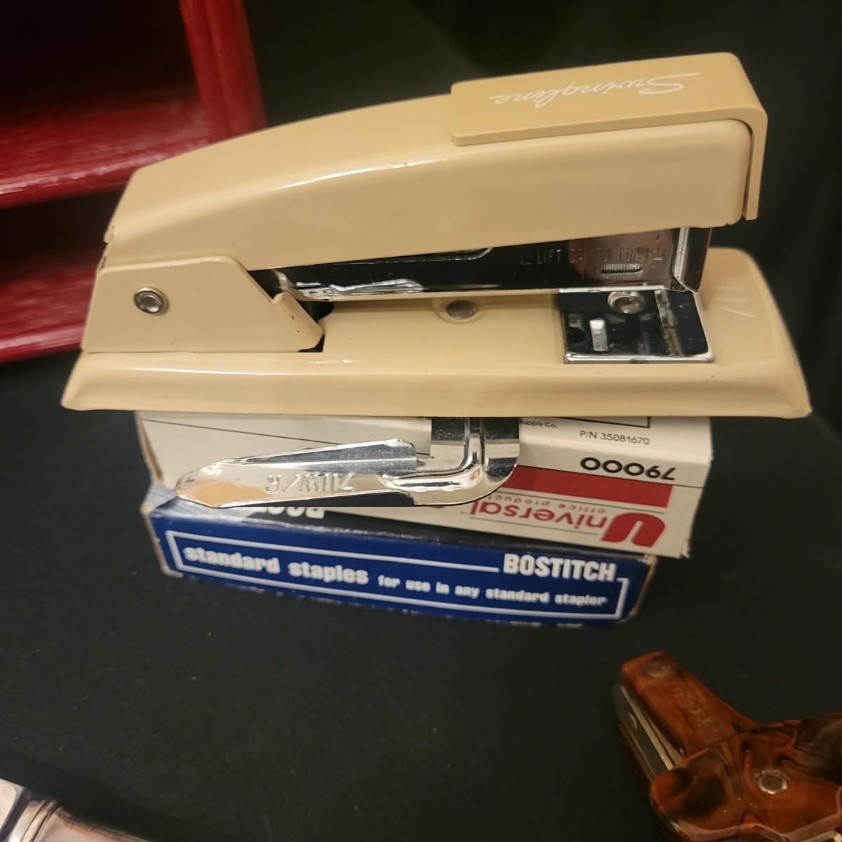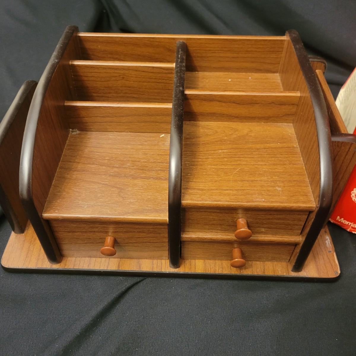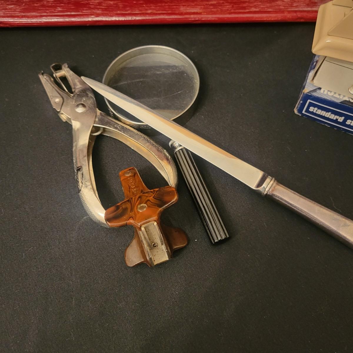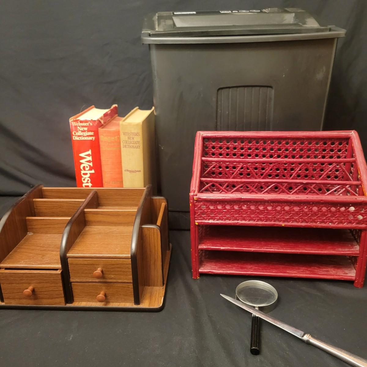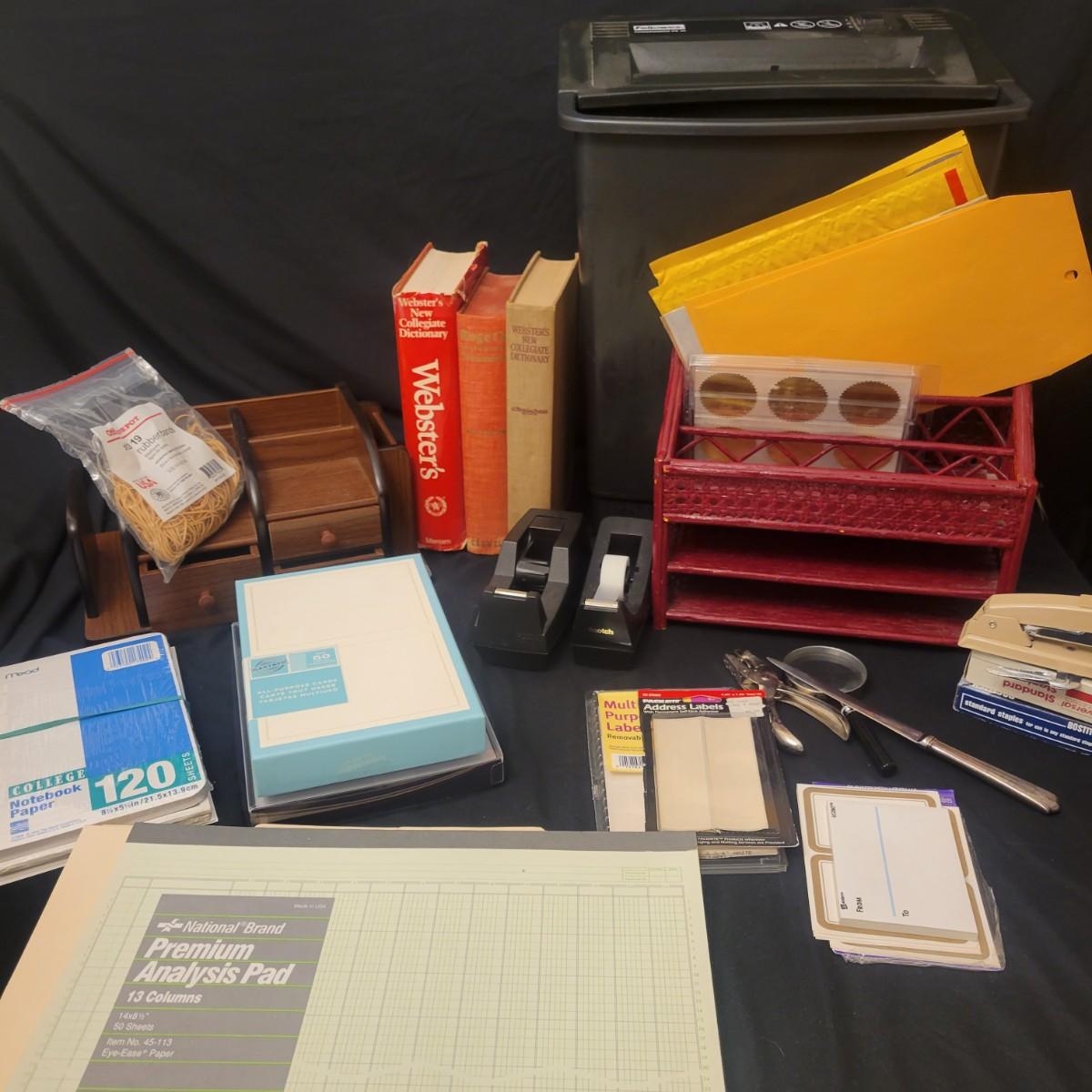 A Fellowes Powershred paper shredder and other office supplies in good condition. Fellowes paper shredder was tested and works and is model # PS 40. Measures approximately 15" x 10" x 18". Lot also includes dictionaries, two desk organizers, tape dispensers, manilla folders, an analysis pad, all purpose cards and more. Shipping available