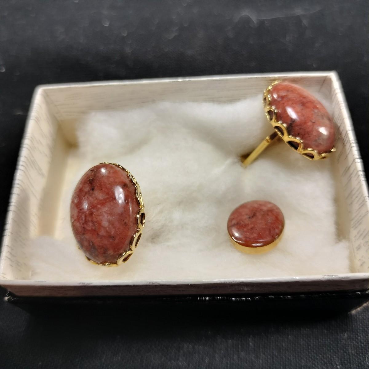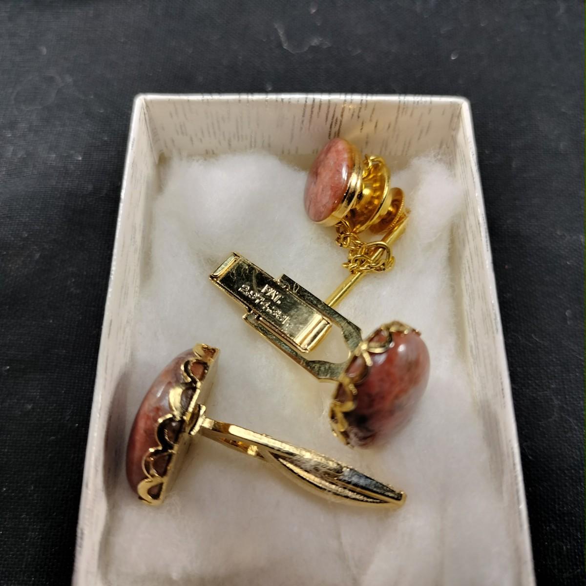 This auction lot is for a set of Felspar Cufflinks and Tie Pin. This is a very handsome Cufflink set. The stones are set in a gold tone metal/brass (?) and the stones are Felspar. If they were worn it wasn't very often. Very nice.