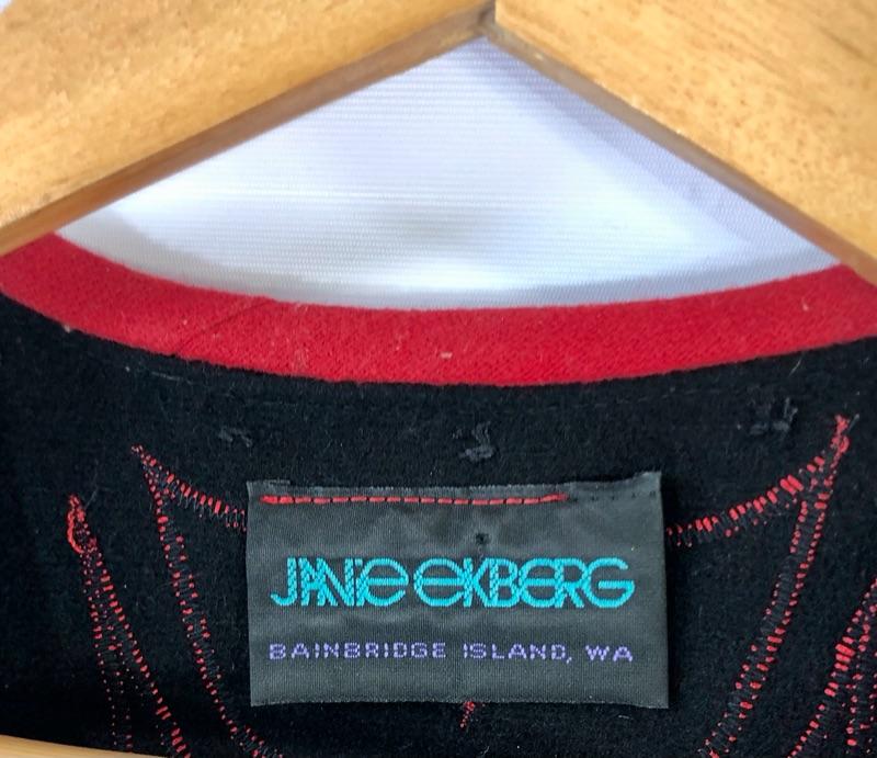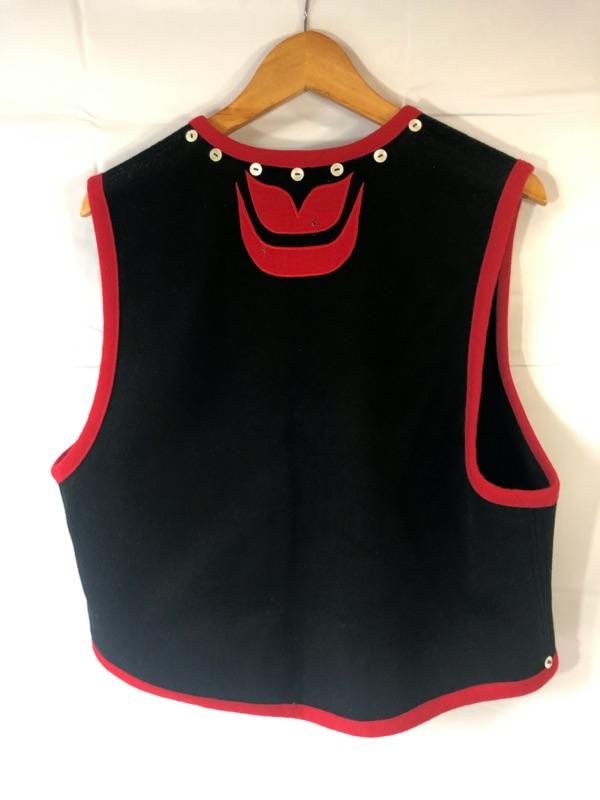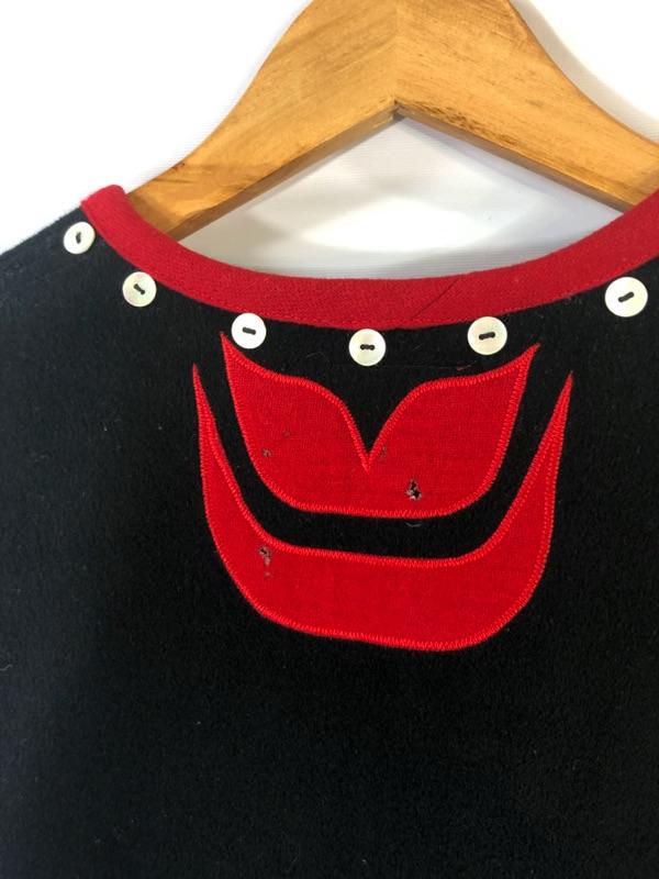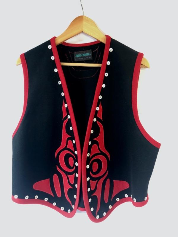From Bainbridge Island (WA) artist, Janie Ekberg. Totem design. Unsized. Most suitable for sizes M-XL.. Some damage to the back appliqué.
