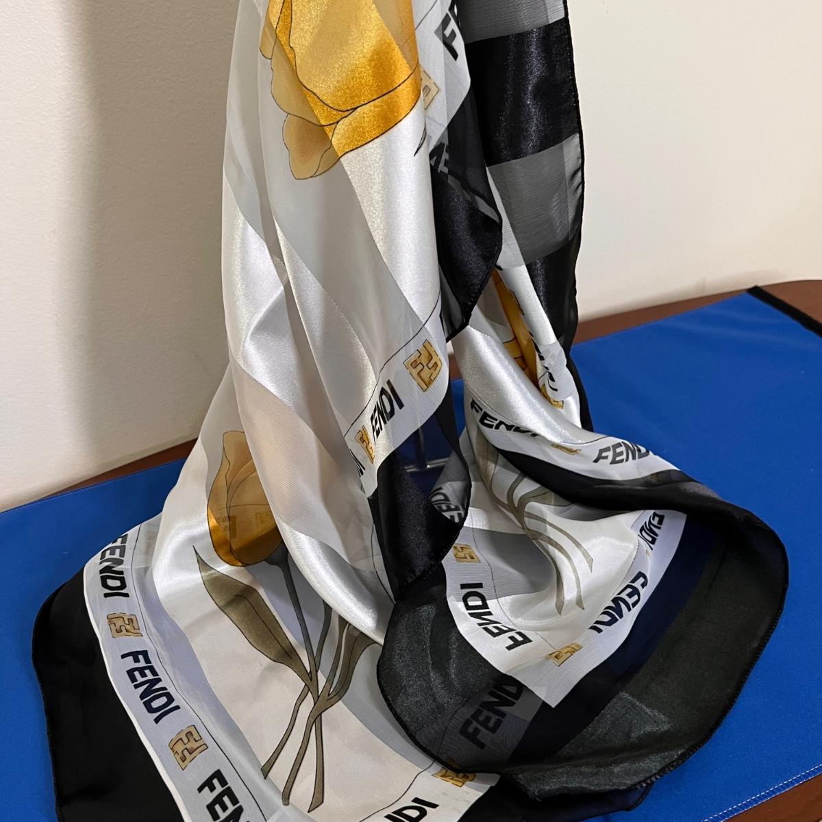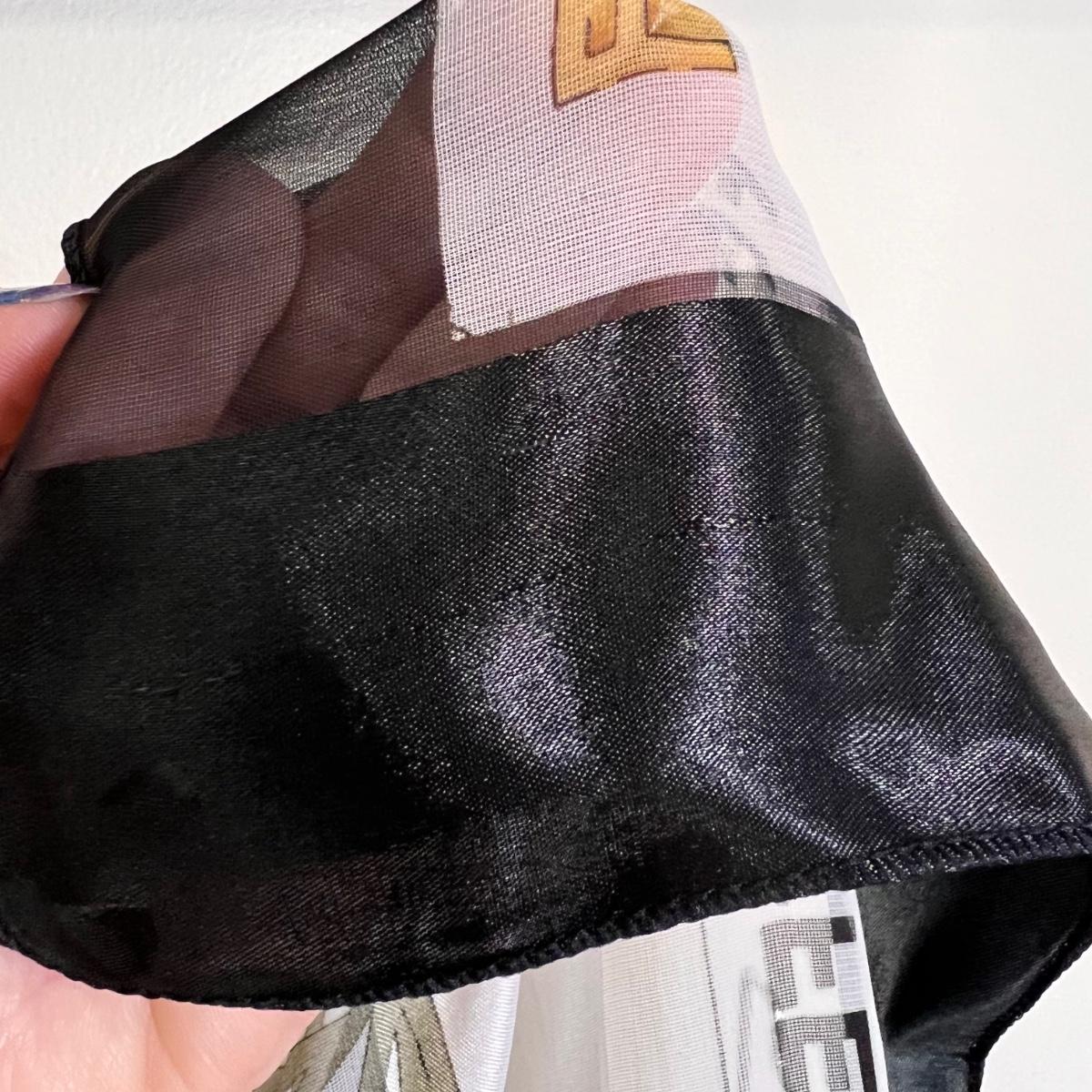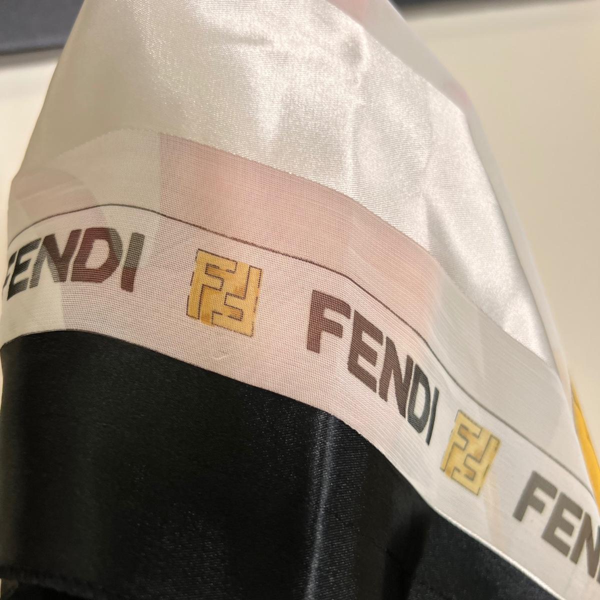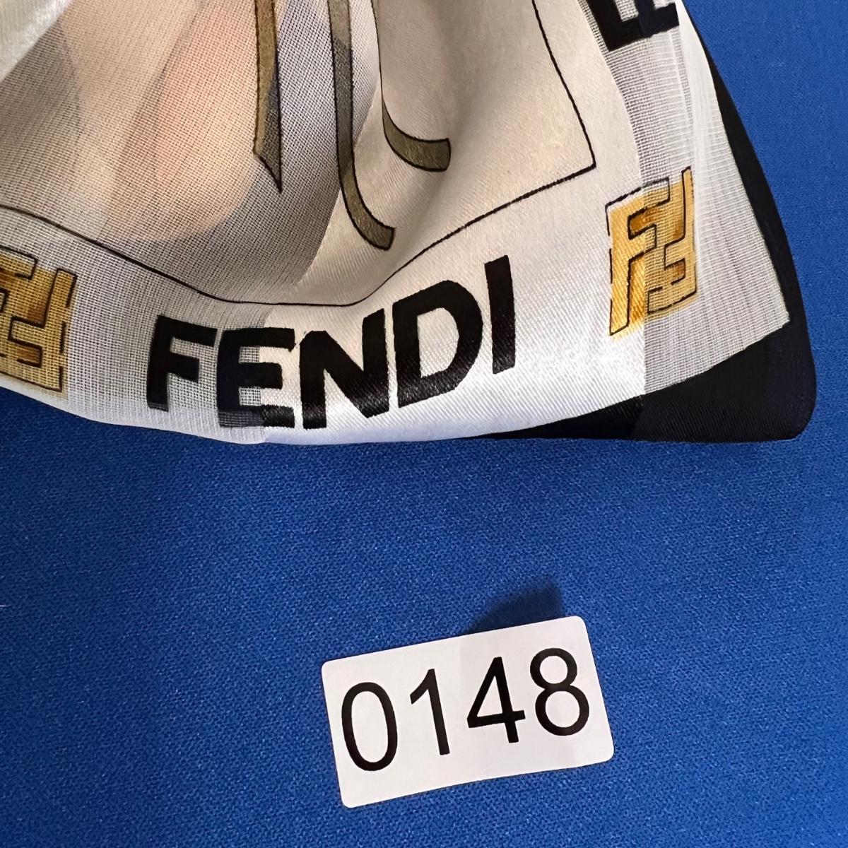 40” square. This scarf does not have a tag. It has shear and solid pattern. Stitching is loose in some spots as shown in pictures. Also has some pulls as shown. Feels like the other Fendi scarf listed which has a tag saying it’s silk.