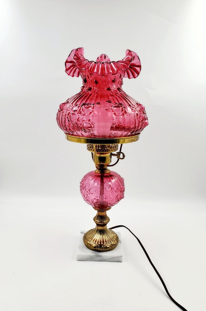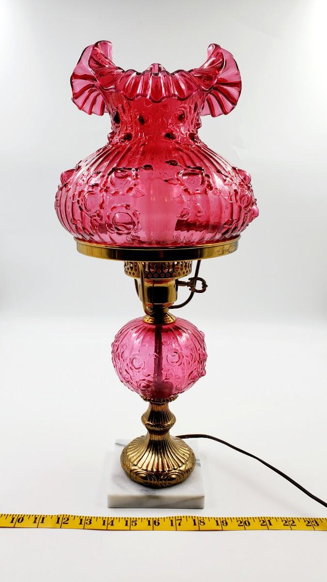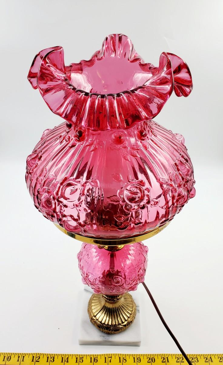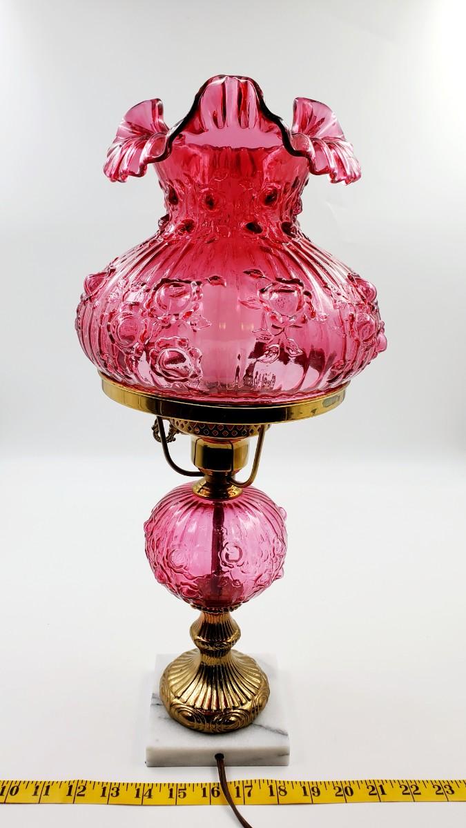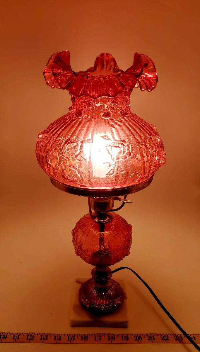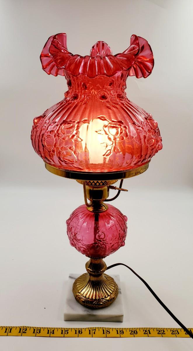 Amazing Fenton "Rose" pattern cranberry colored glass lamp. Very good condition. Metal base on top of what may be marble, approximately 19.5in tall.. Please see photos.
