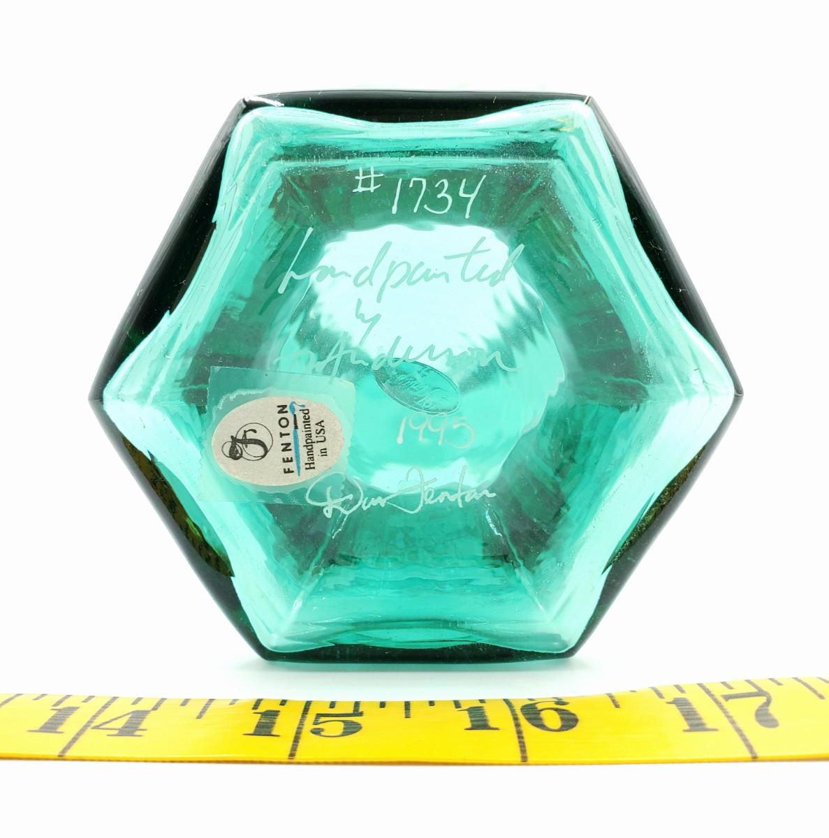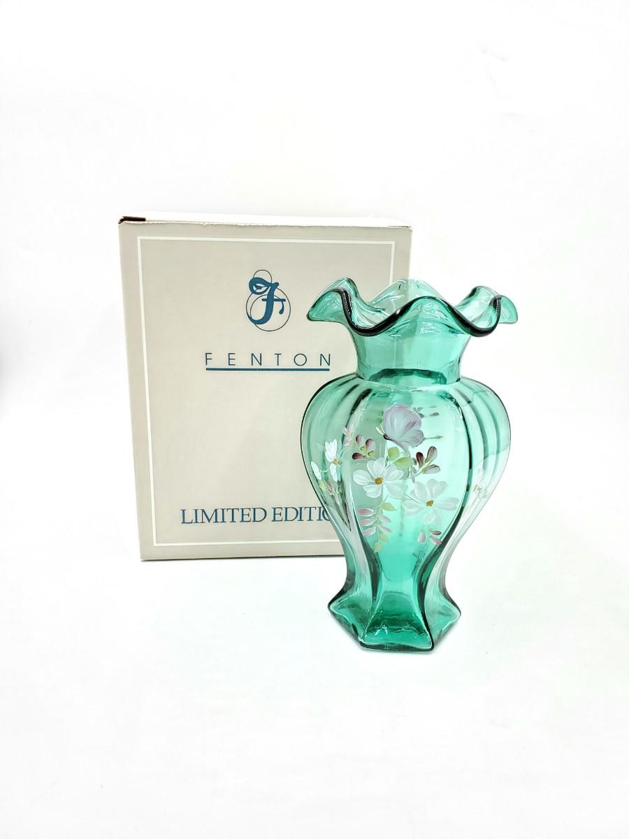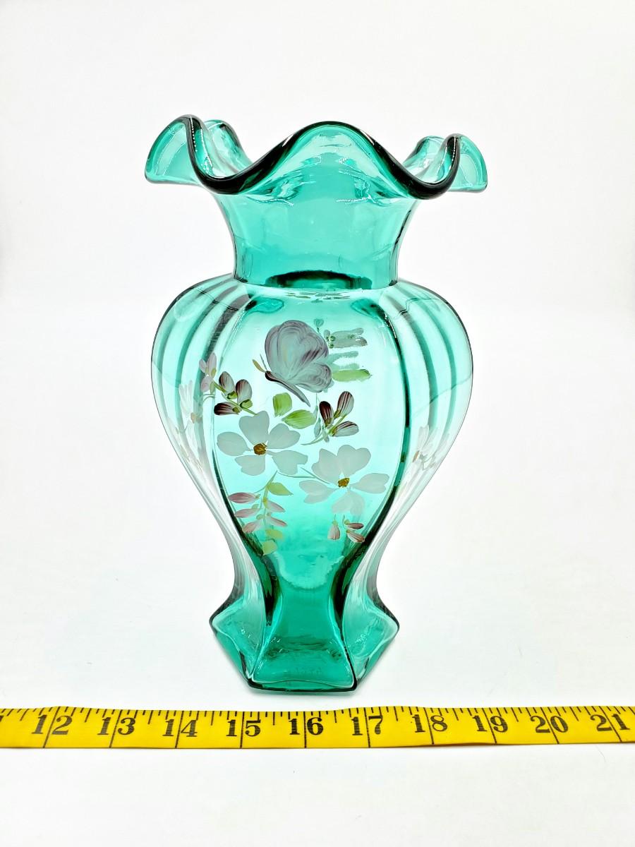Beautifully hand painted butterfly and flowers, 1995 Fenton spruce green vase in very good condition. Fenton sticker has been taped on the bottom, please see photo. Signed by painter as well as a member of the Fenton family on bottom. Original box inlcuded, does has minimal cosmetic flaws on top and has been written on, see photos, otherwise solid condition, August 25 1995 stamped on inside of box lid.