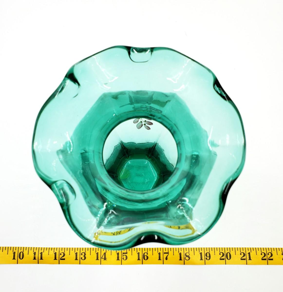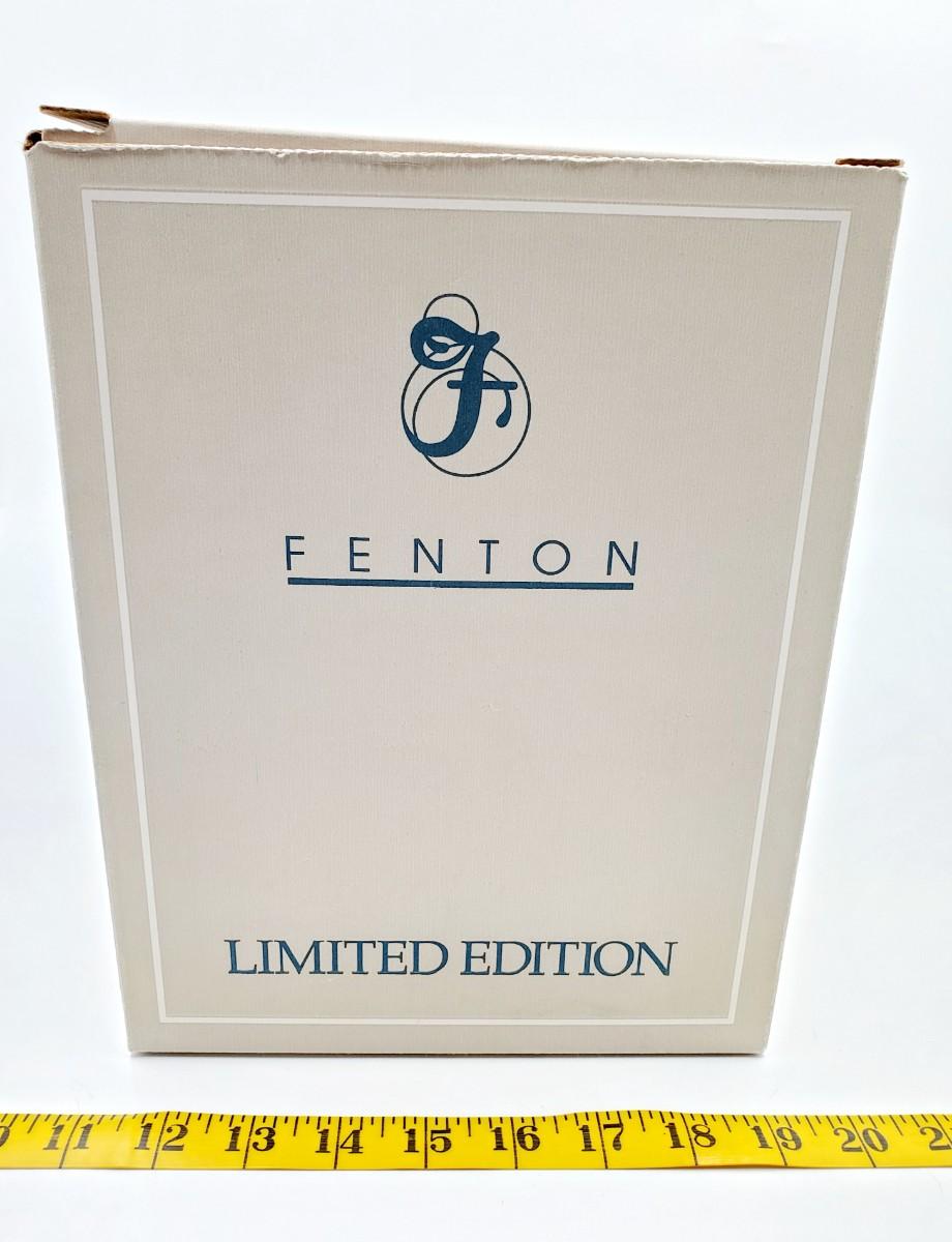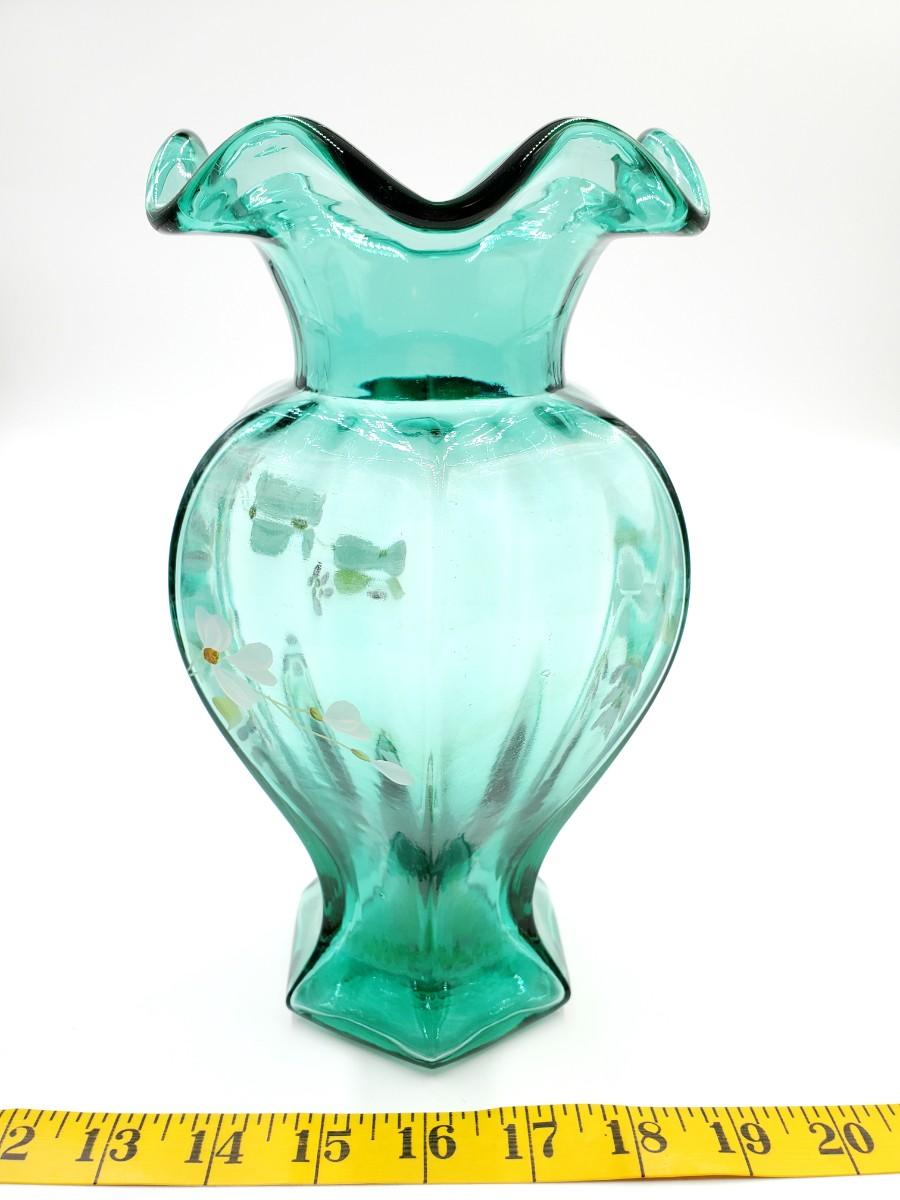 Beautifully hand painted butterfly and flowers, 1995 Fenton spruce green vase in very good condition. Fenton sticker has been taped on the bottom, please see photo. Signed by painter as well as a member of the Fenton family on bottom. Original box inlcuded, does has minimal cosmetic flaws on top and has been written on, see photos, otherwise solid condition, August 25 1995 stamped on inside of box lid.