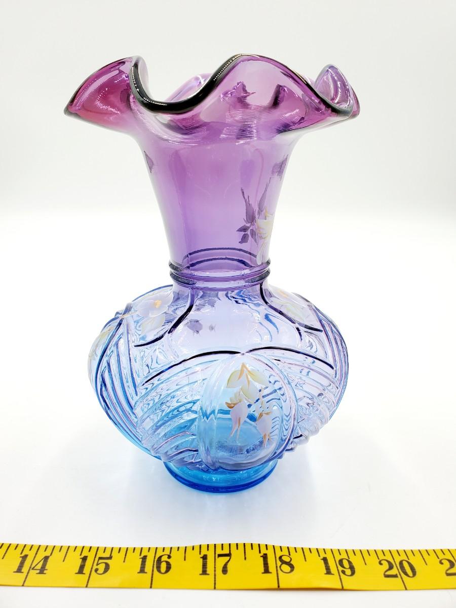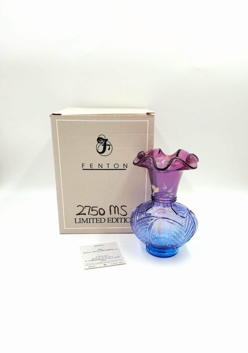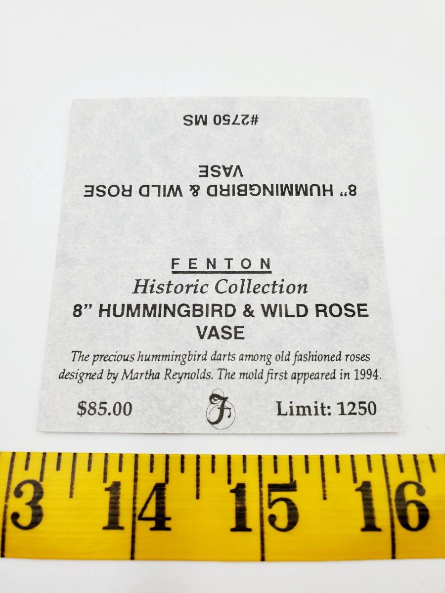 FENTON 1996 HISTORIC COLLECTION LIMITED EDITION 8" HUMMINGBIRD & WILD ROSE MULBERRY VASE WITH ORIGINAL BOX