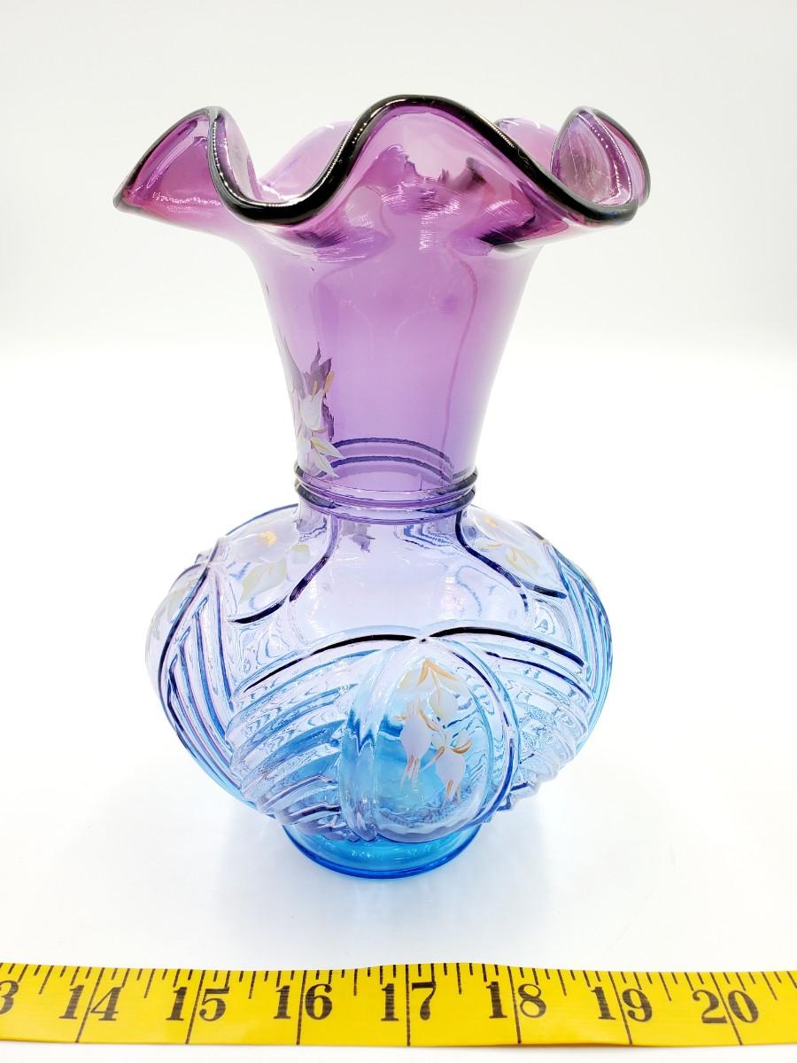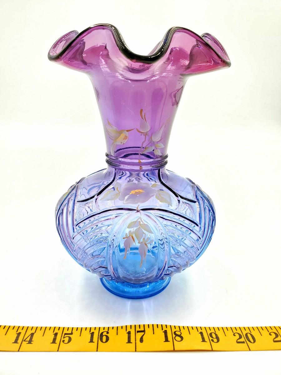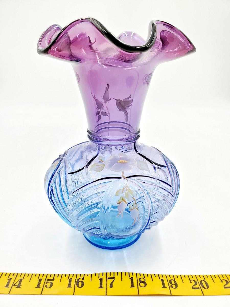 FENTON 1996 HISTORIC COLLECTION LIMITED EDITION 8" HUMMINGBIRD & WILD ROSE MULBERRY VASE WITH ORIGINAL BOX