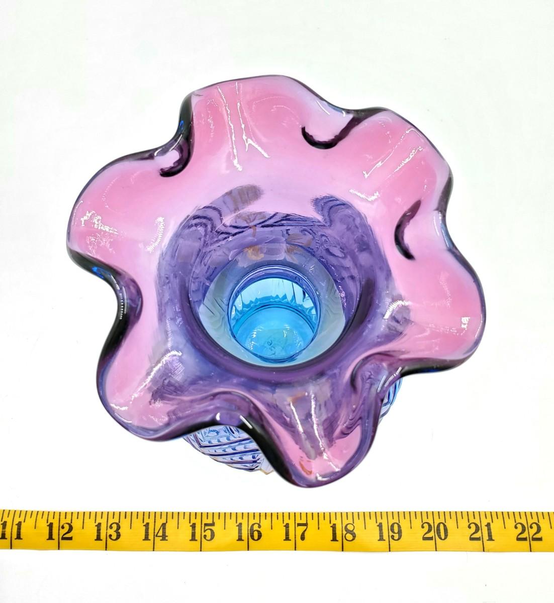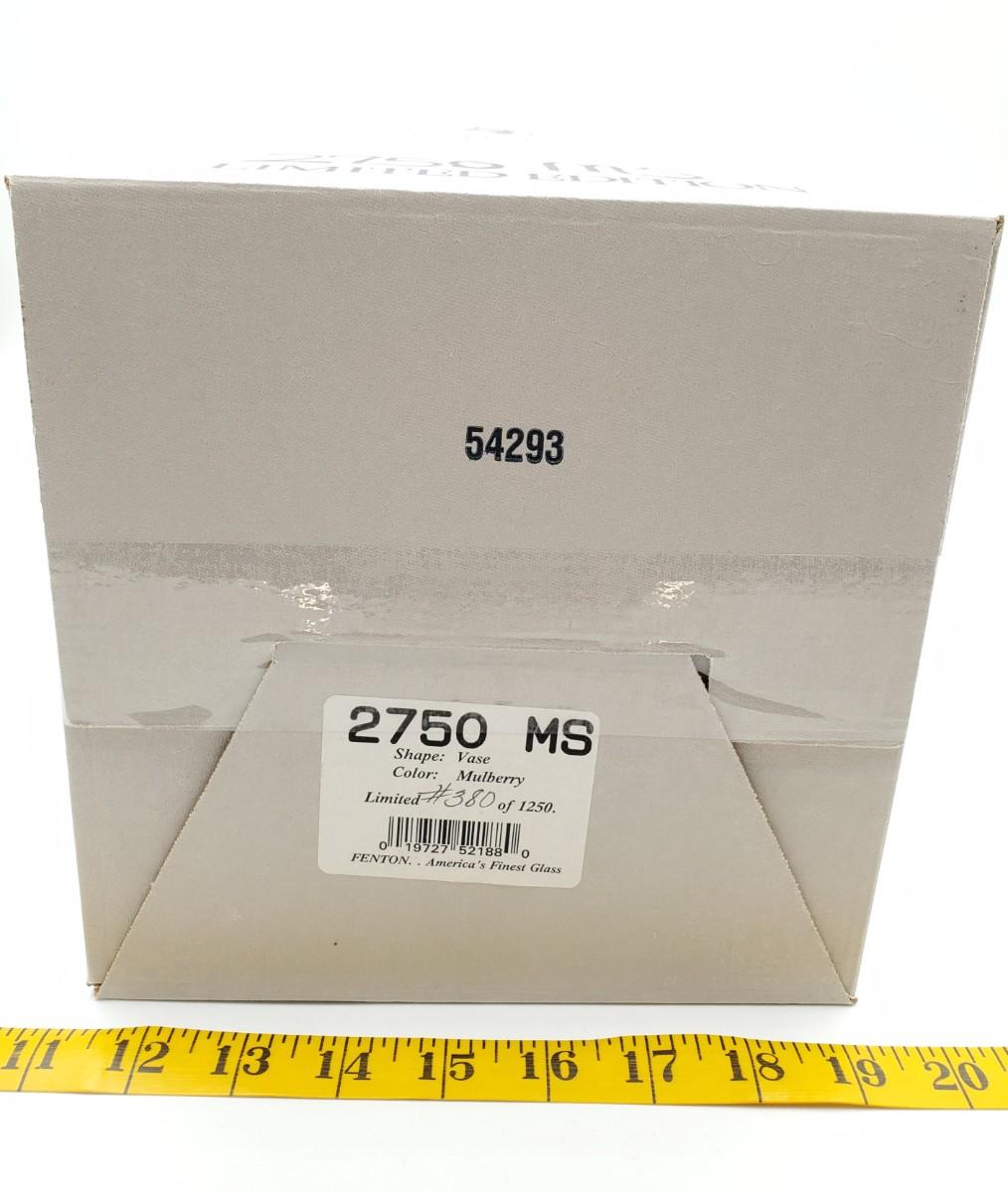 This historic collection limited edition #380/1250 piece is hand painted and signed. 8in Hummingbird & Wild Rose mulberry colored glass vase is in very good condition, does have clear tape over stickers on bottom.. Information card included as well as original box. Box has been written on but in otherwise good condition.