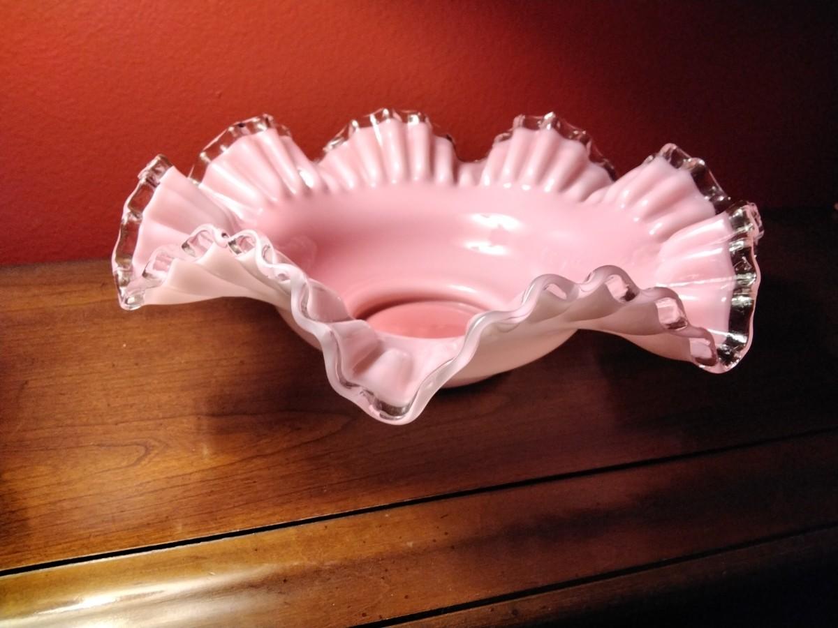 FENTON Pink & White 10” Bridal Glass Bowl Basket Silver crest