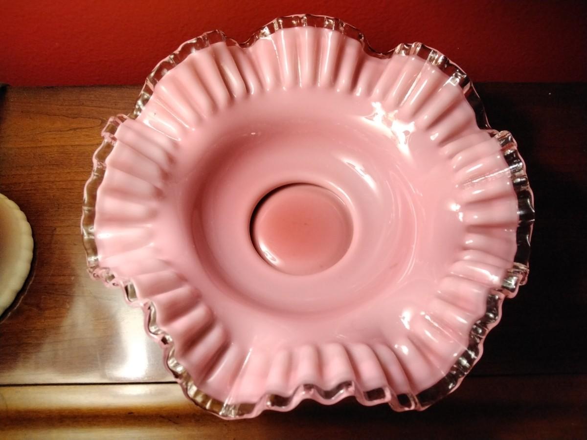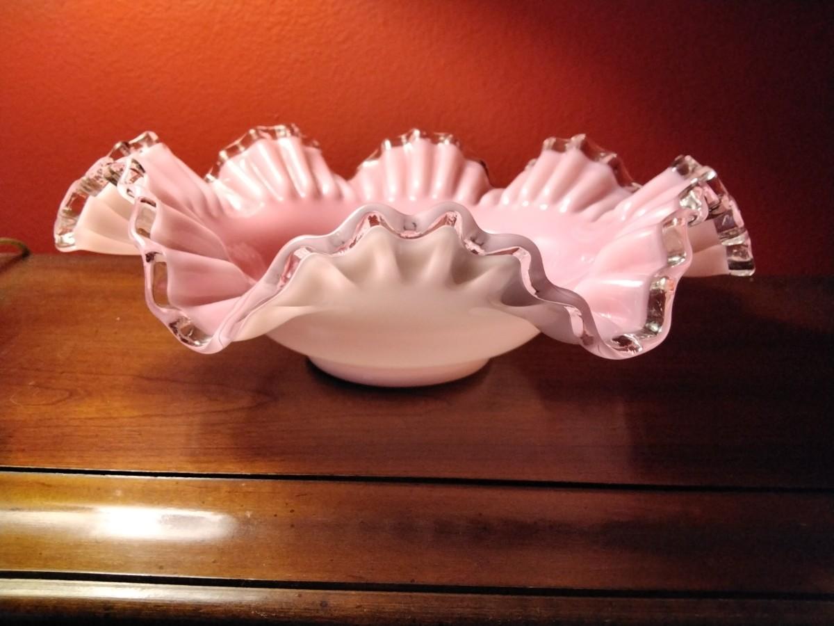 Fenton Bridal Bowl pink hand painted with Silver Crest edging. Very hard piece to find the 10 x 10 and 4 inches high. No damage nor cracks, this piece is beautiful.