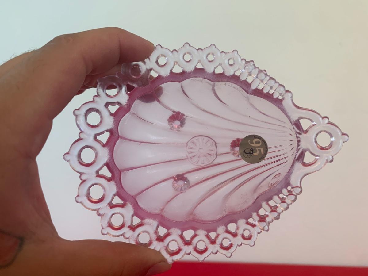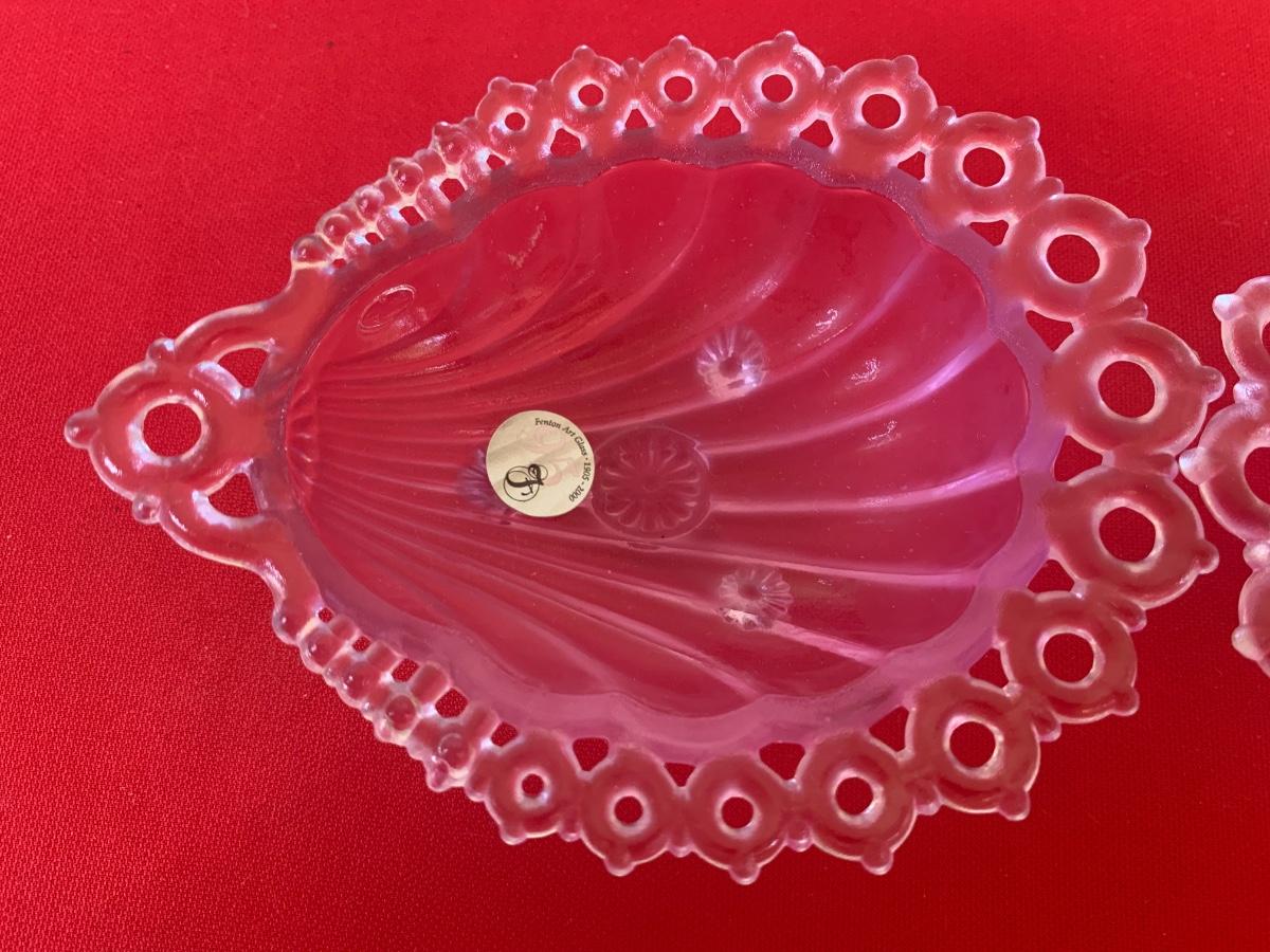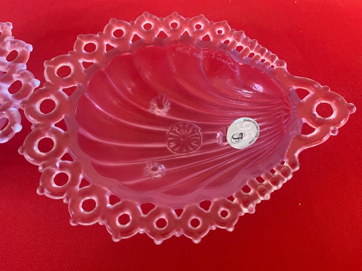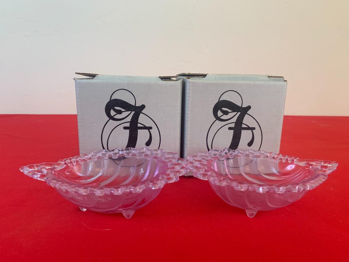 Lot includes two purple glass Fenton scalloped sea shell dishes with feet. Both pieces are signed and dated 2000 and in original boxes. 5” long