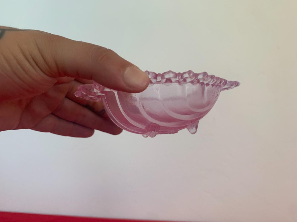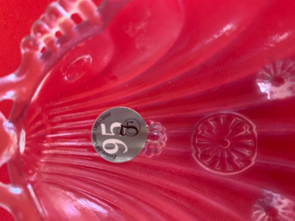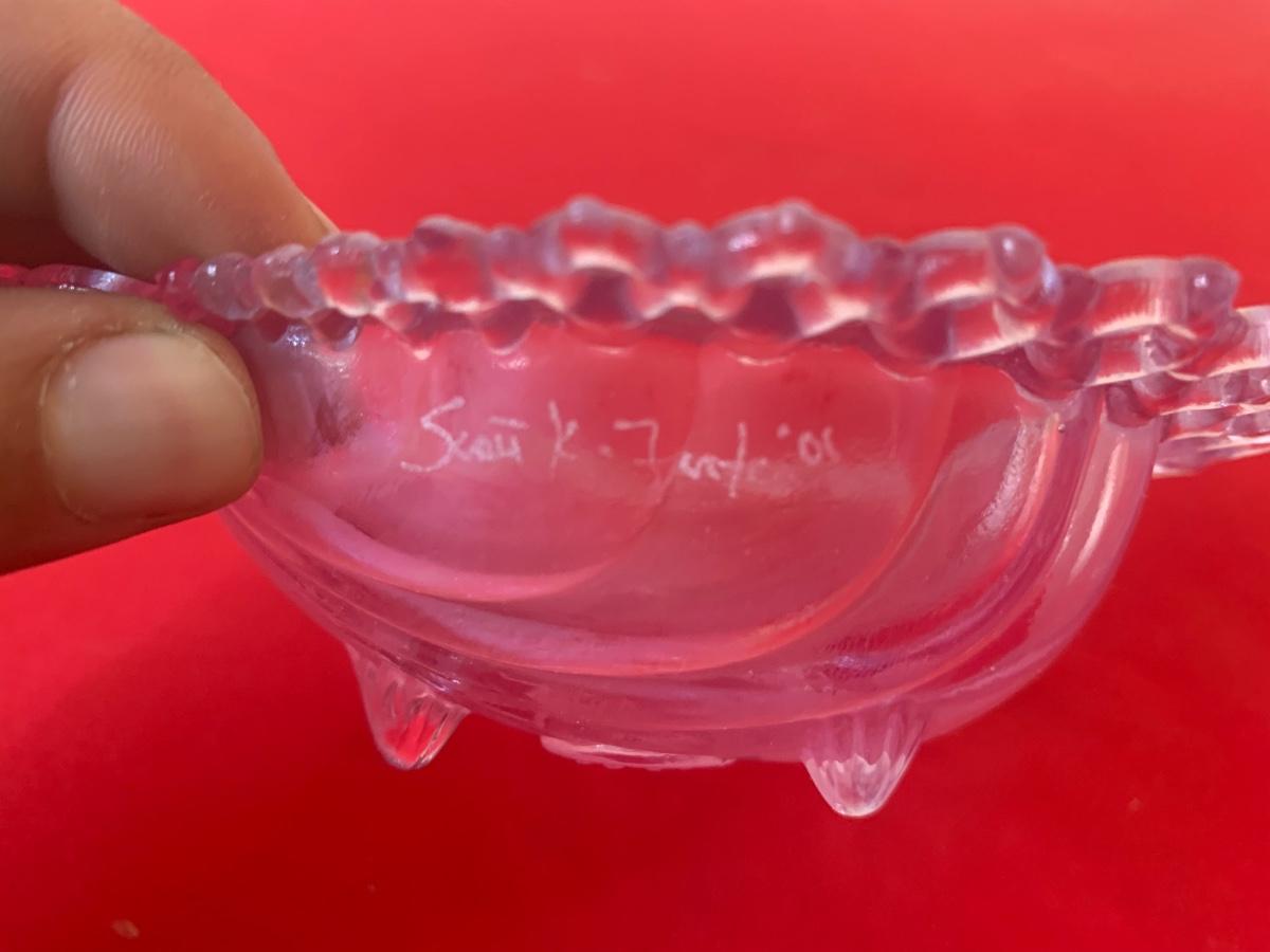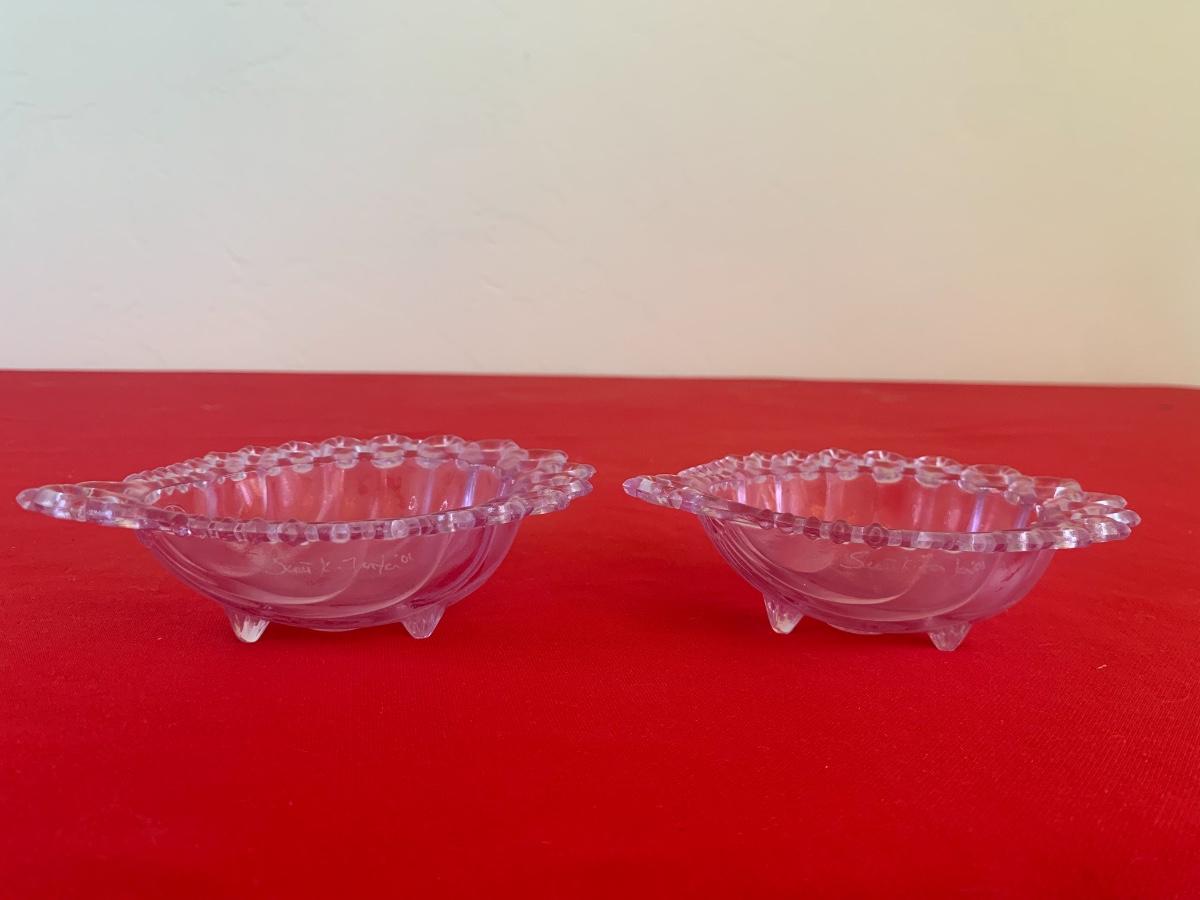 Lot includes two purple glass Fenton scalloped sea shell dishes with feet. Both pieces are signed and dated 2000 and in original boxes. 5” long