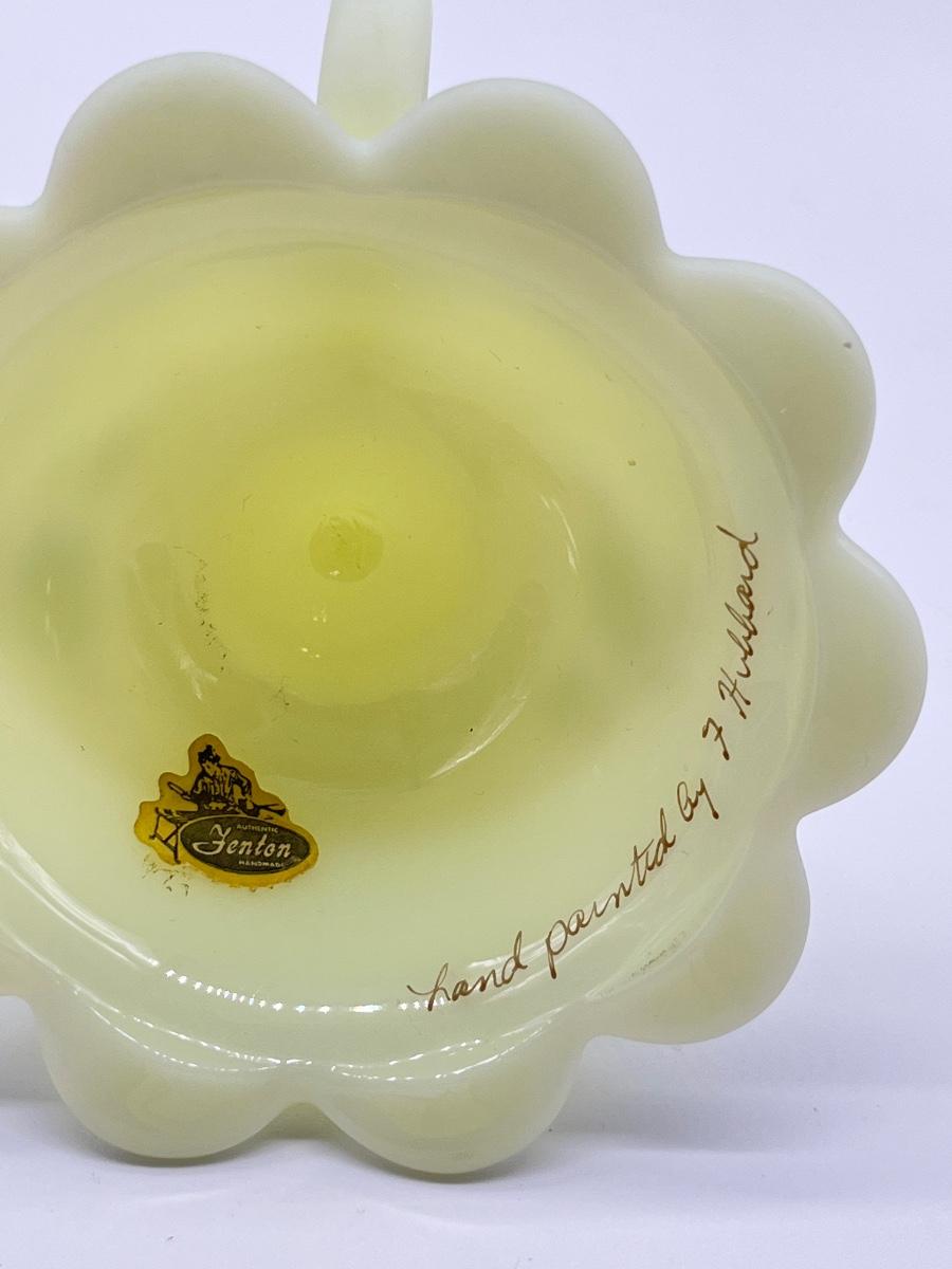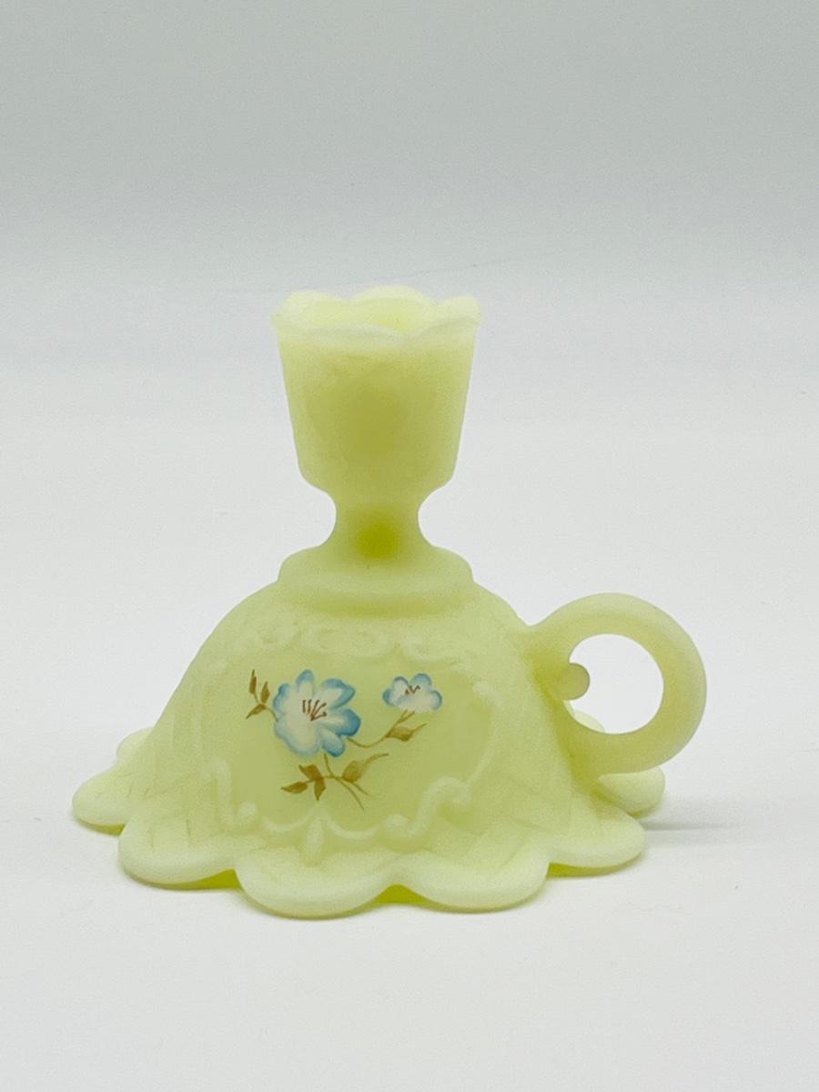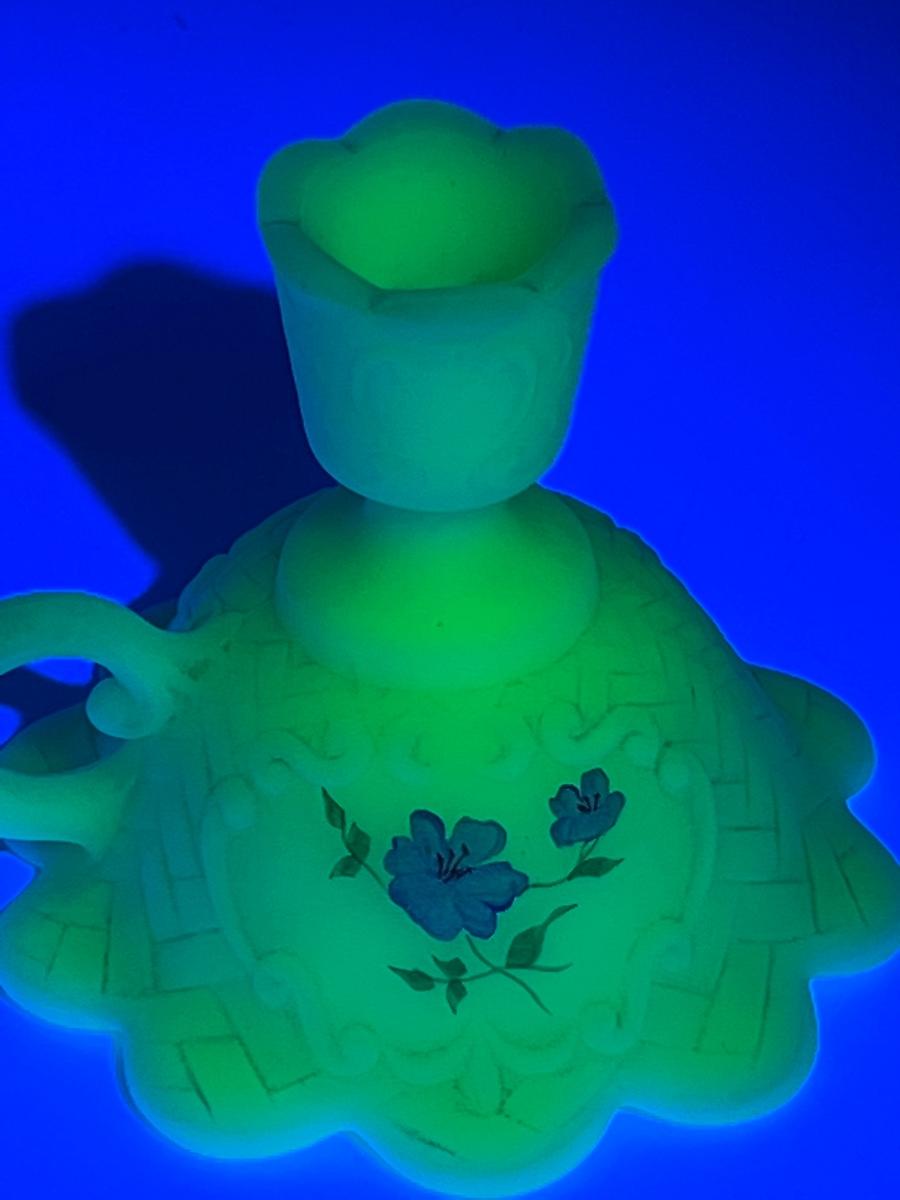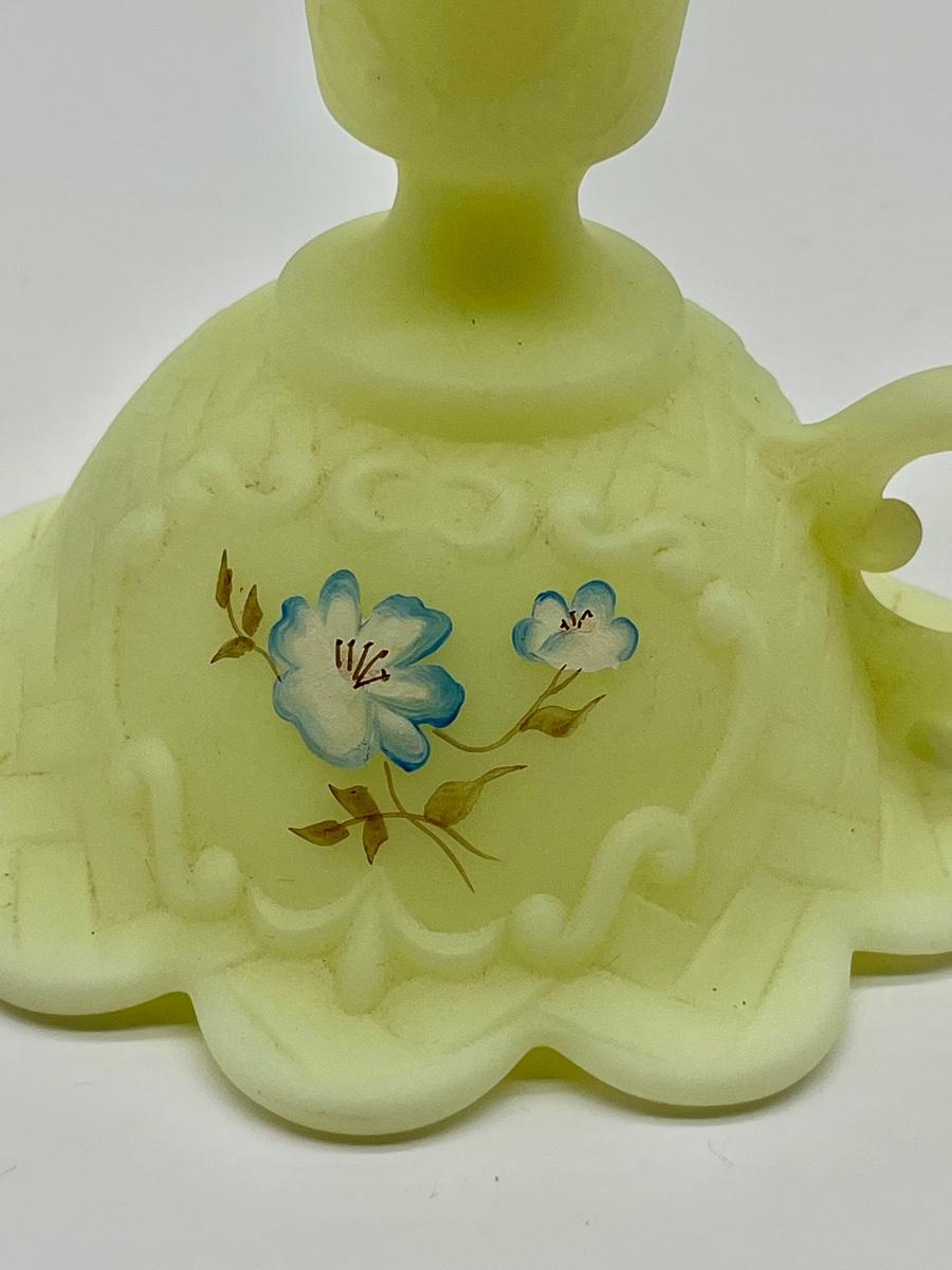 FENTON ~ Vaseline/Uranium Glass ~ Hand Painted Blue Roses & Signed Candelabra