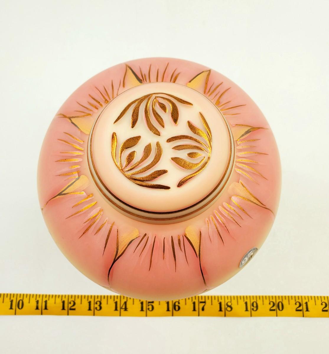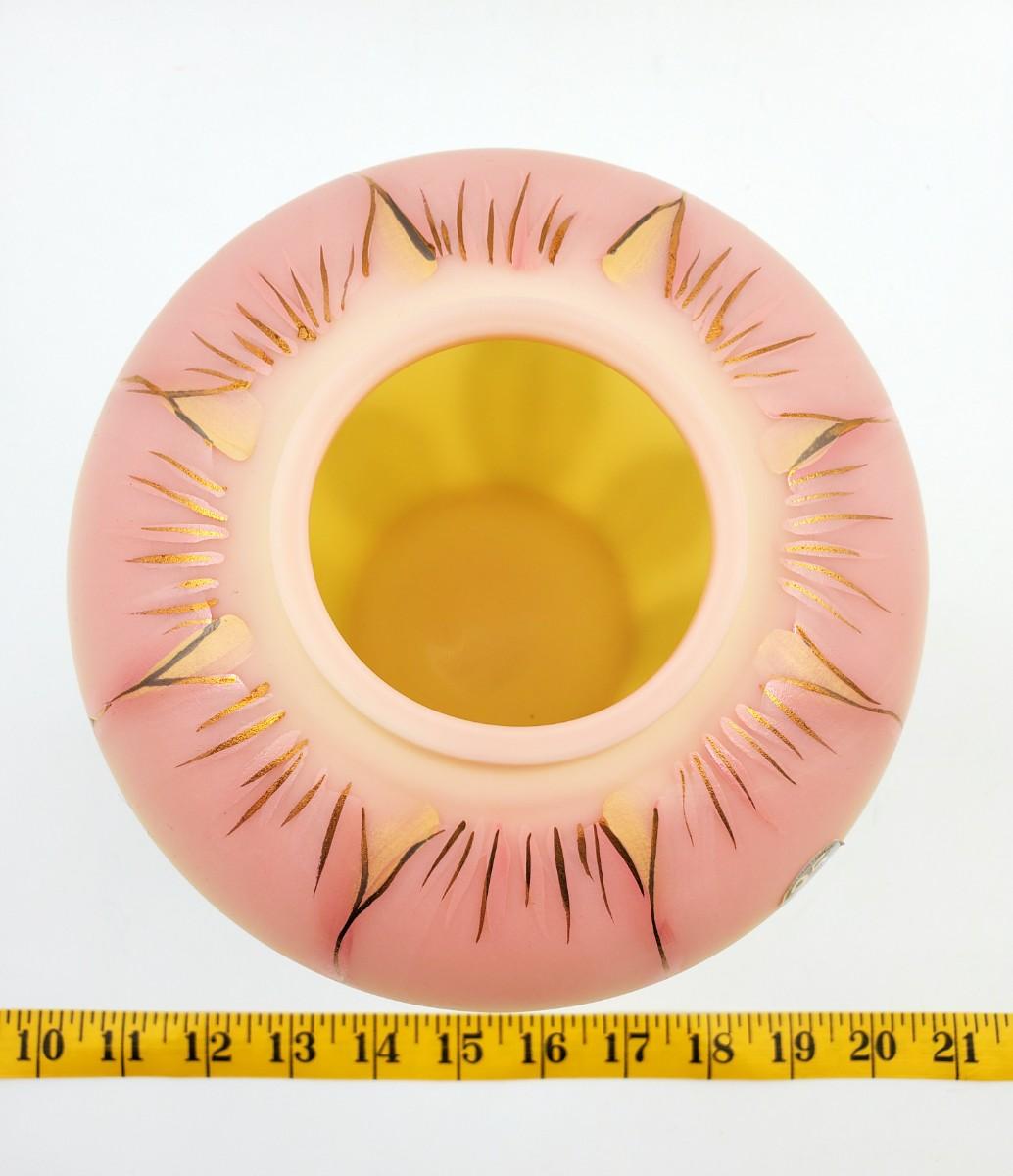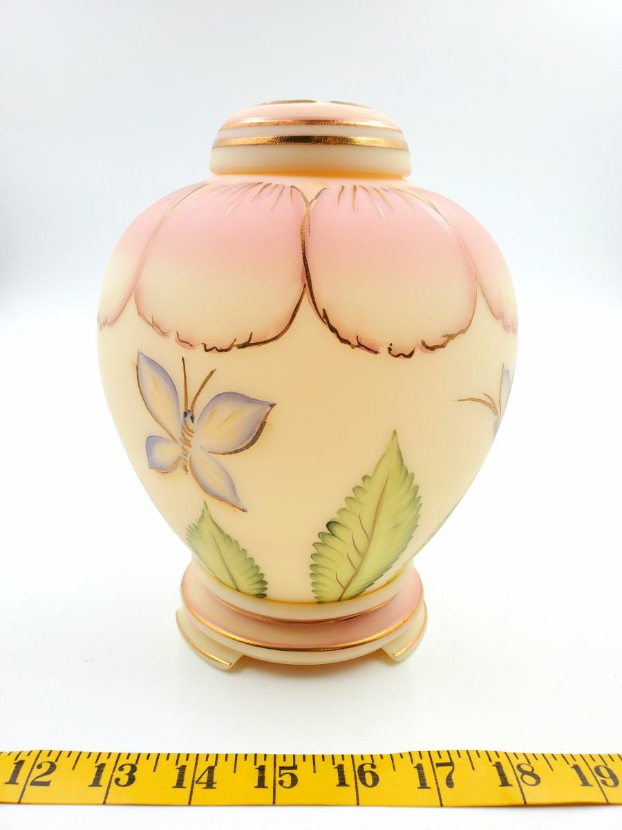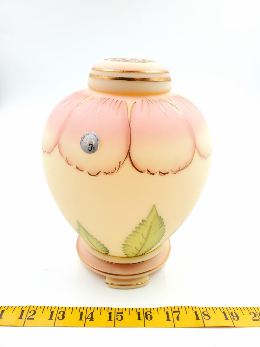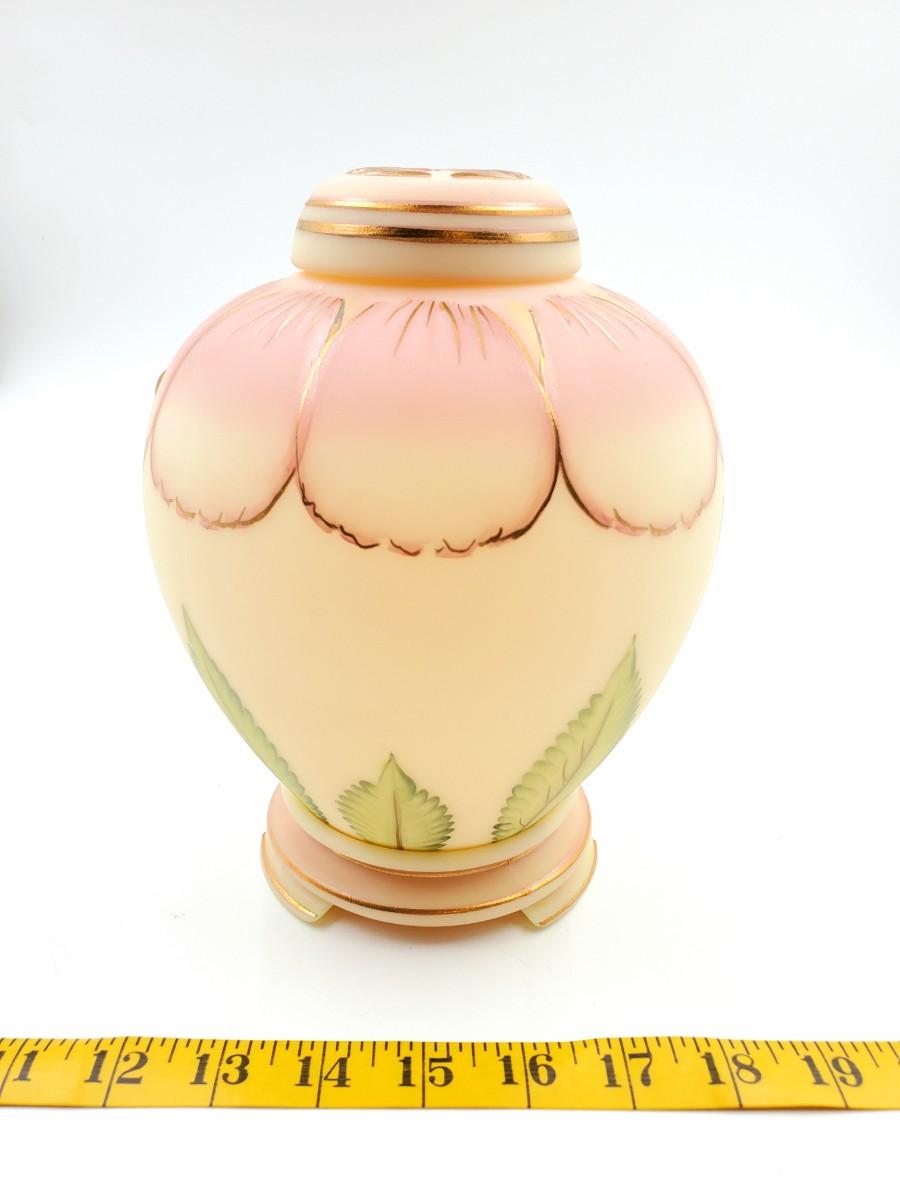 This Limited Edition 8inch "Daisy" Ginger Jar is made with burmese glass and hand painted. Robin Spindler's design of large daisy petals draped over the jar's neck includes 22 gold leaves and bands encircling the lid. Inscribed with 12 Fenton Family members on bottom, see photo. All in very good condition except the Fenton sticker on the side has begun to peal away around some of the edges, box included.