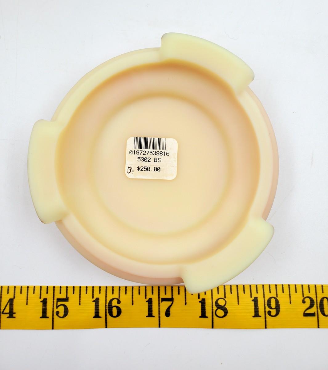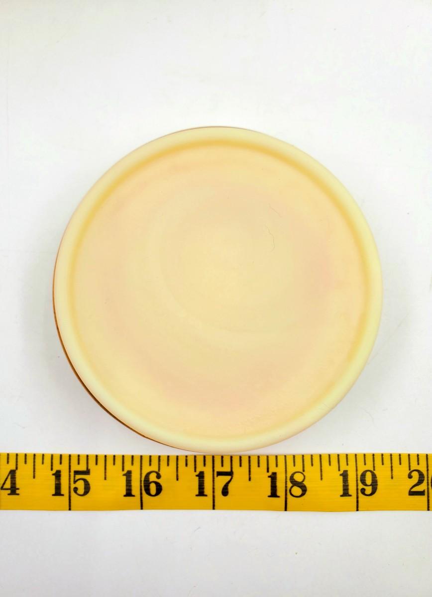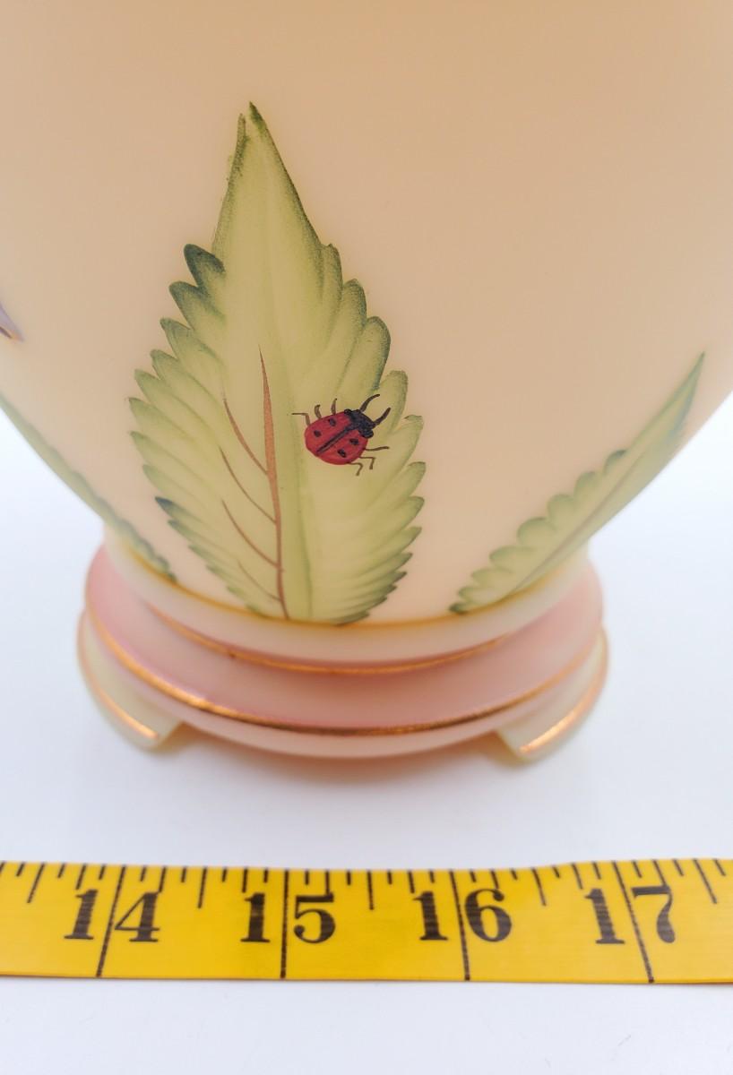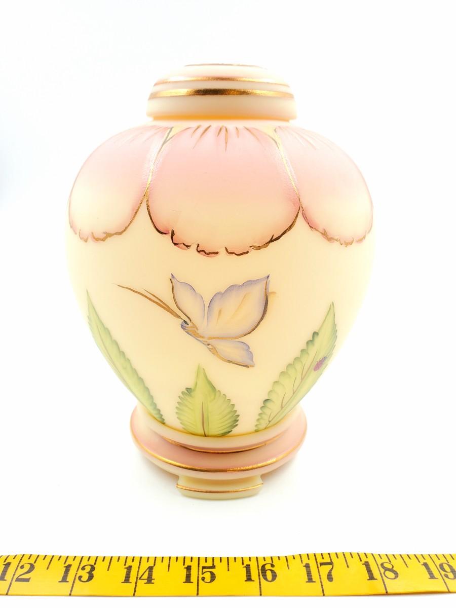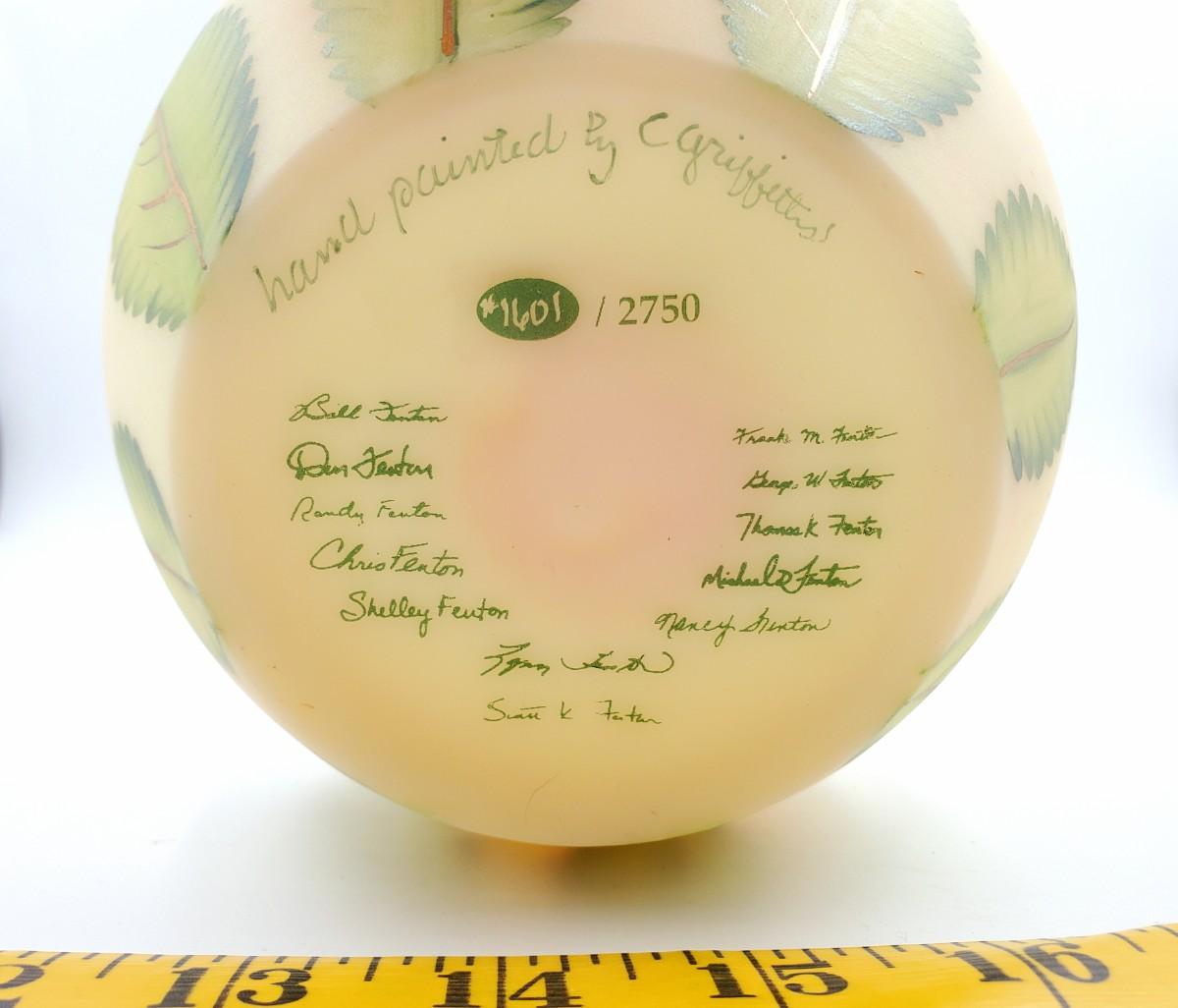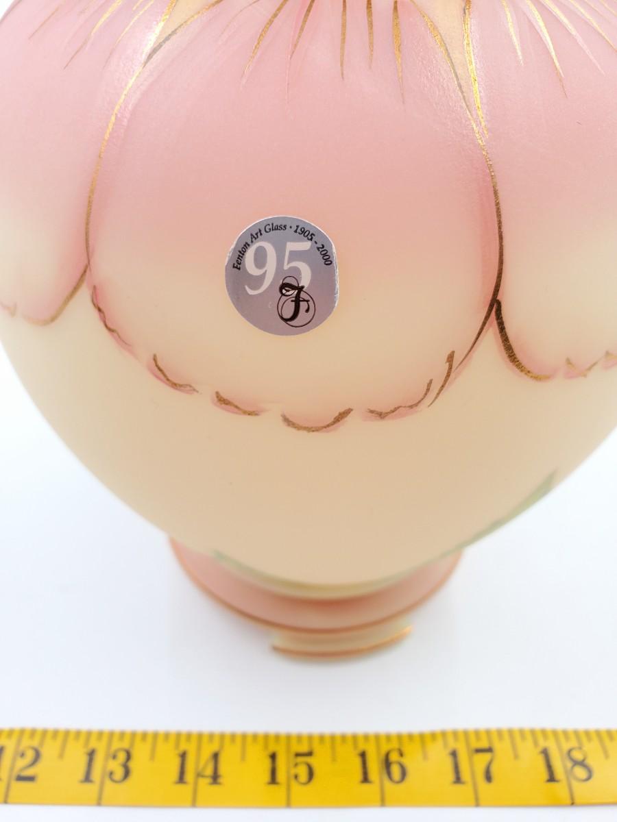 This Limited Edition 8inch "Daisy" Ginger Jar is made with burmese glass and hand painted. Robin Spindler's design of large daisy petals draped over the jar's neck includes 22 gold leaves and bands encircling the lid. Inscribed with 12 Fenton Family members on bottom, see photo. All in very good condition except the Fenton sticker on the side has begun to peal away around some of the edges, box included.