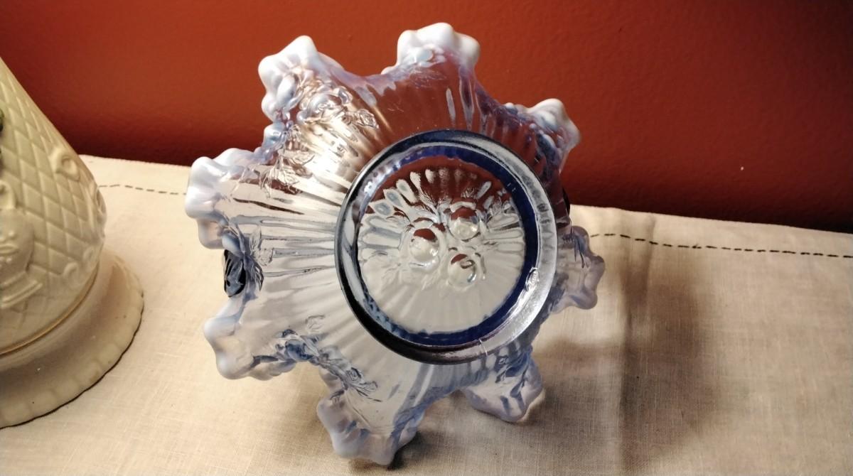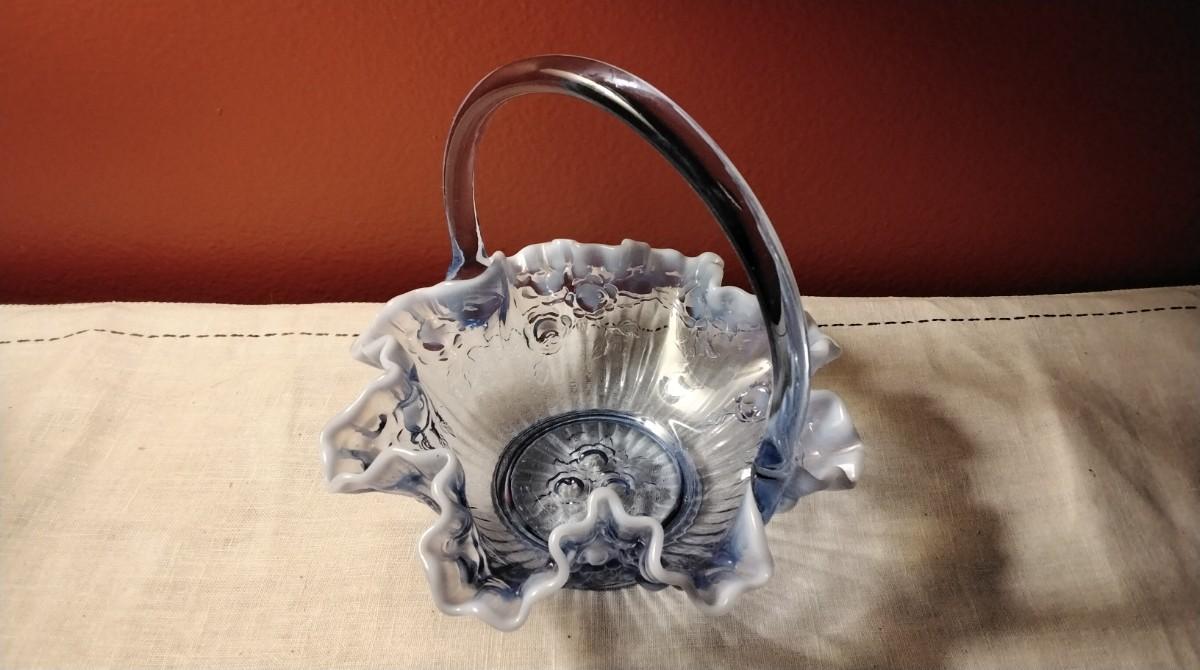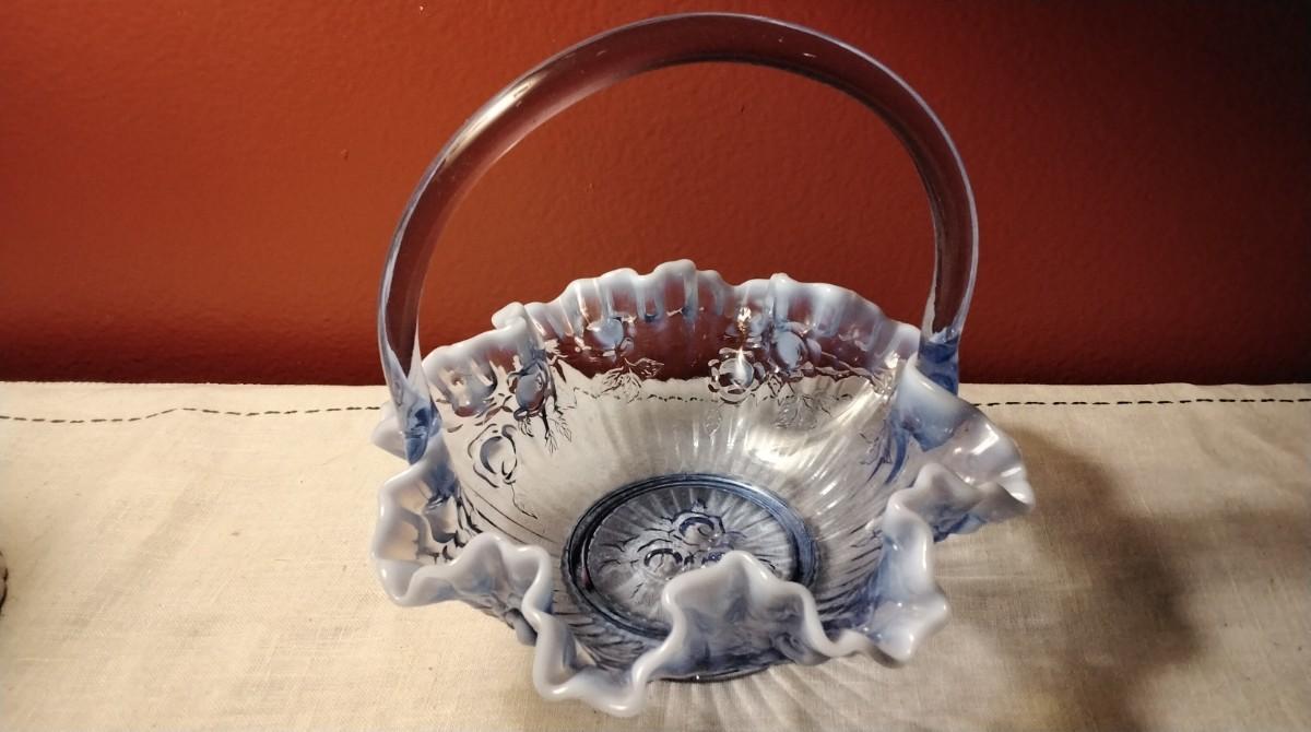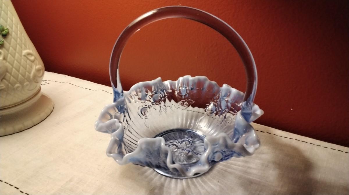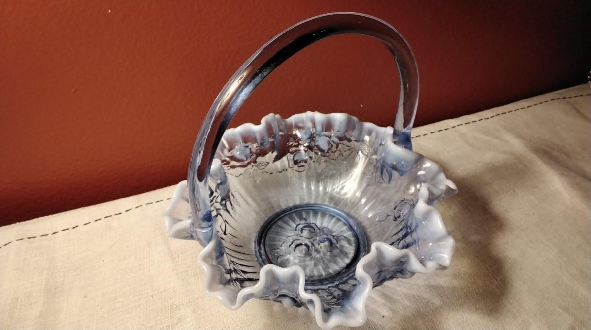 Rare Vintage Fenton Glass bride Basket Lavender Blue Opalescent Cabbage Rose Pattern