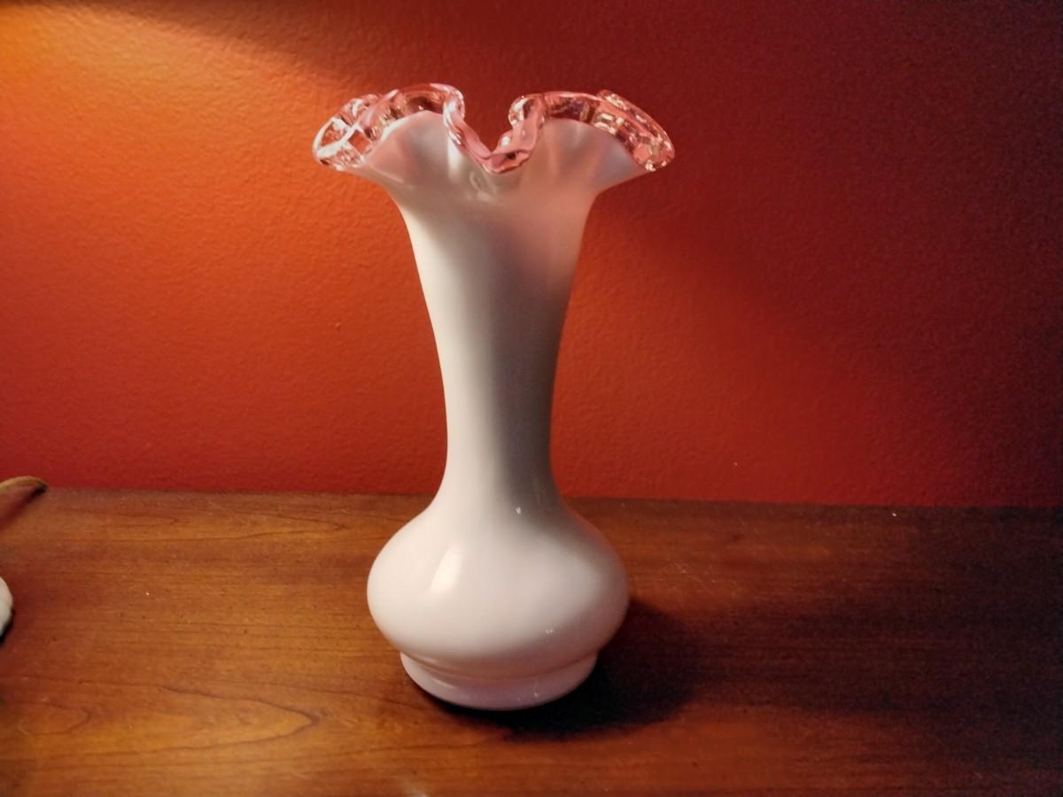 Gorgeous 8 inch Fenton Peach Crest Double Crimped Ruffled Vase, No chips or cracks, immaculate condition.