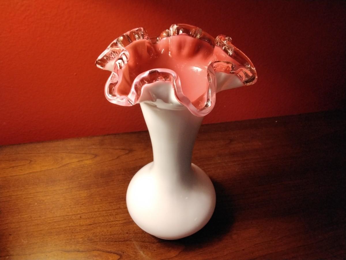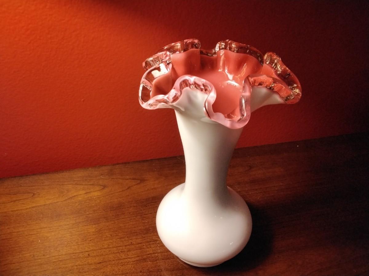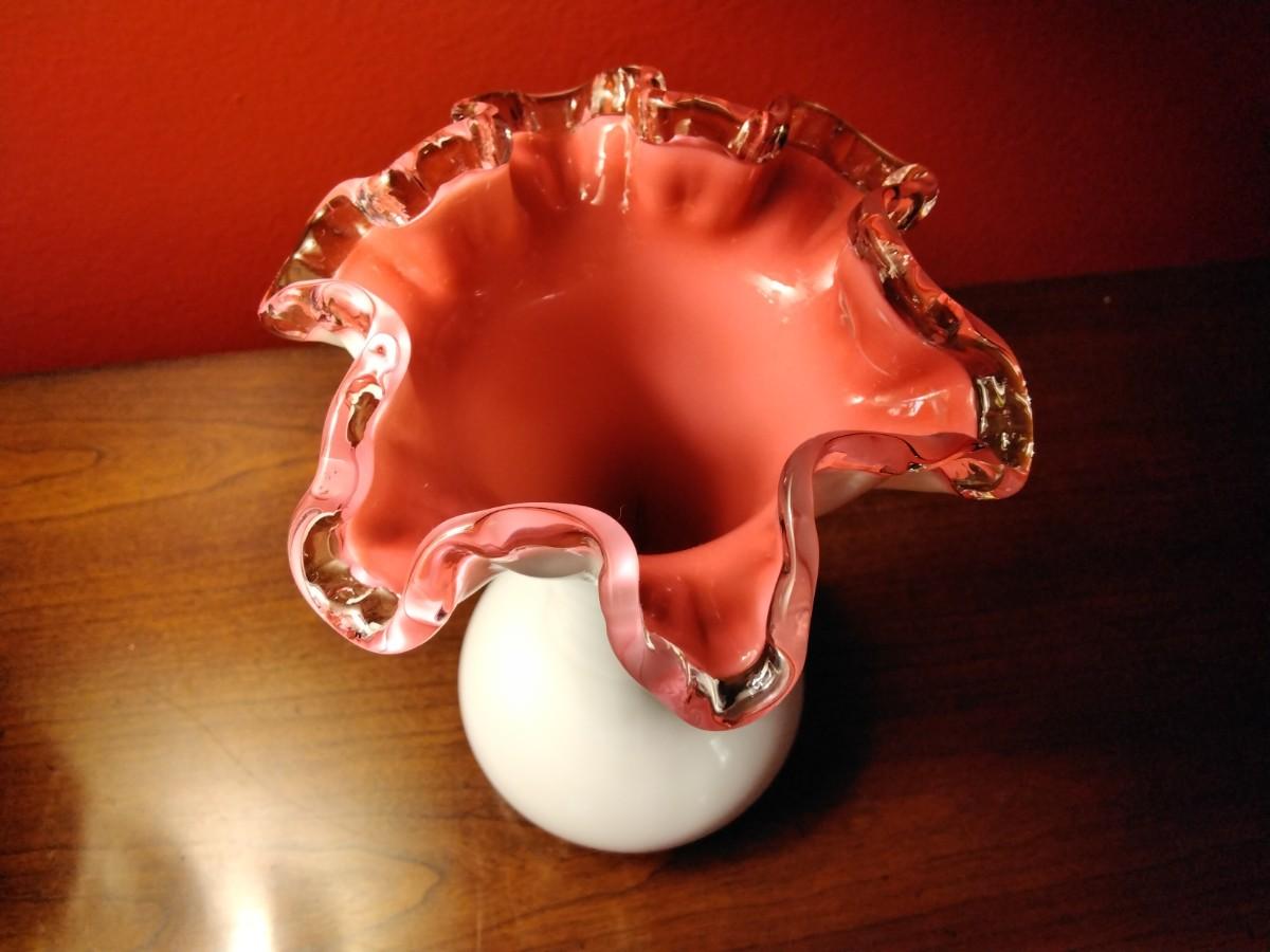 Fenton Peach Crest 8" Double Crimped Ruffled Vase Pink interior