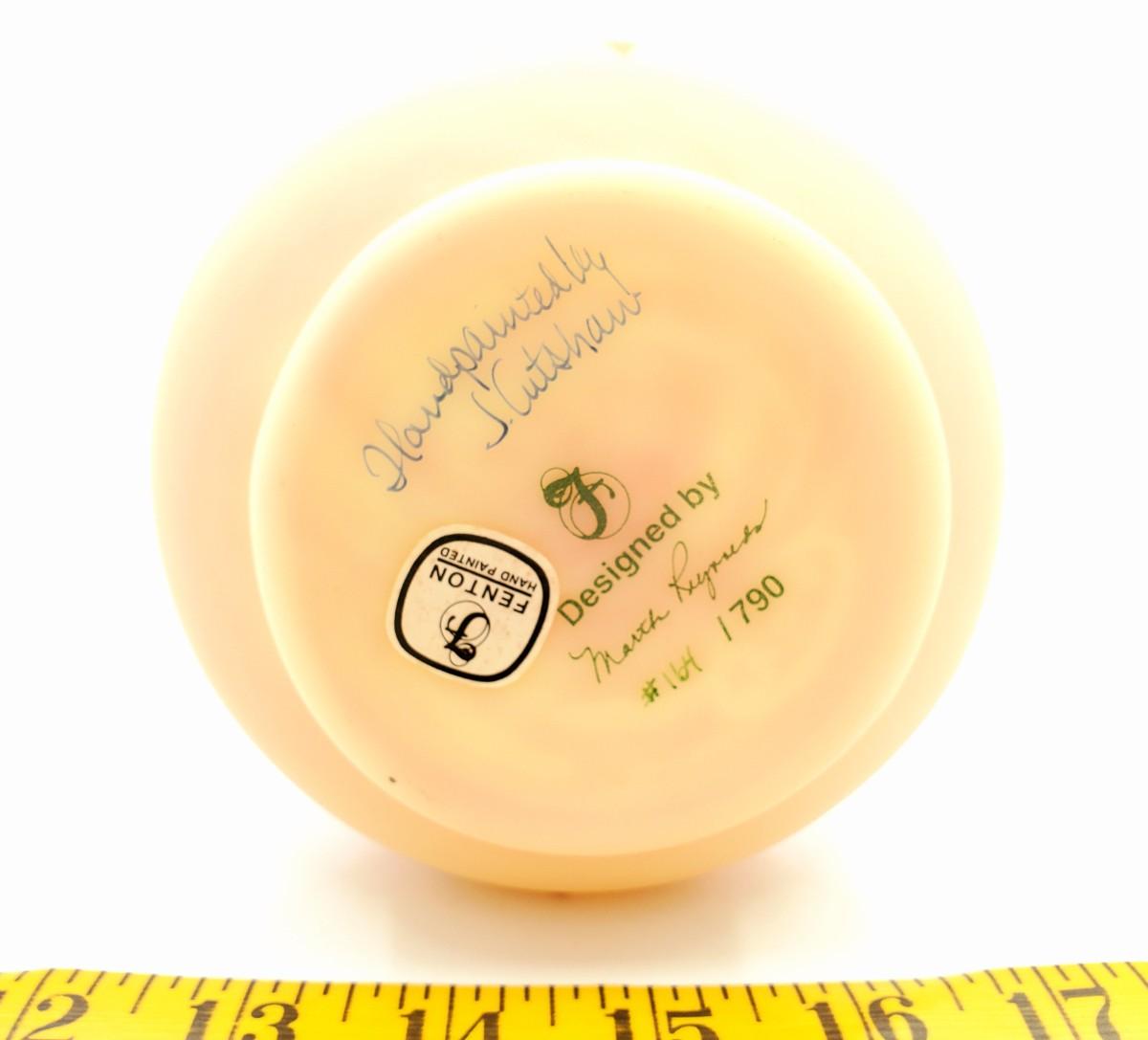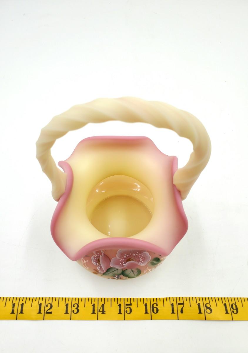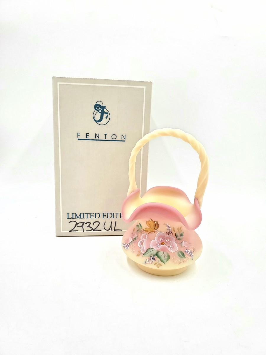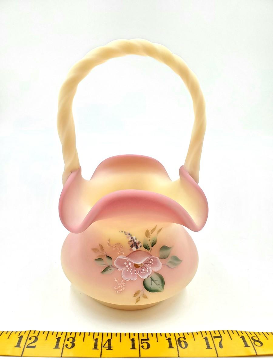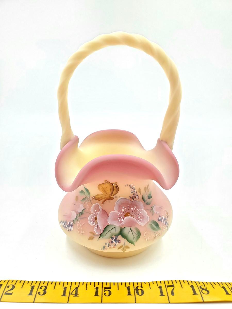 Gorgeous hand painted Fenton historical collection burmese glass butterfly basket, in very good condition. Signed on bottom. Original box included, has been written on otherwise good condition.