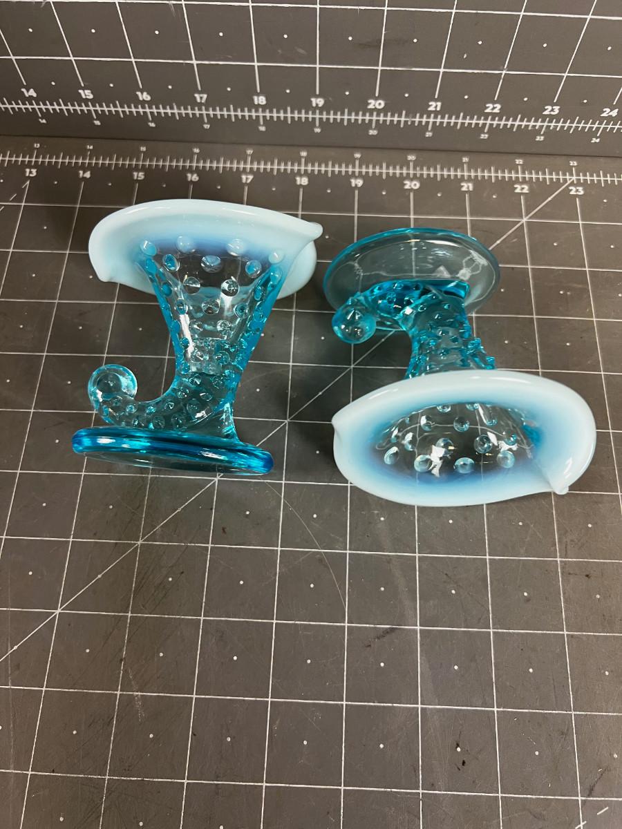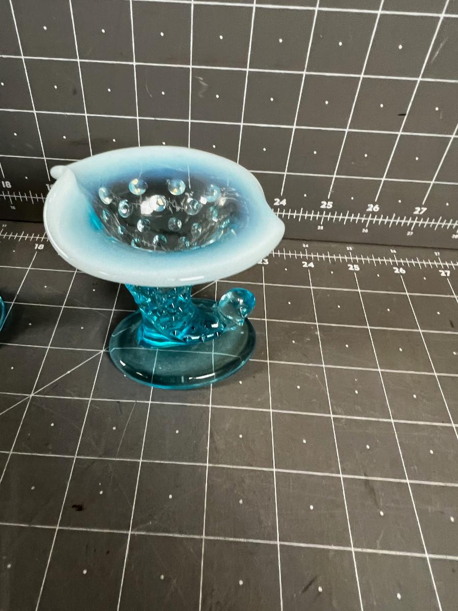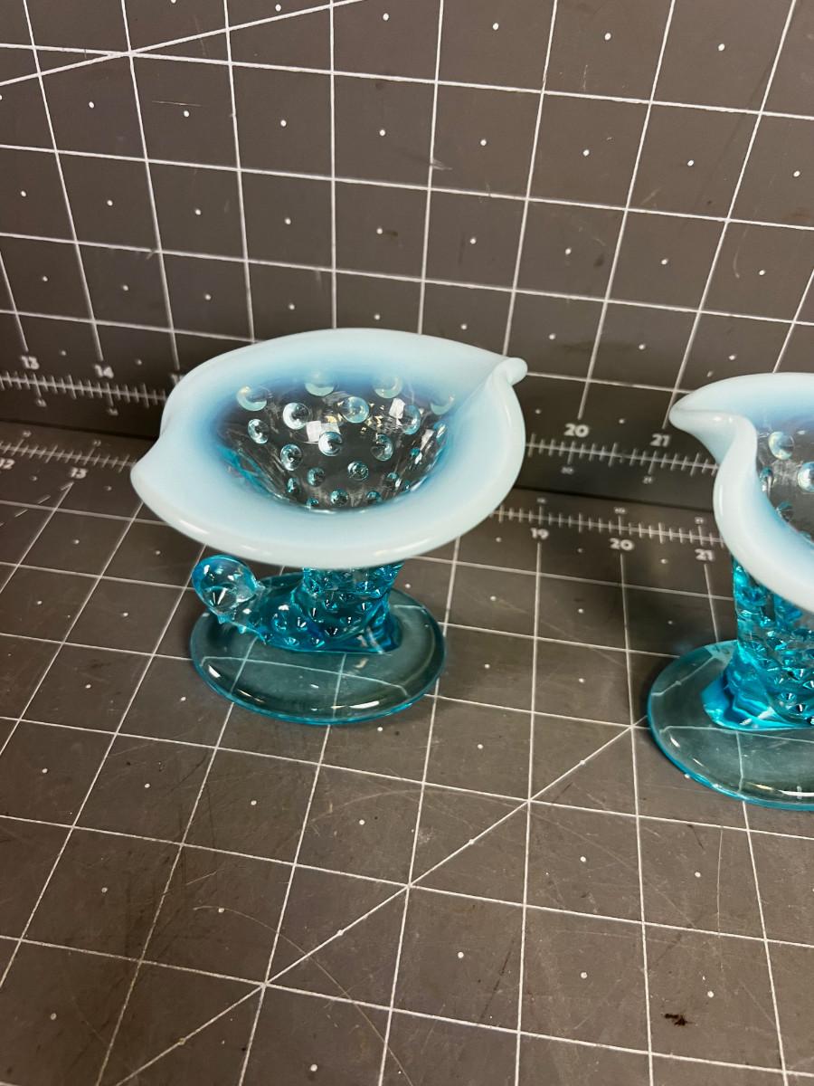 From the estate of a Fenton Art Glass collector here are a pair of small Blue Opalescent Hobnail Cornucopia Candleholders...Pristine condition...They stand 3.75" high and accommodate a taper candle...This popular mold blown colored glassware was produced by Fenton off and on for over forty years beginning in 1940...These candleholders would have been produced prior to 1980...Either numbered 3974 or 3971?...Offered with no reserve...