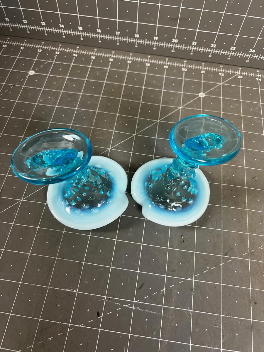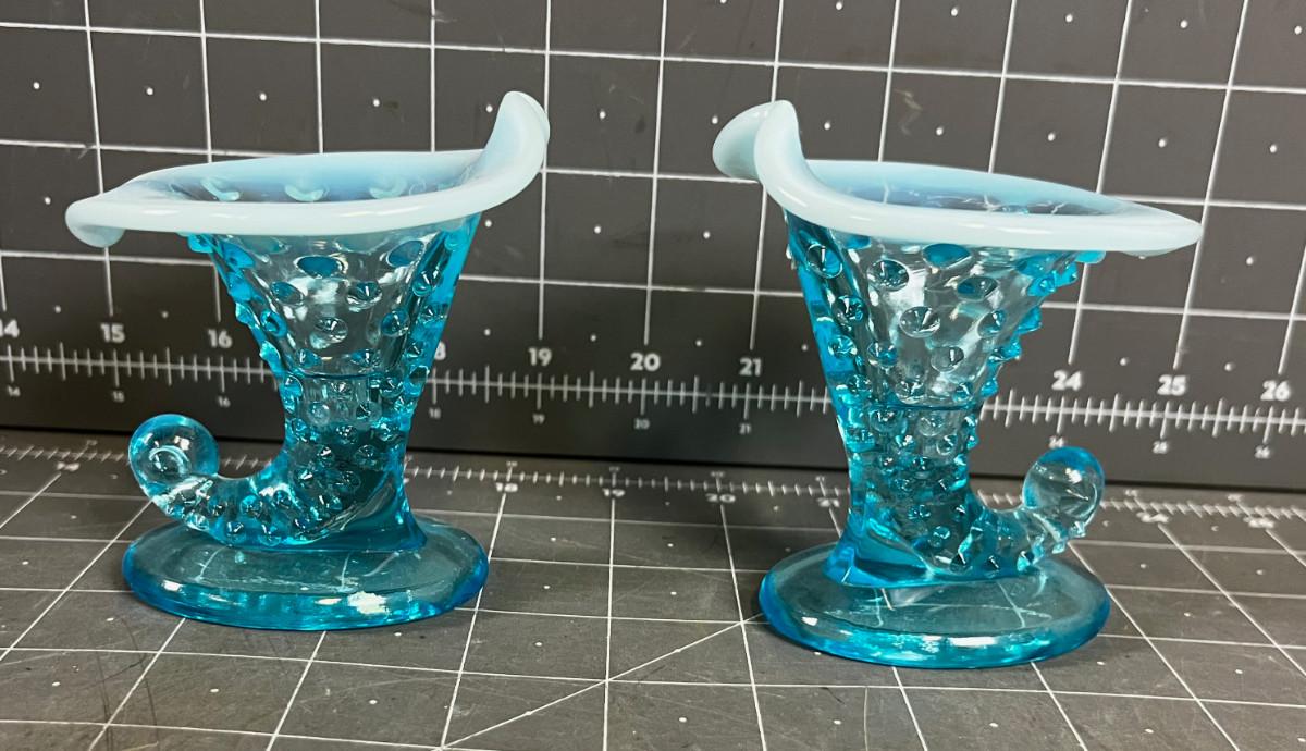 FENTON ART GLASS BLUE OPALESCENT CORNUCOPIA CANDLEHOLDER pair