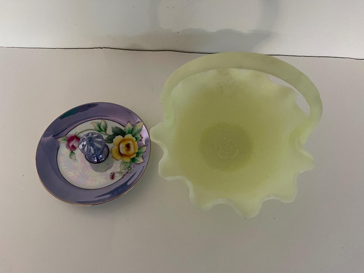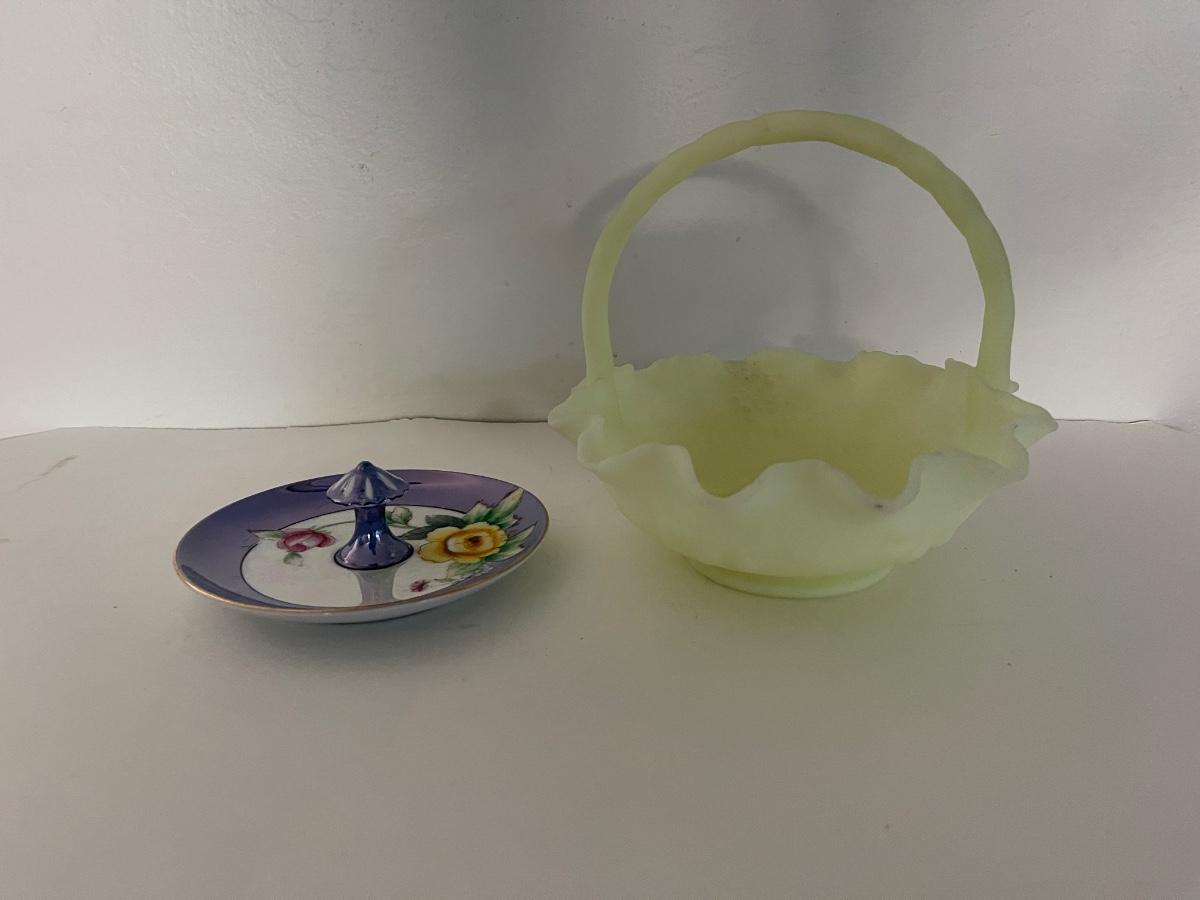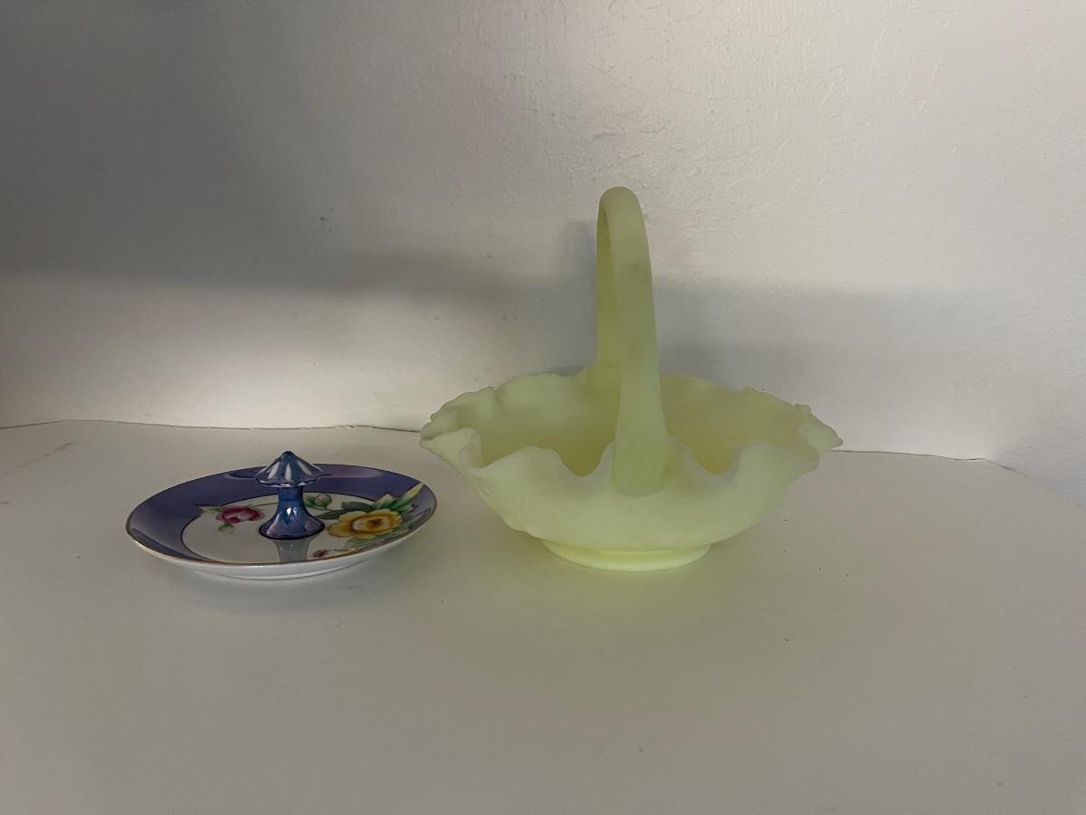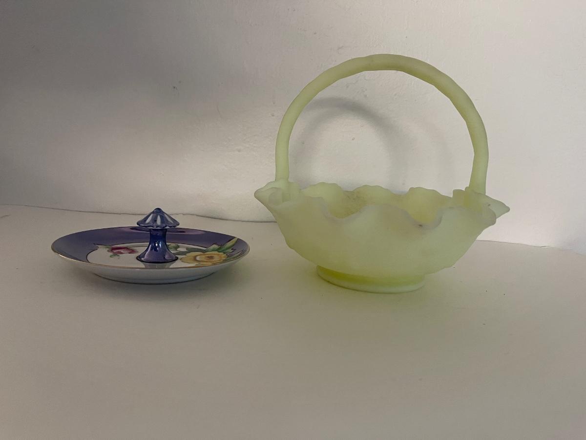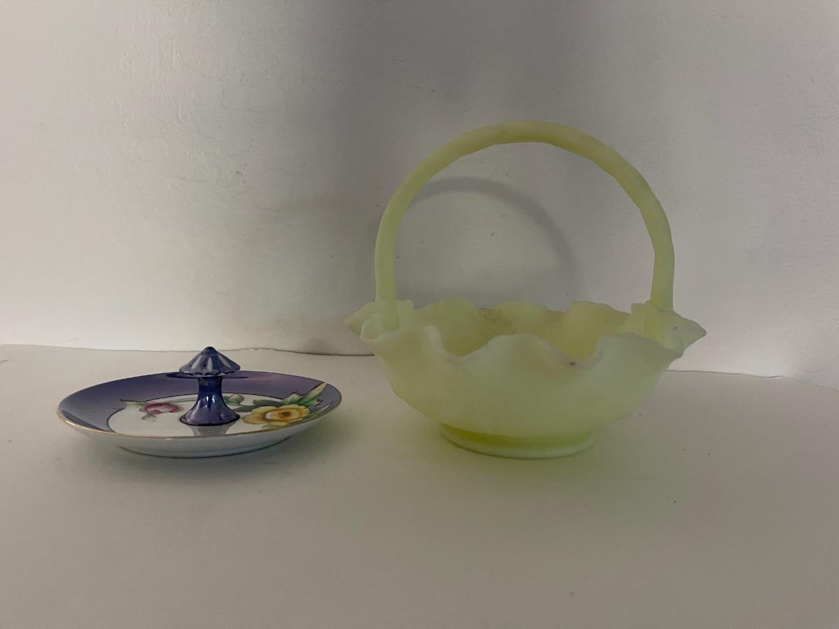 Glow in the dark Fenton basket "loganberry" and Trinket dish
