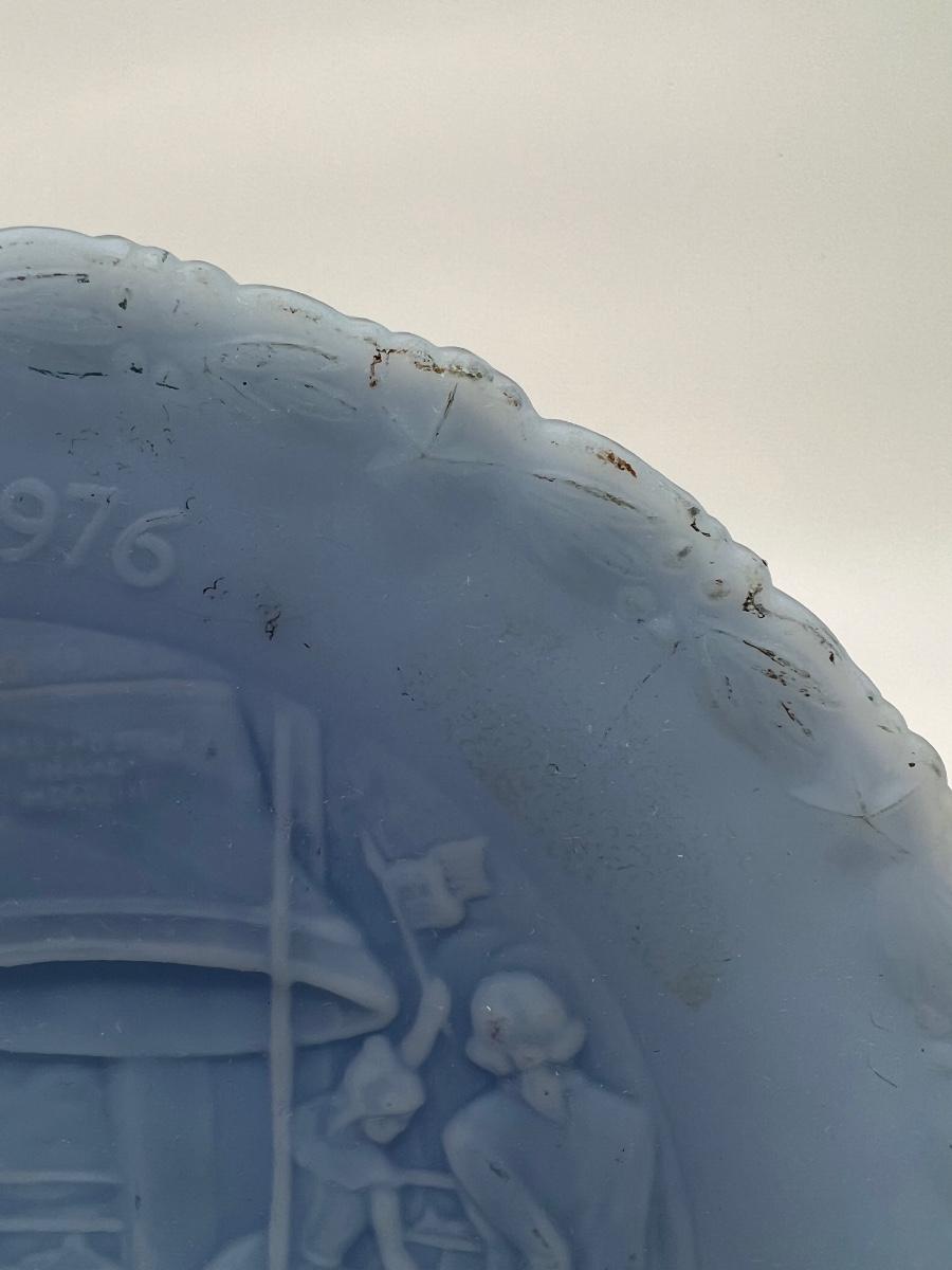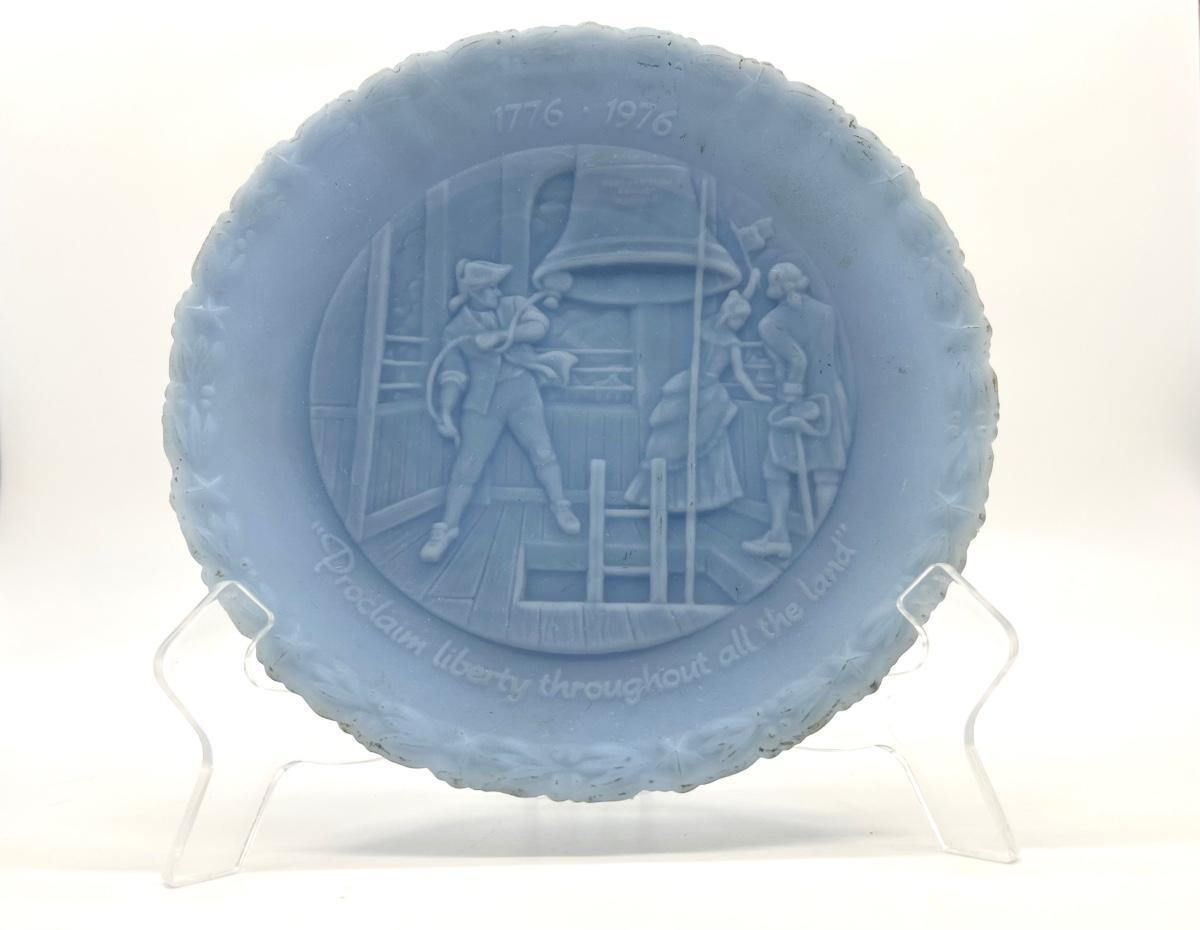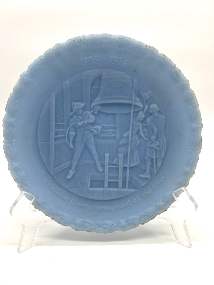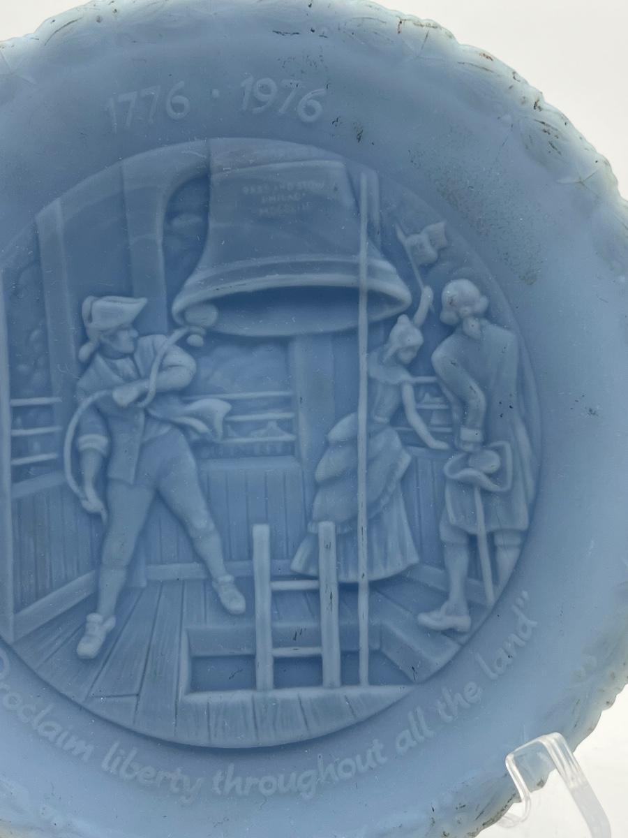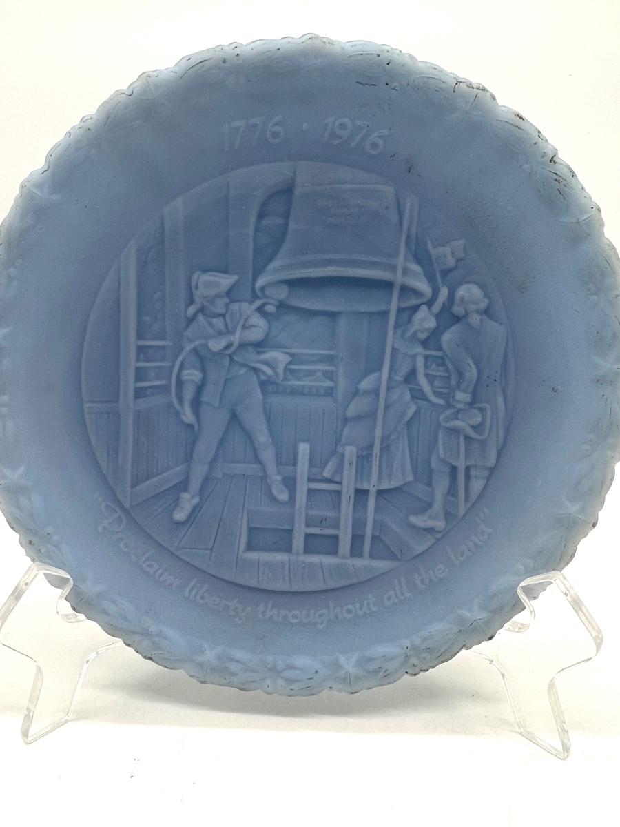 vintage Fenton Bicentennial Liberty Bell plate and clear stand color is blue satin glass, USA patriotic historical scene. The plate shows some discoloration on the edges.