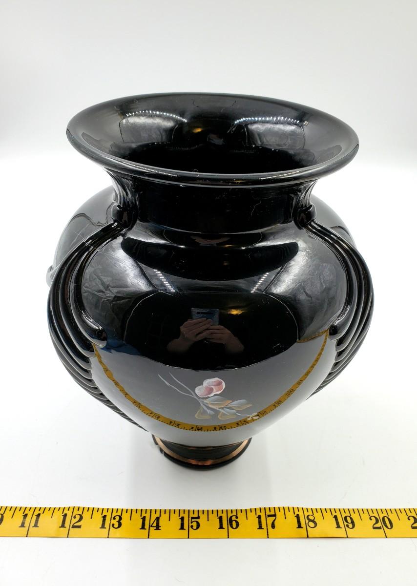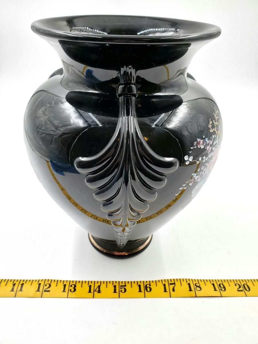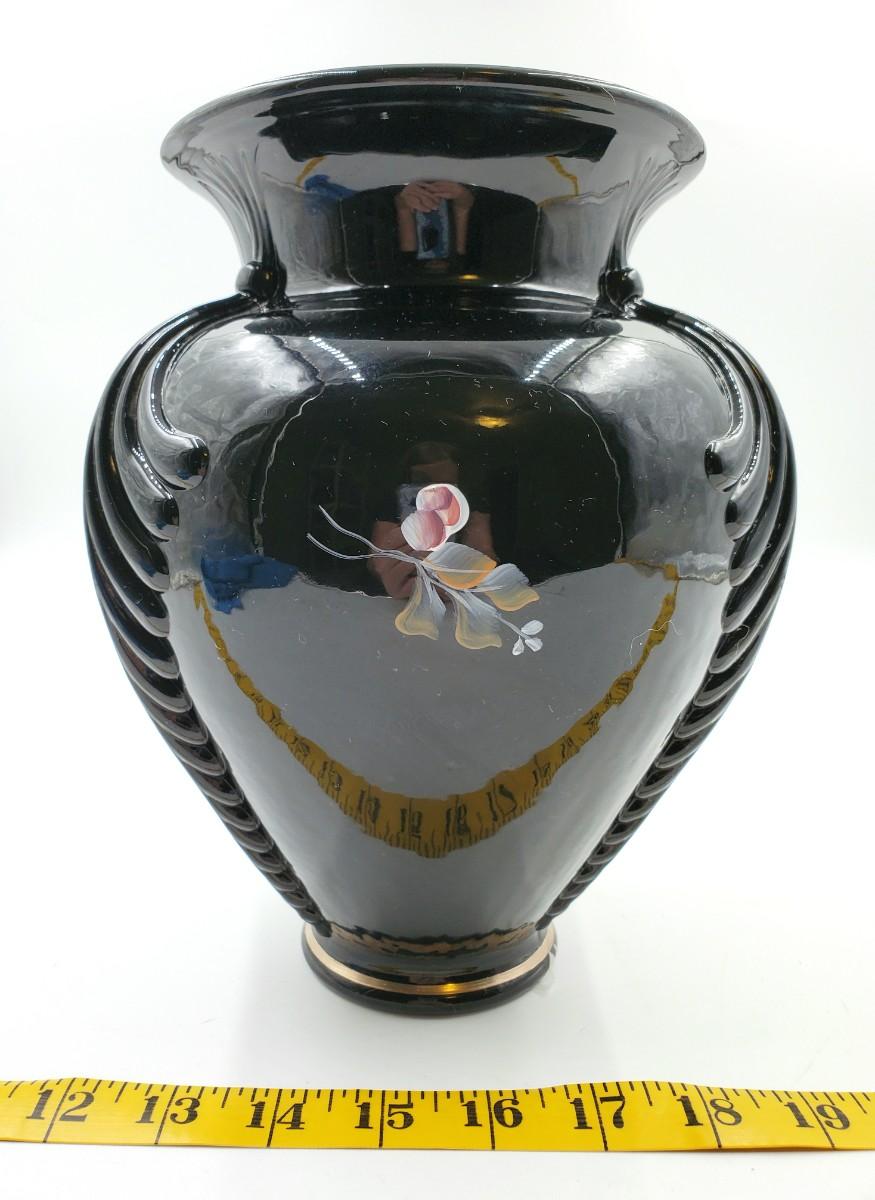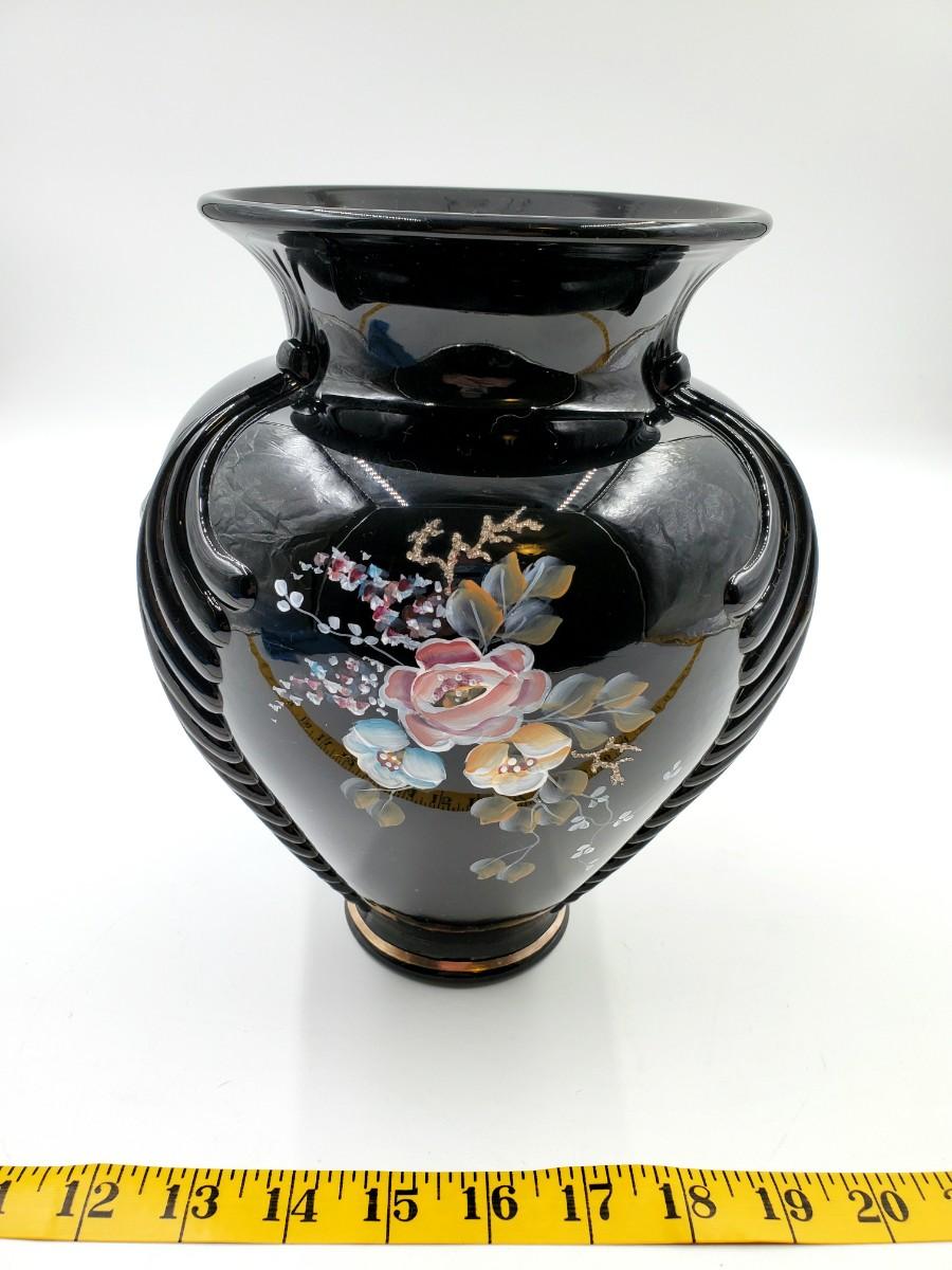 FENTON BLACK FEATHER VASE HAND PAINTED FLOWERS