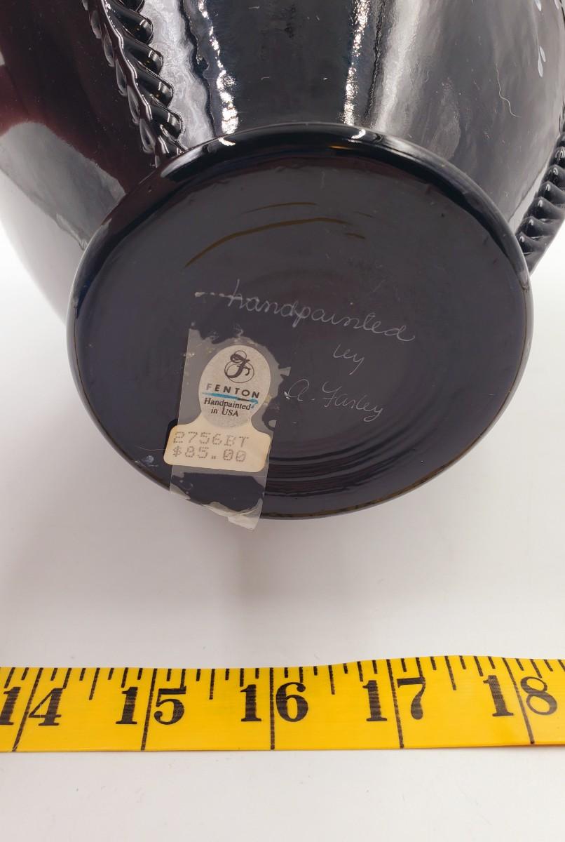 This elegant Fenton black feather vase has been hand painted with a pop of color. Signed on bottom, sticker has been taped on with scotch type tape otherwise in very good condition!