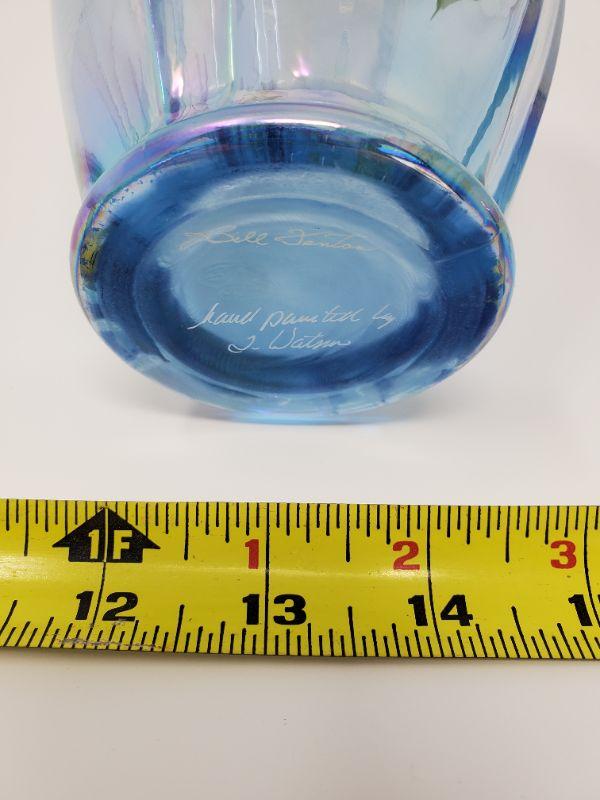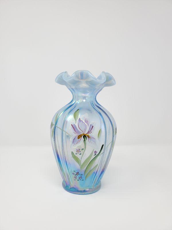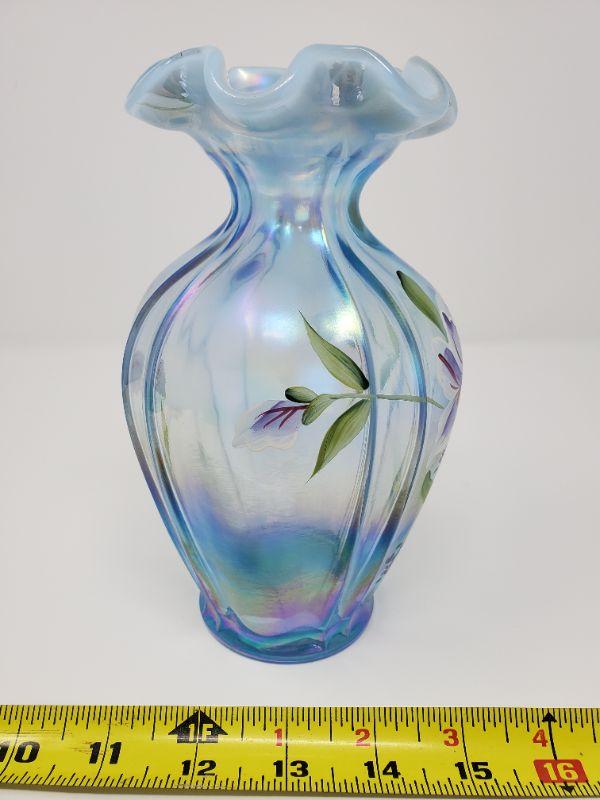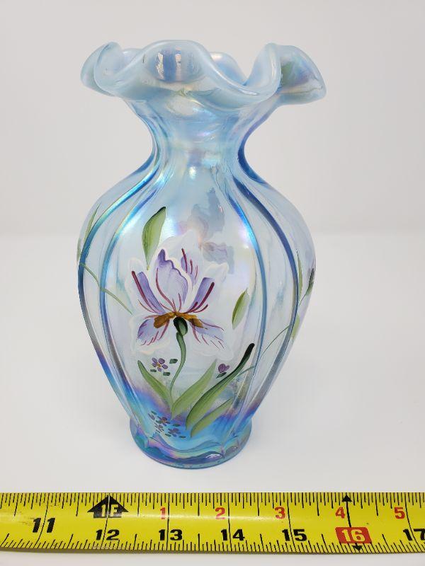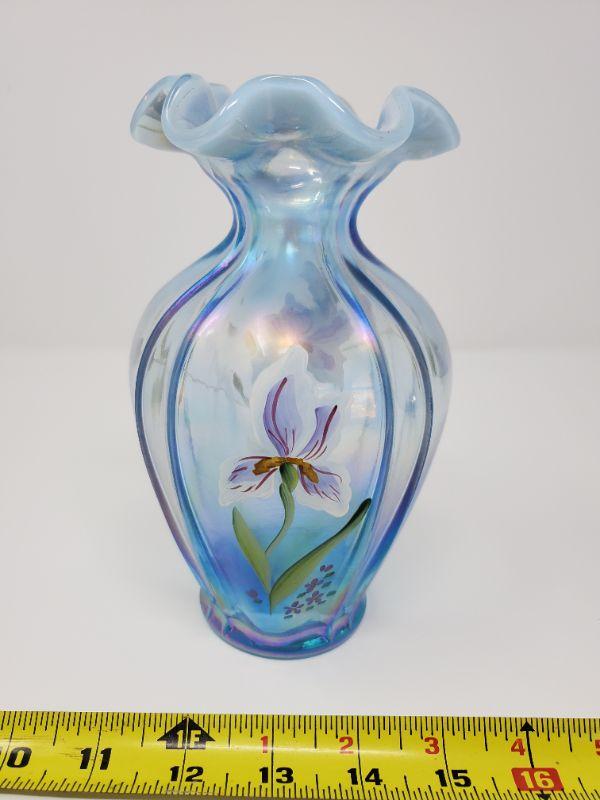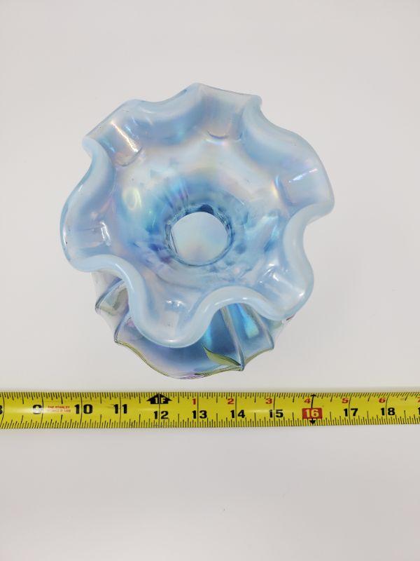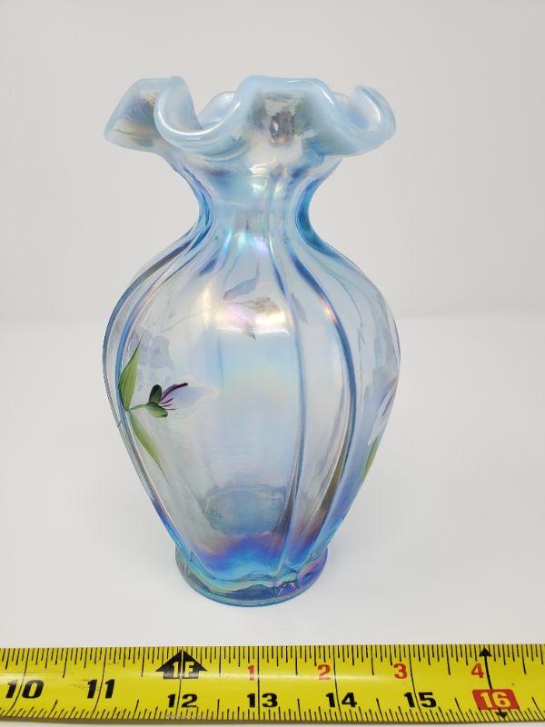 Fenton hand painted blue iridescent glass vase is stunning with a ruffled edge and perfect for spring flowers! Approximately 7in tall and in good condition.