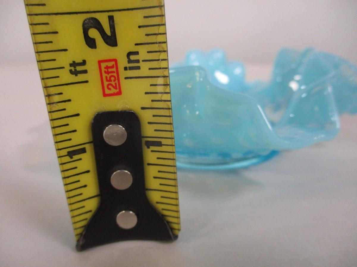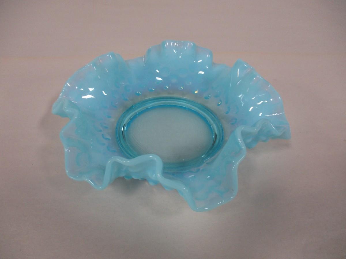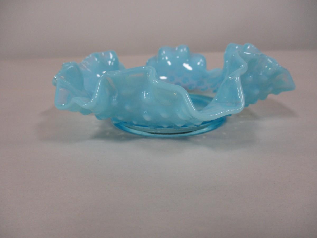 Fenton Blue Opalescent Hobnail Ruffled Glass Dish