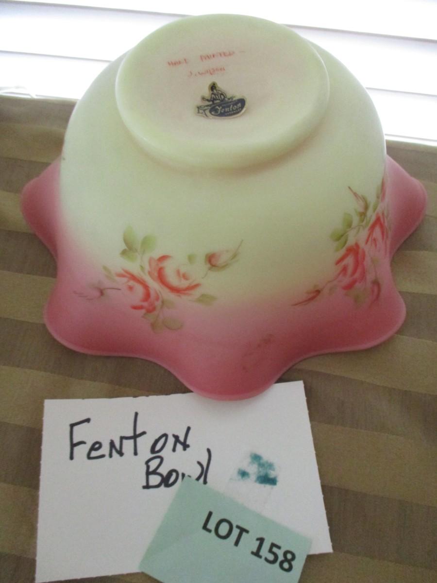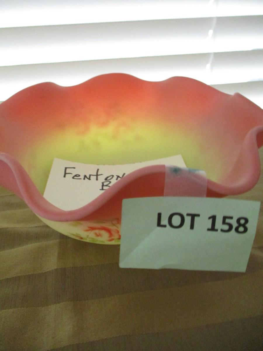 9 1/2" Fenton art glass ruffled bowl. Hand Painted w/roses
