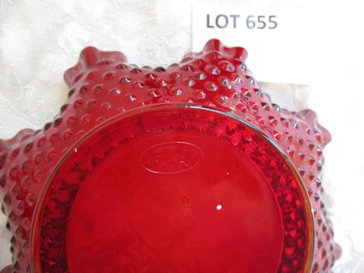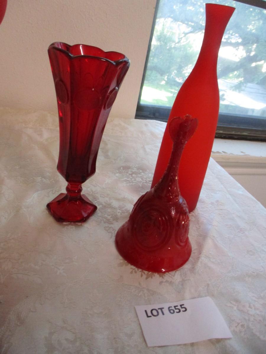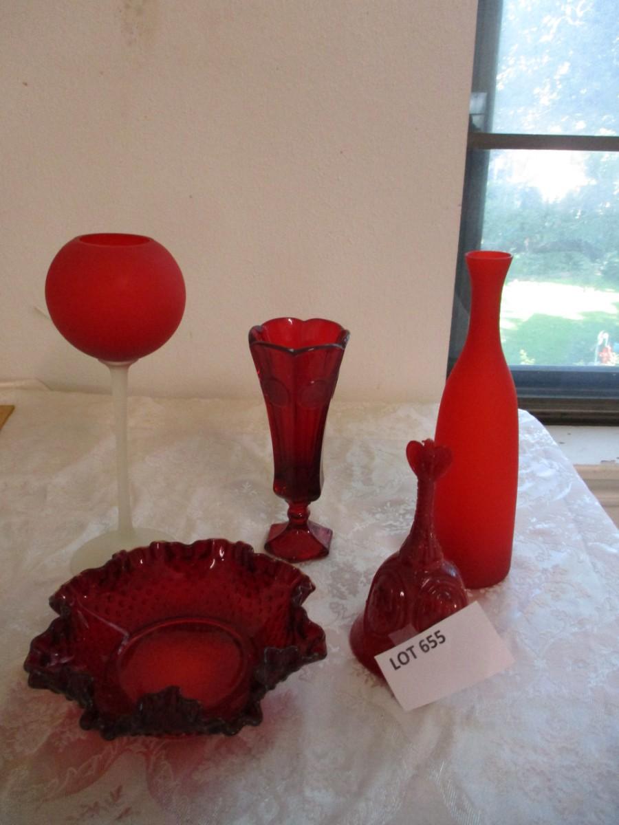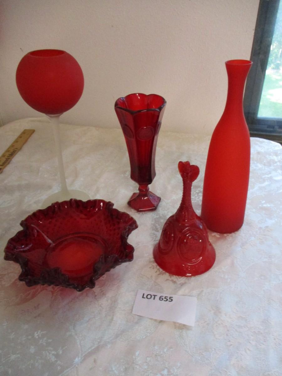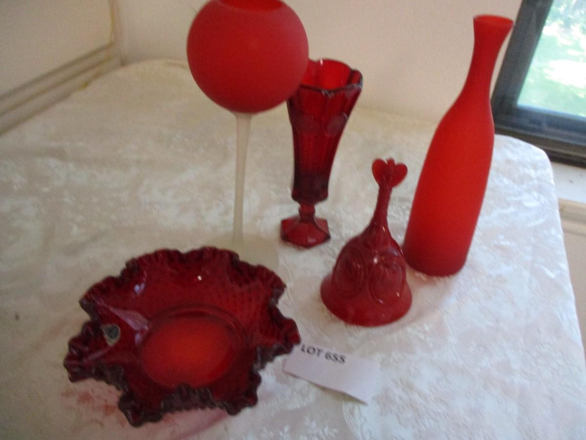 Fenton Hobnail ruby dish. Fostoria ruby bell. Glass chalice. Red bottle